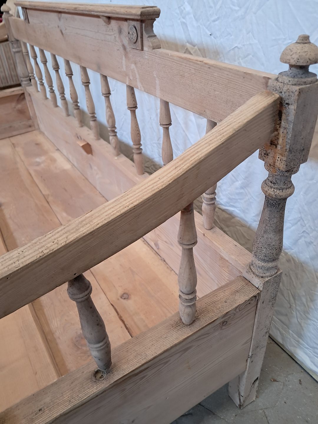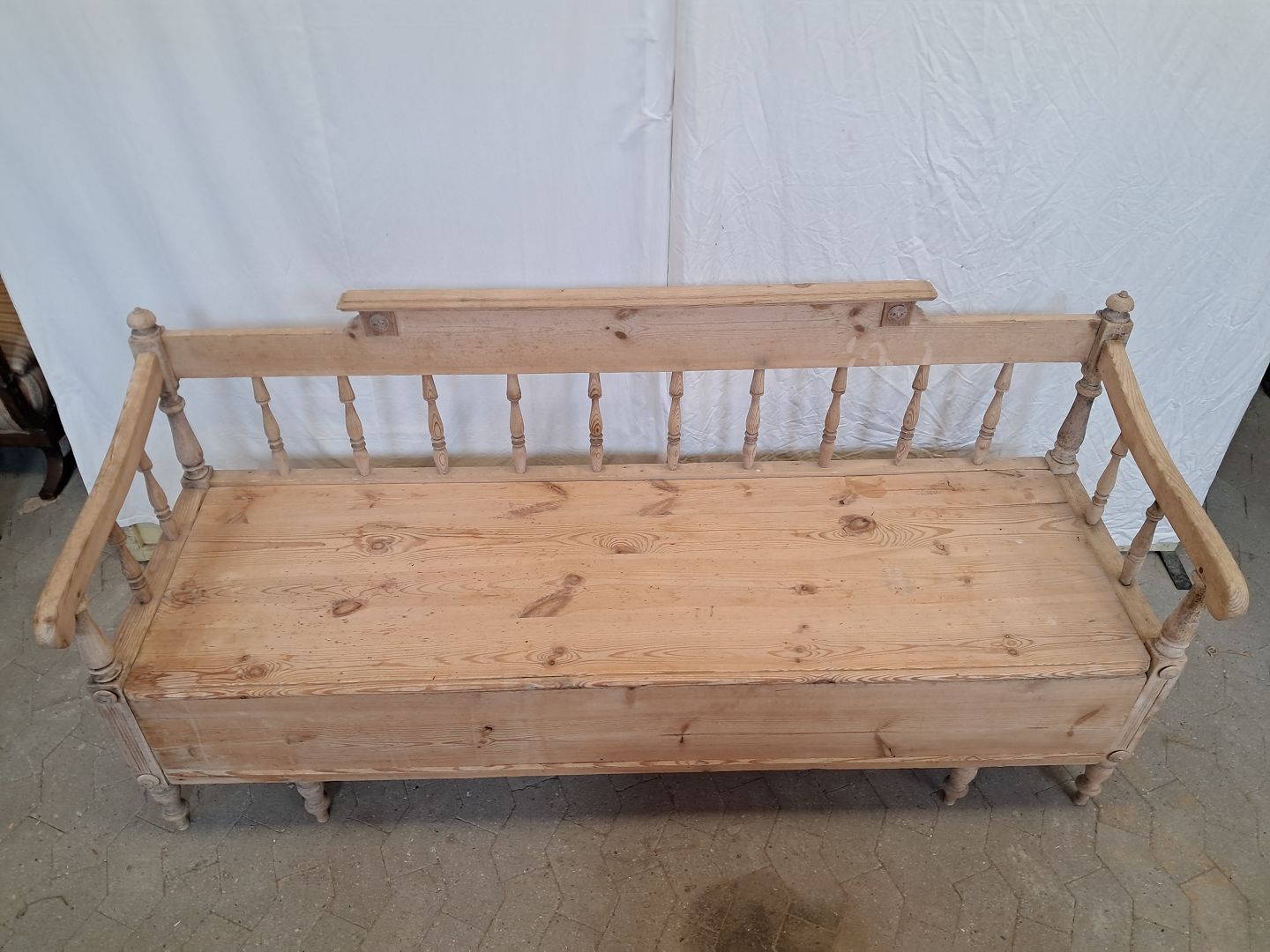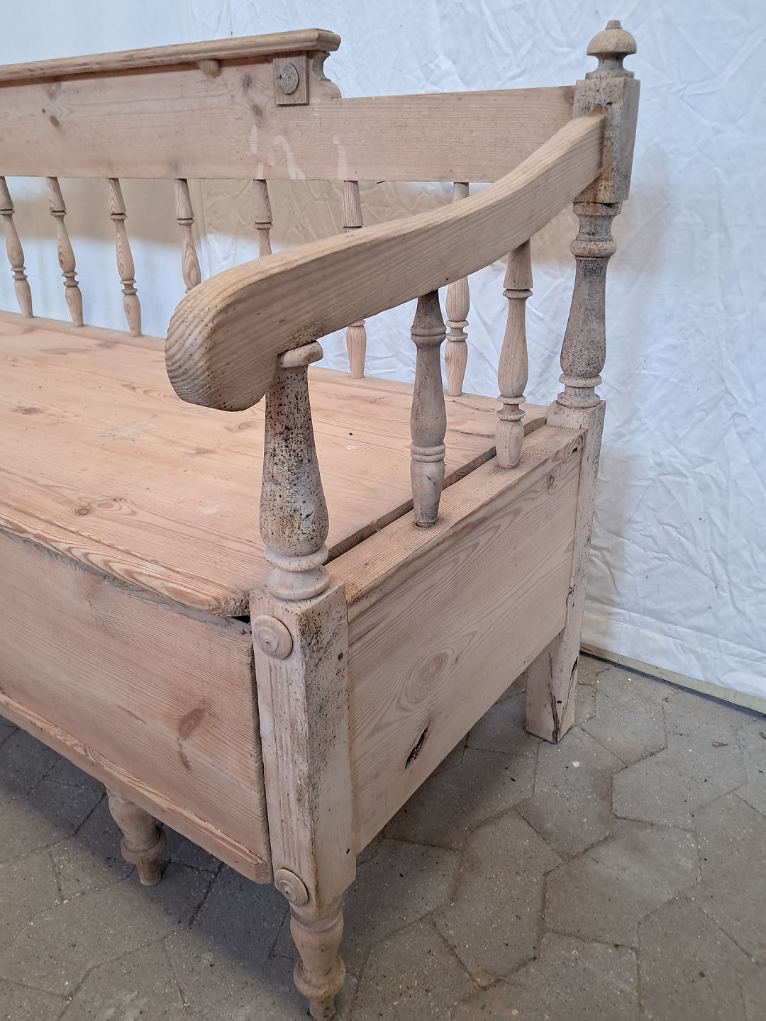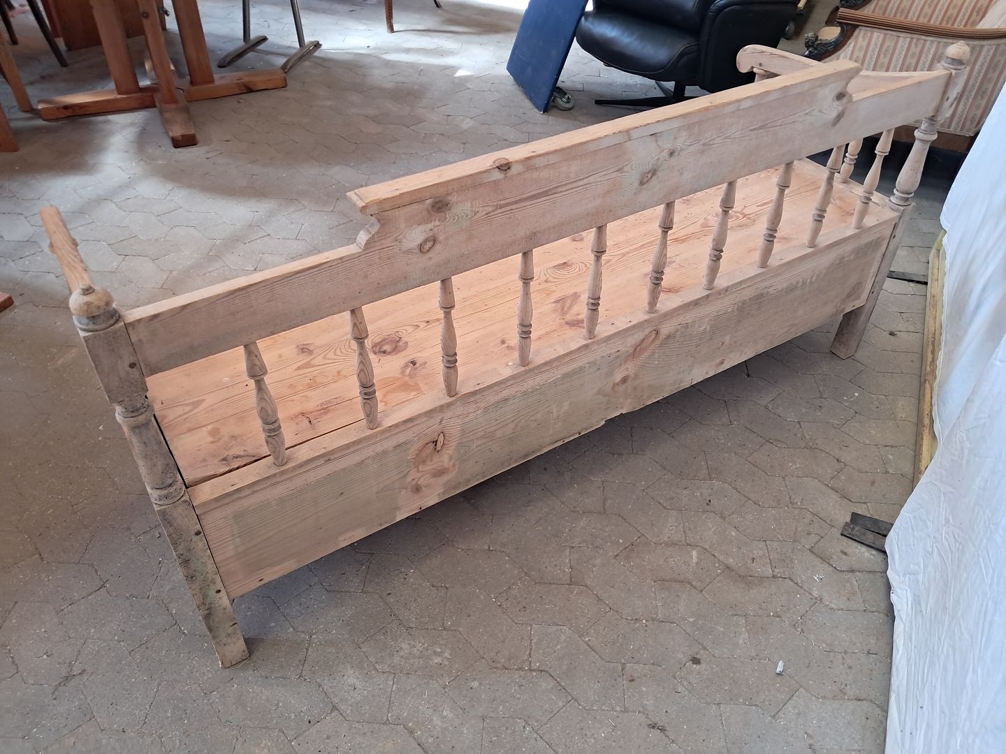 Slagbænk i massivt fyrretræ, fra 1910erne.Den har brugsspor og defekt armlæn.(se foto)