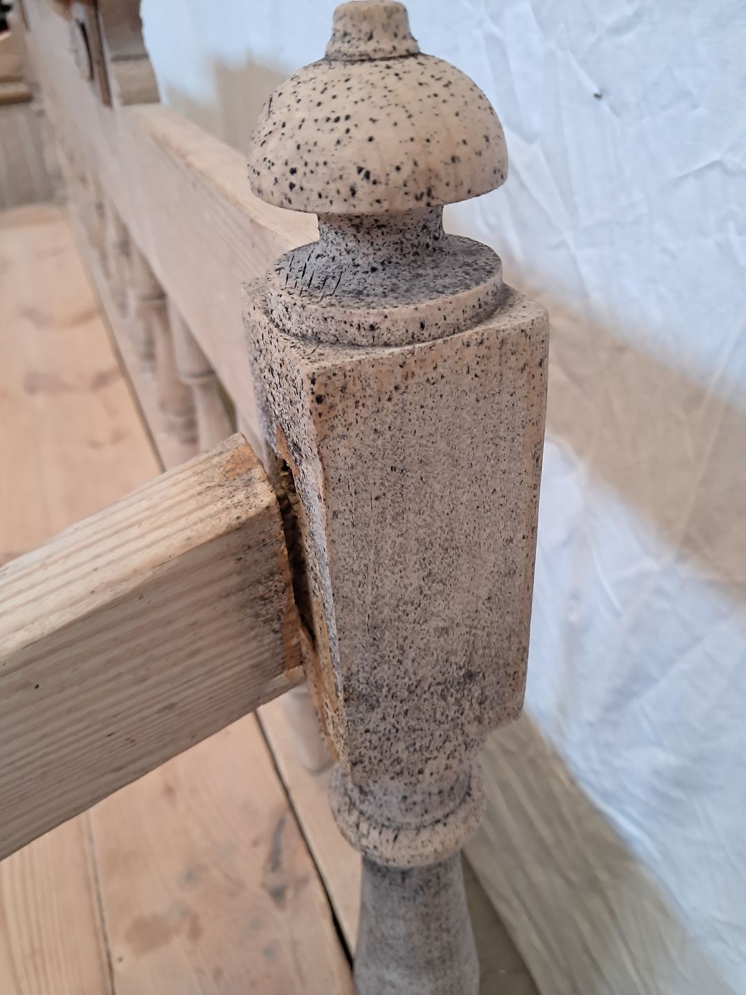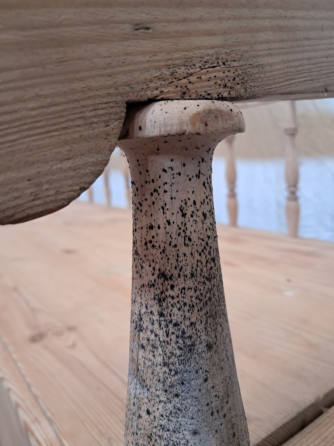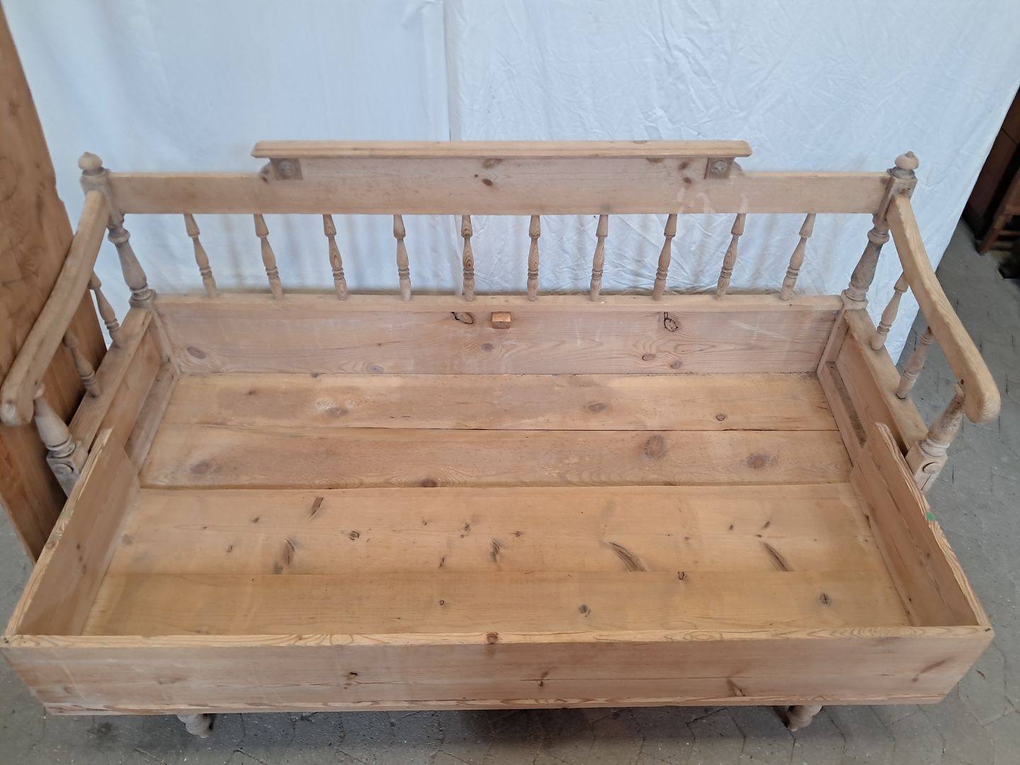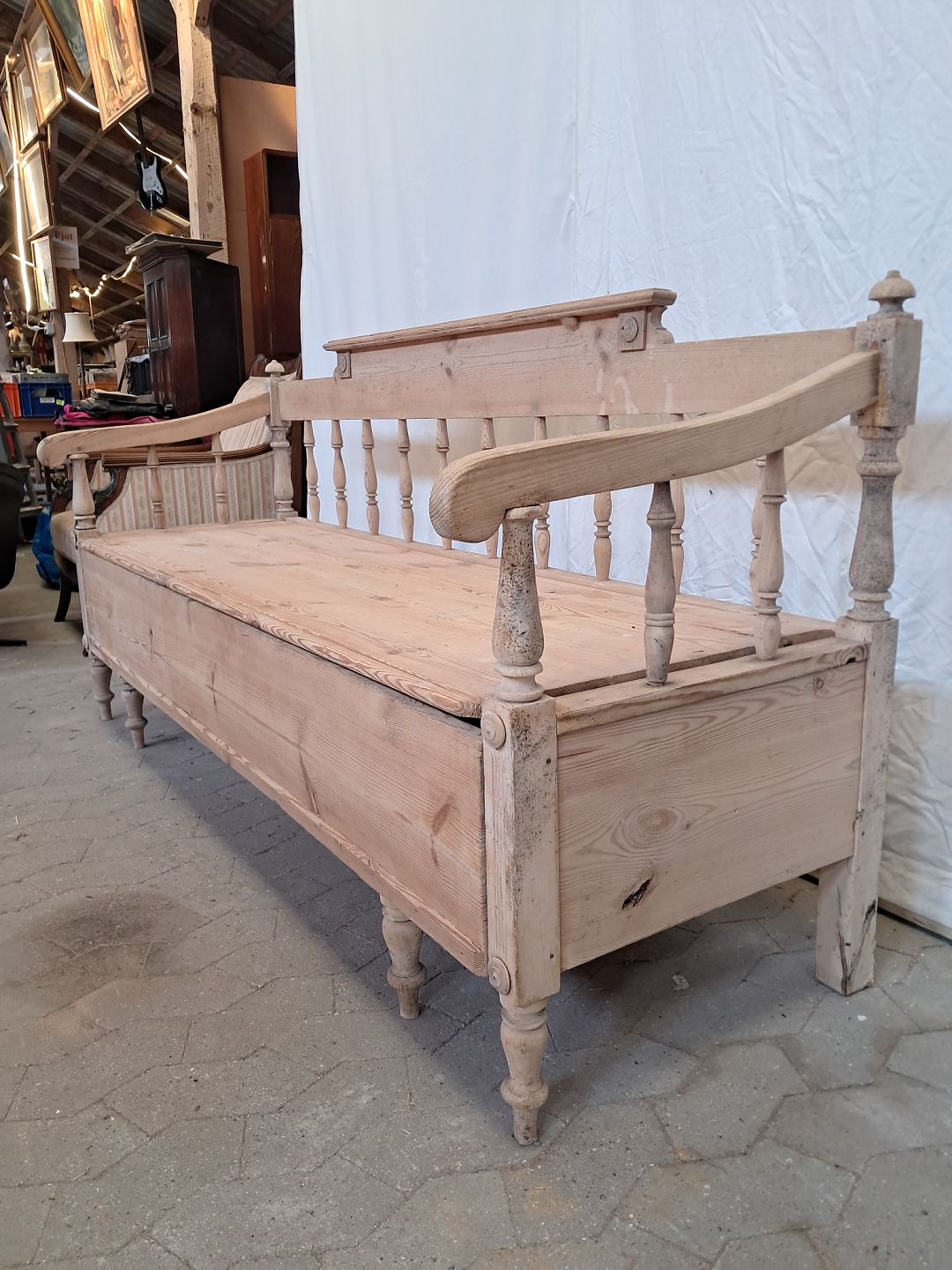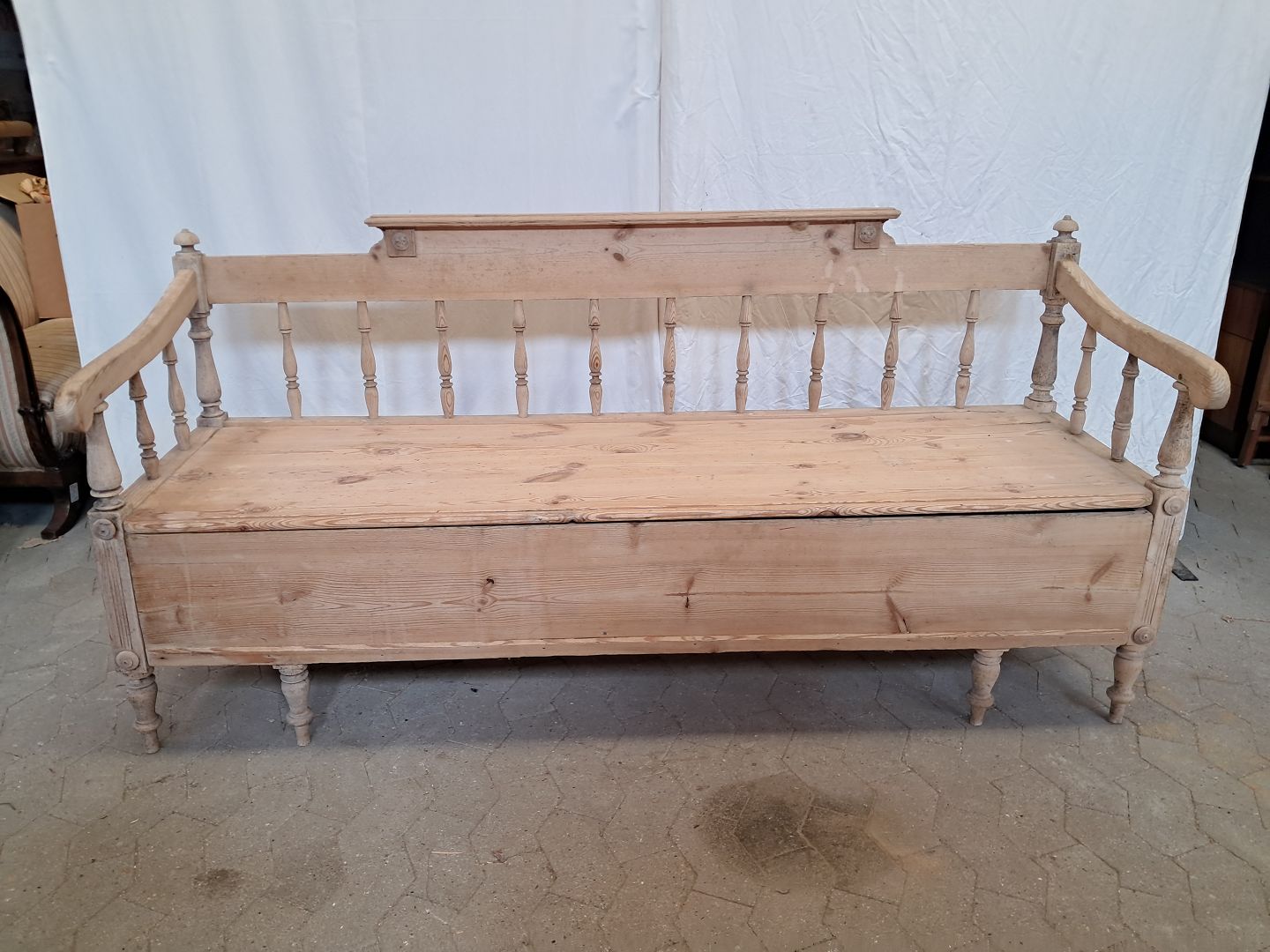 Slagbænk i massivt fyrretræ, fra 1910erne.Den har brugsspor og defekt armlæn.(se foto)