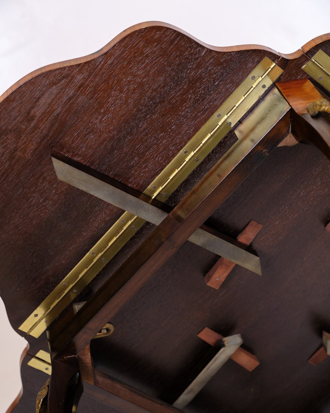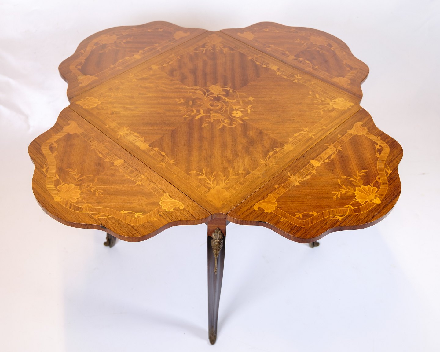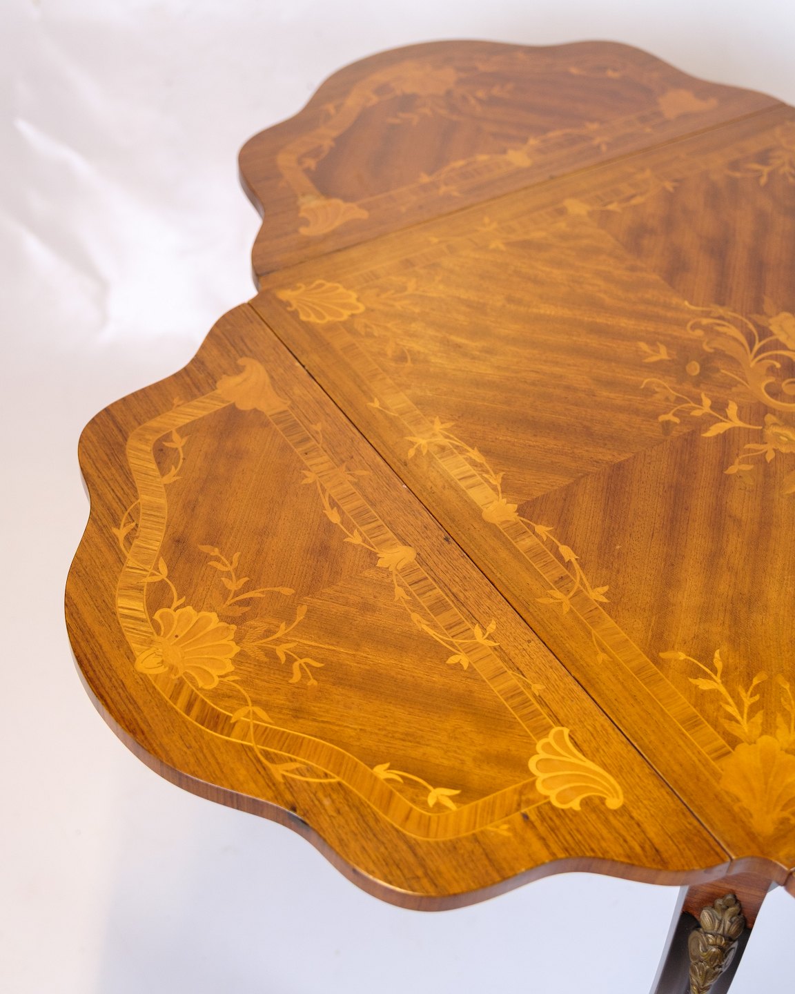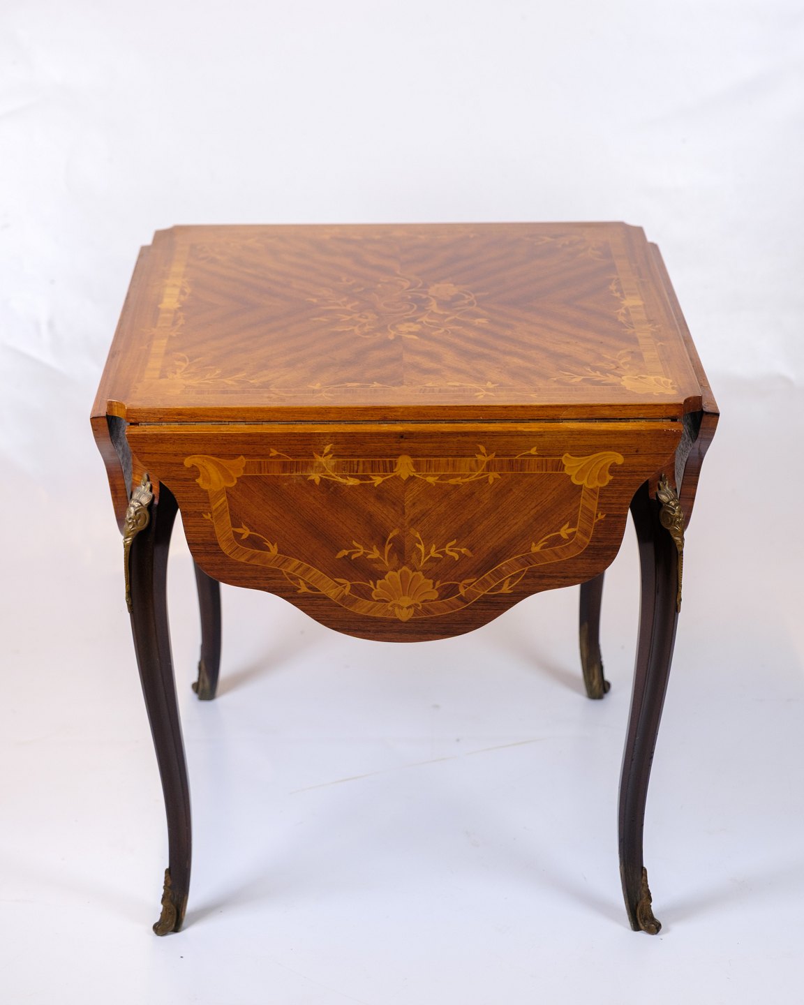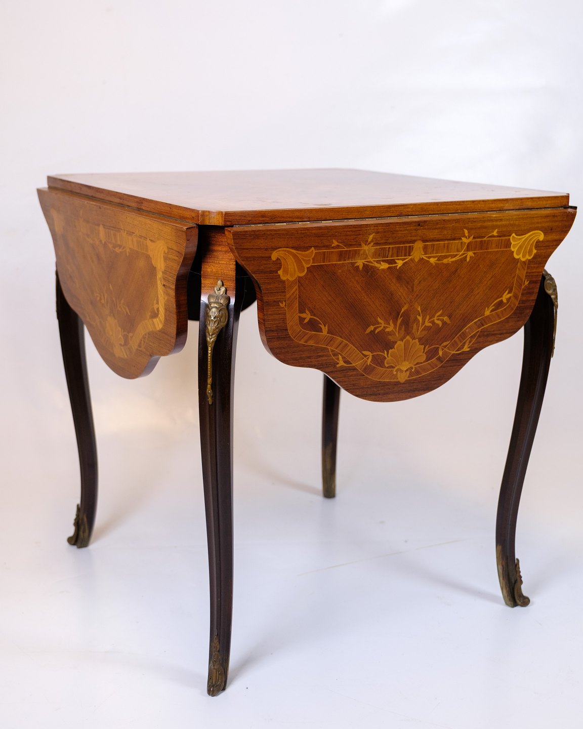 Antiker Sofa- oder Beistelltisch im Rokoko-Stil aus der Zeit um 1900. Der Tisch besteht aus Mahagoni mit schönen Intarsien aus Palisander. Er ist mit vier 23 cm breiten Klappen ausgestattet, die ausgeklappt werden können, sodass der Tisch einen Durchmesser von 100 cm erreicht.Stil: Rokoko