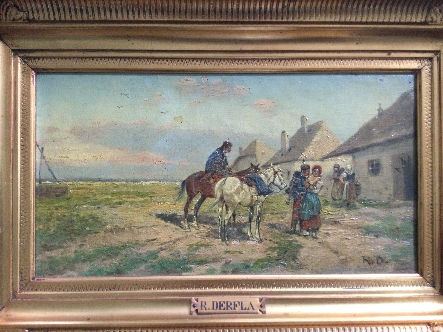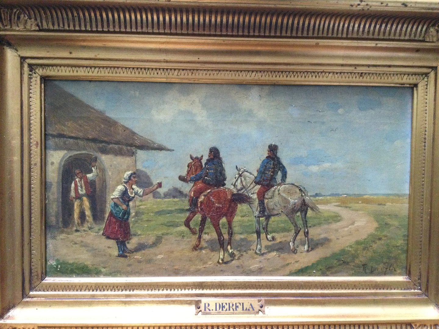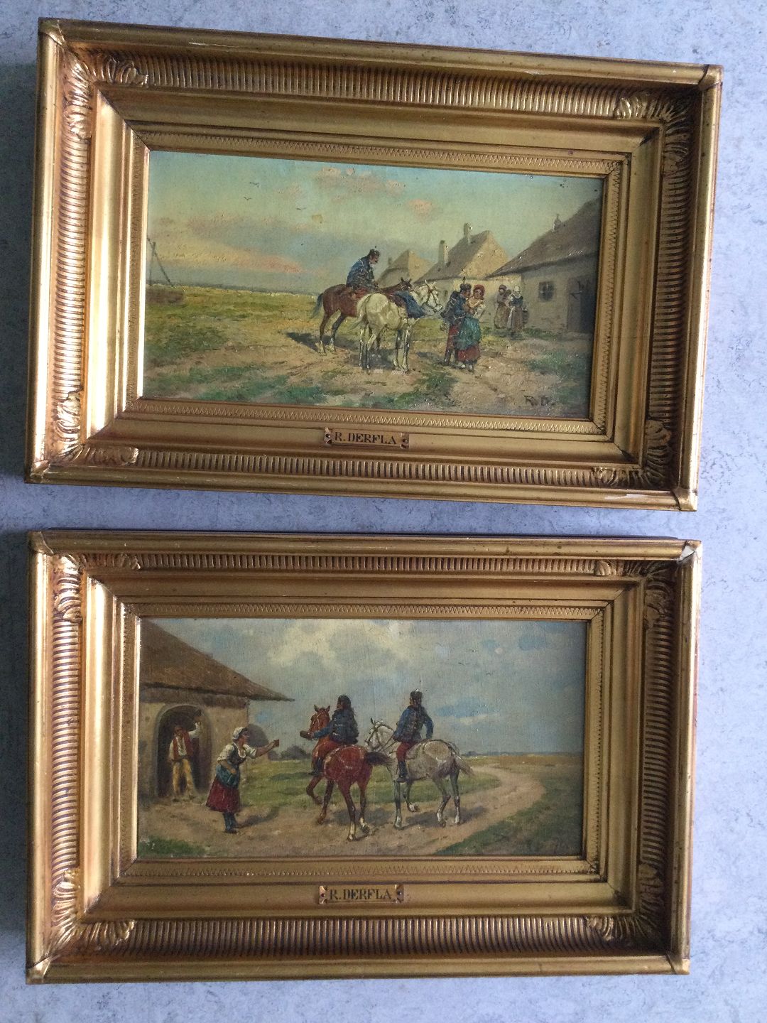 Anton Rudolf Derfla (født 1849):2 malerier med Bosniske Husarer på stop ved huse på vejen.
