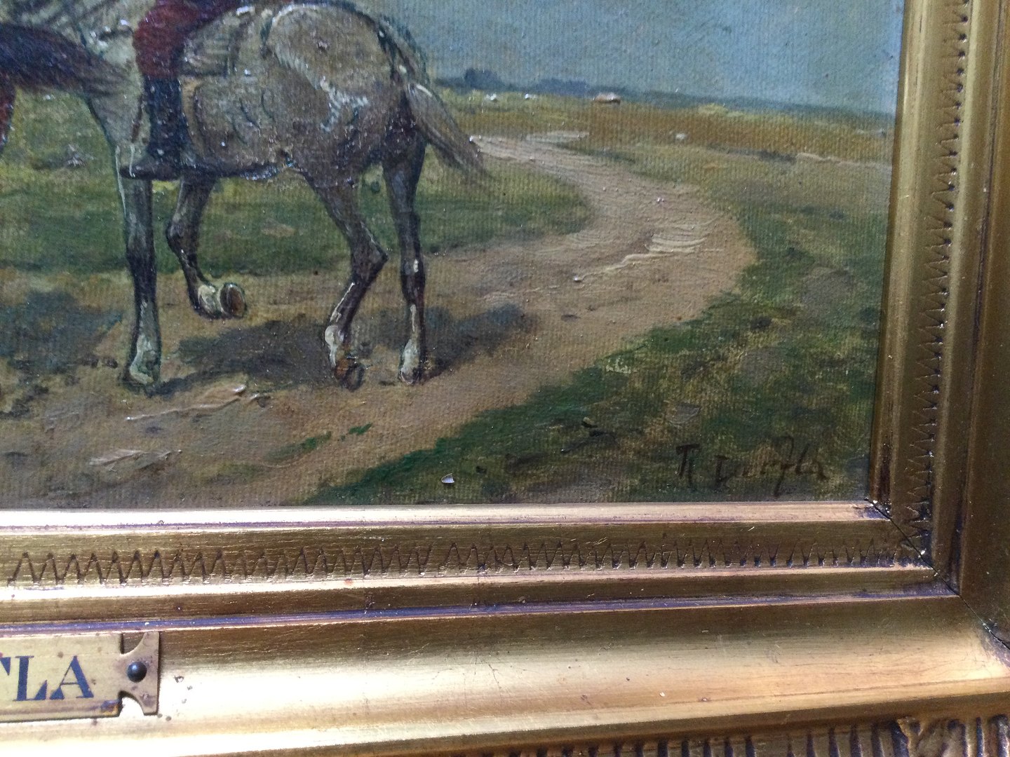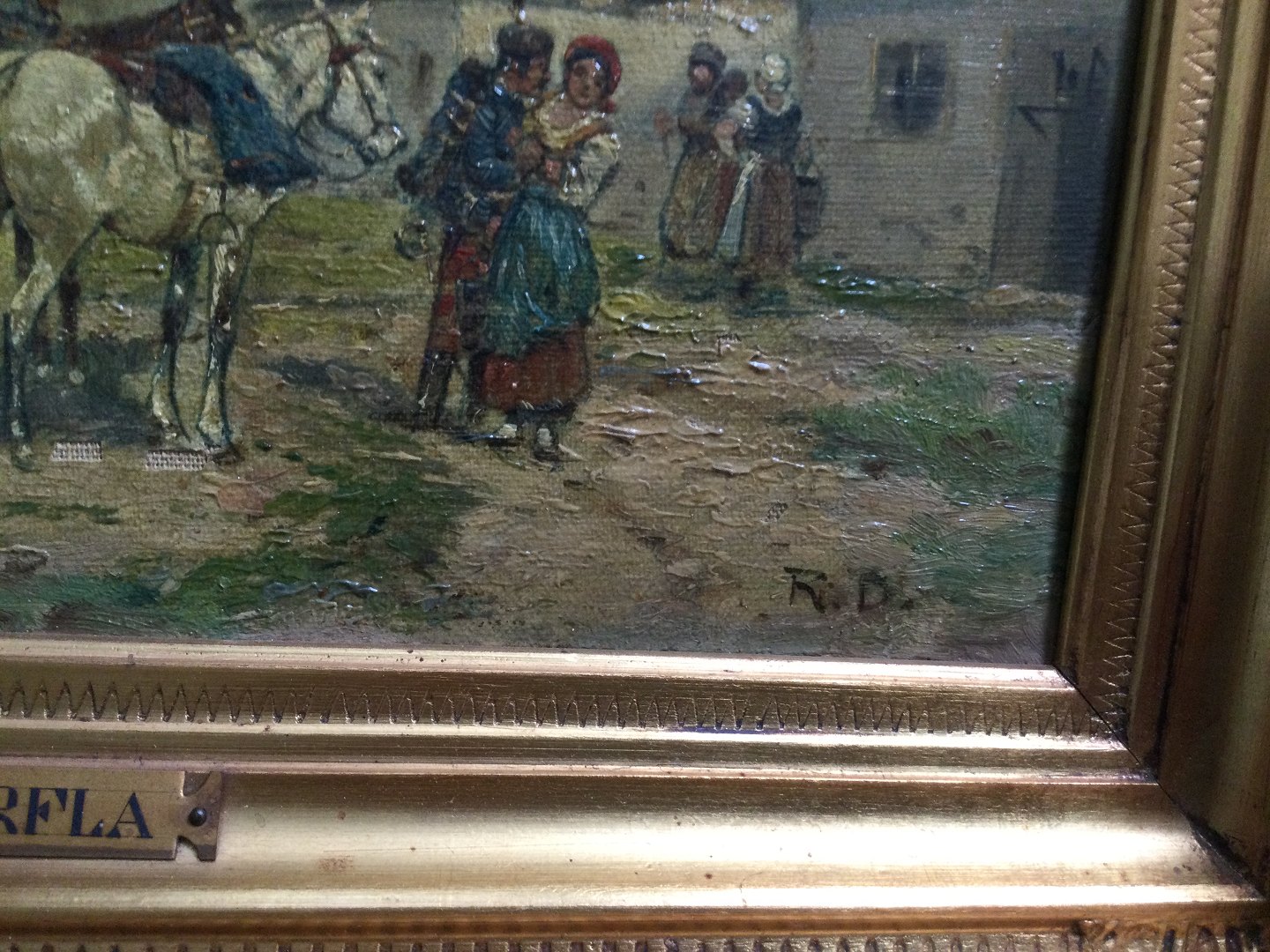 2 Malerier ad Anton Rudolf Derfla - Bosniske husarer på stop ved huse på vejen,