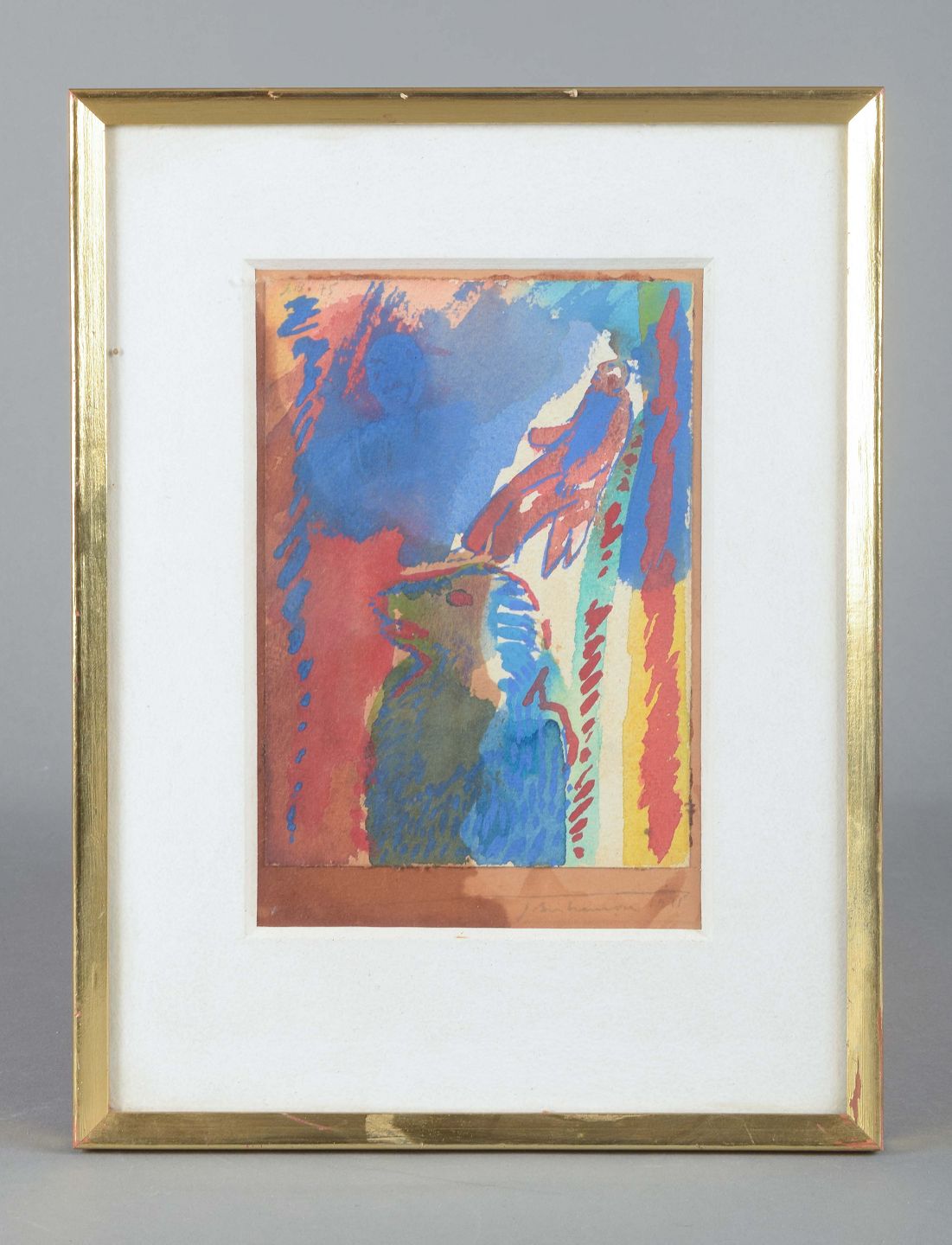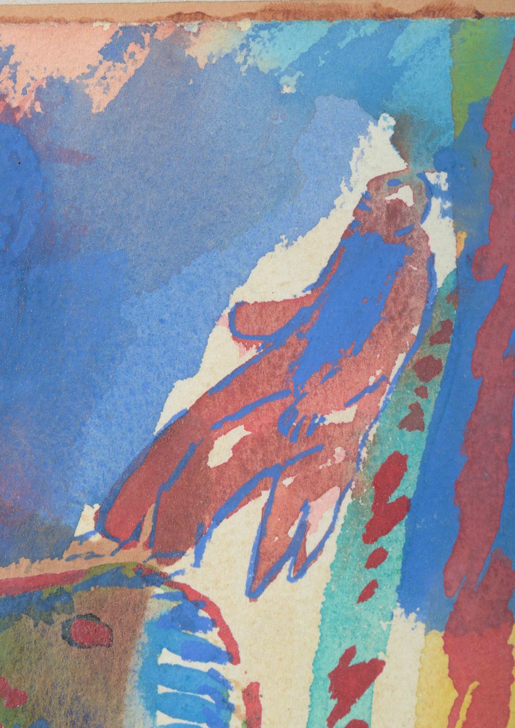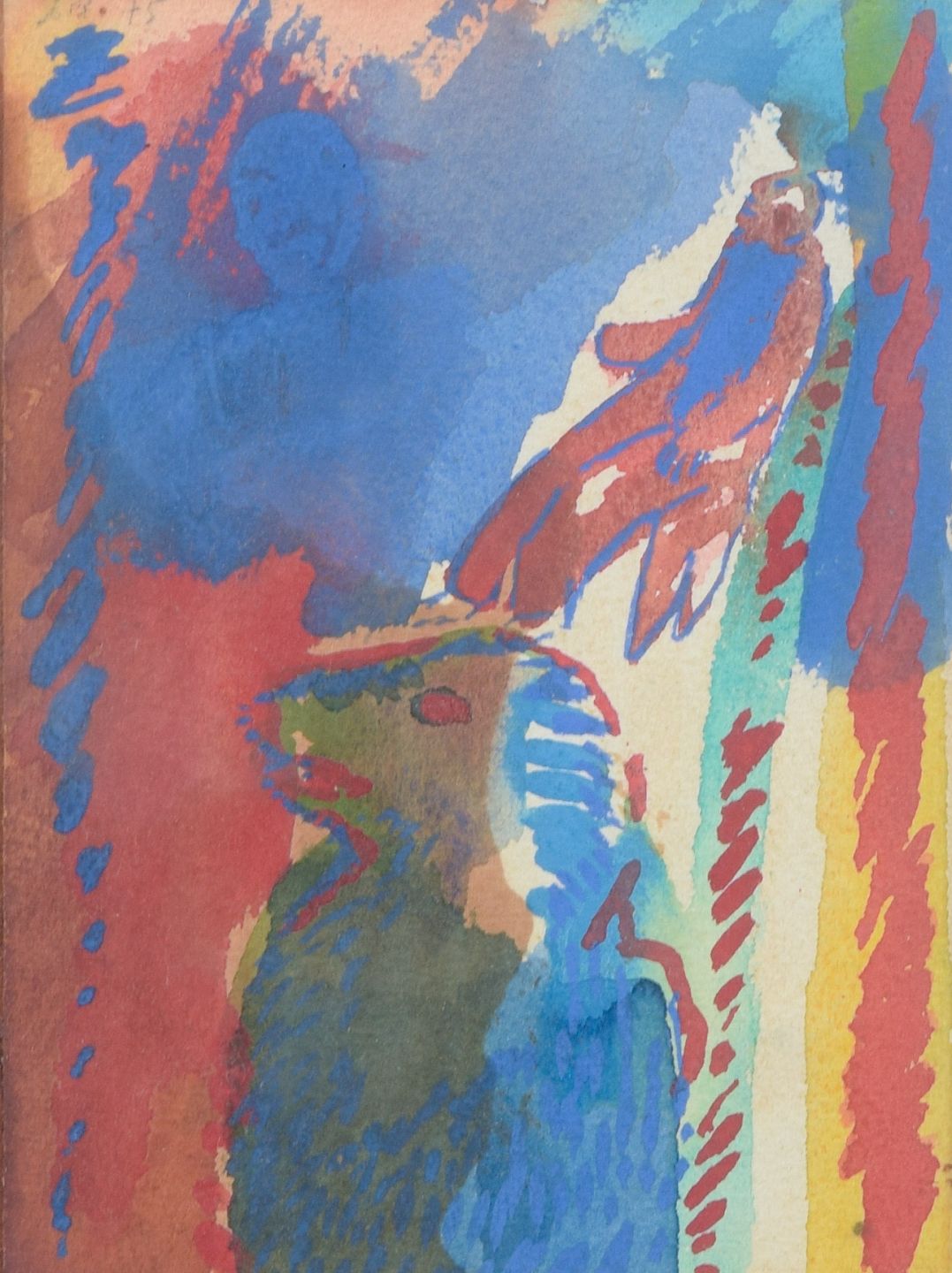 Et farvestærkt og drømmende motiv, hvor figurative antydninger og abstrakte former smelter sammen. Værket balancerer mellem spontanitet og kontrol: blå og grønne penselstrøg synes at danne menneskelige skikkelser, mens røde og rosa toner åbner billedfladen mod et fuglemotiv i højre side. Den kompositoriske opdeling og det lyriske farvespil gør værket til et karakteristisk eksempel på Birkemoses billedsprog fra midten af 1970’erne.