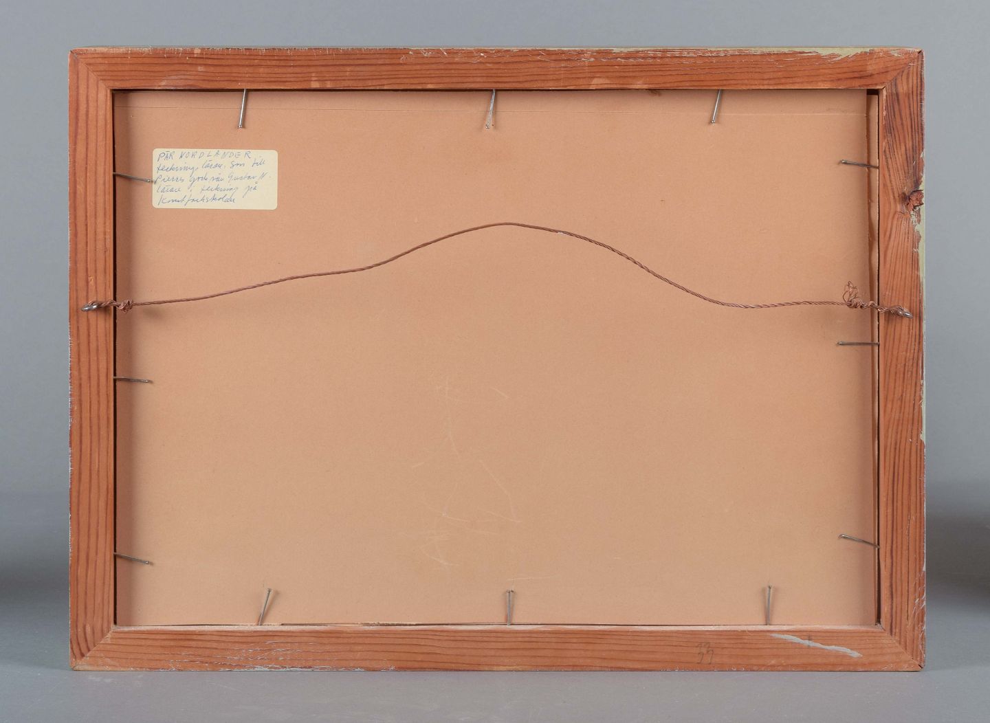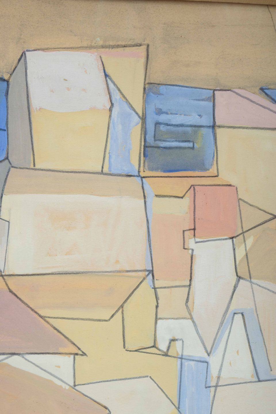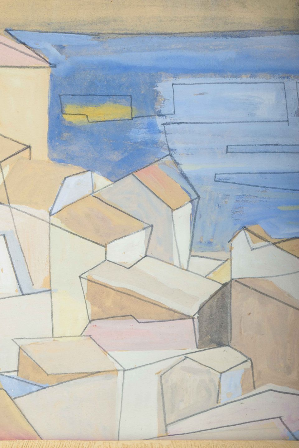 Pär Nordlander (1920–2001). Abstrakt bylandskab ved havet.Mixed media på papir.