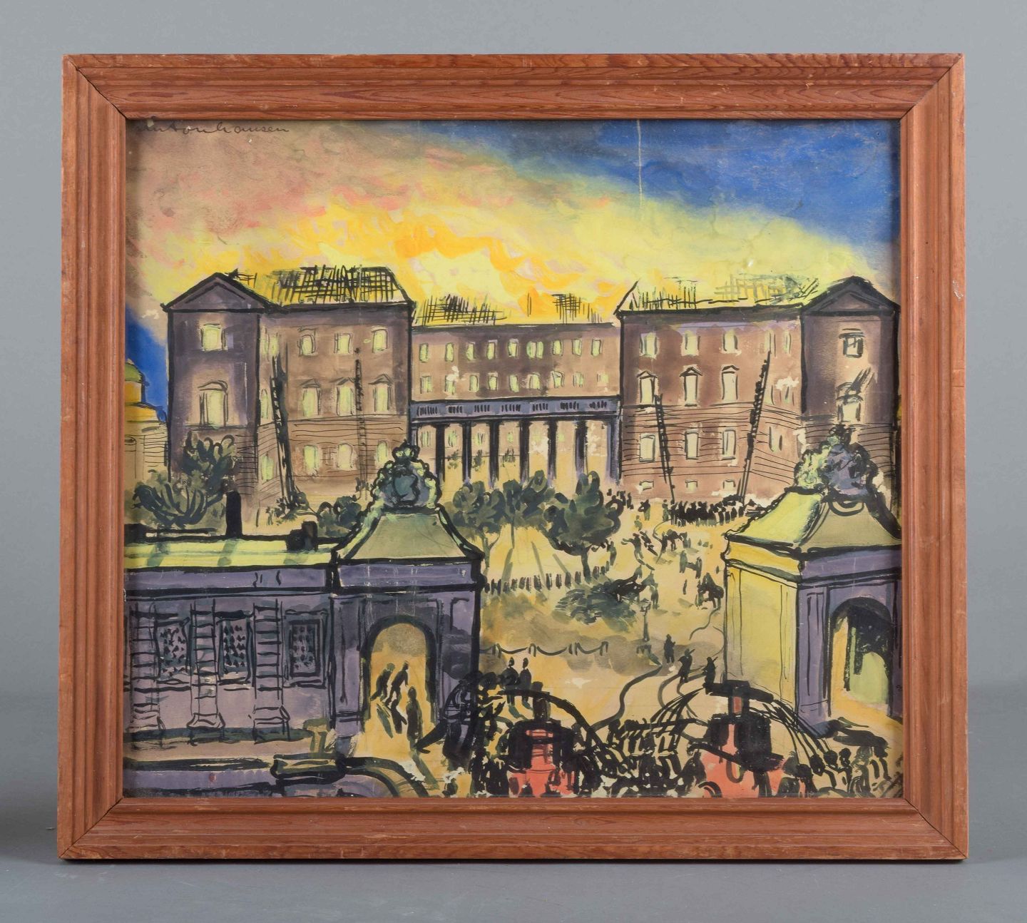 An expressive work in which Anton Hansen depicts the dramatic fire at Christiansborg Palace in 1884. With rapid brushstrokes and a glowing sky, he captures both the historic catastrophe and the crowd of onlookers gathered in the palace square.
