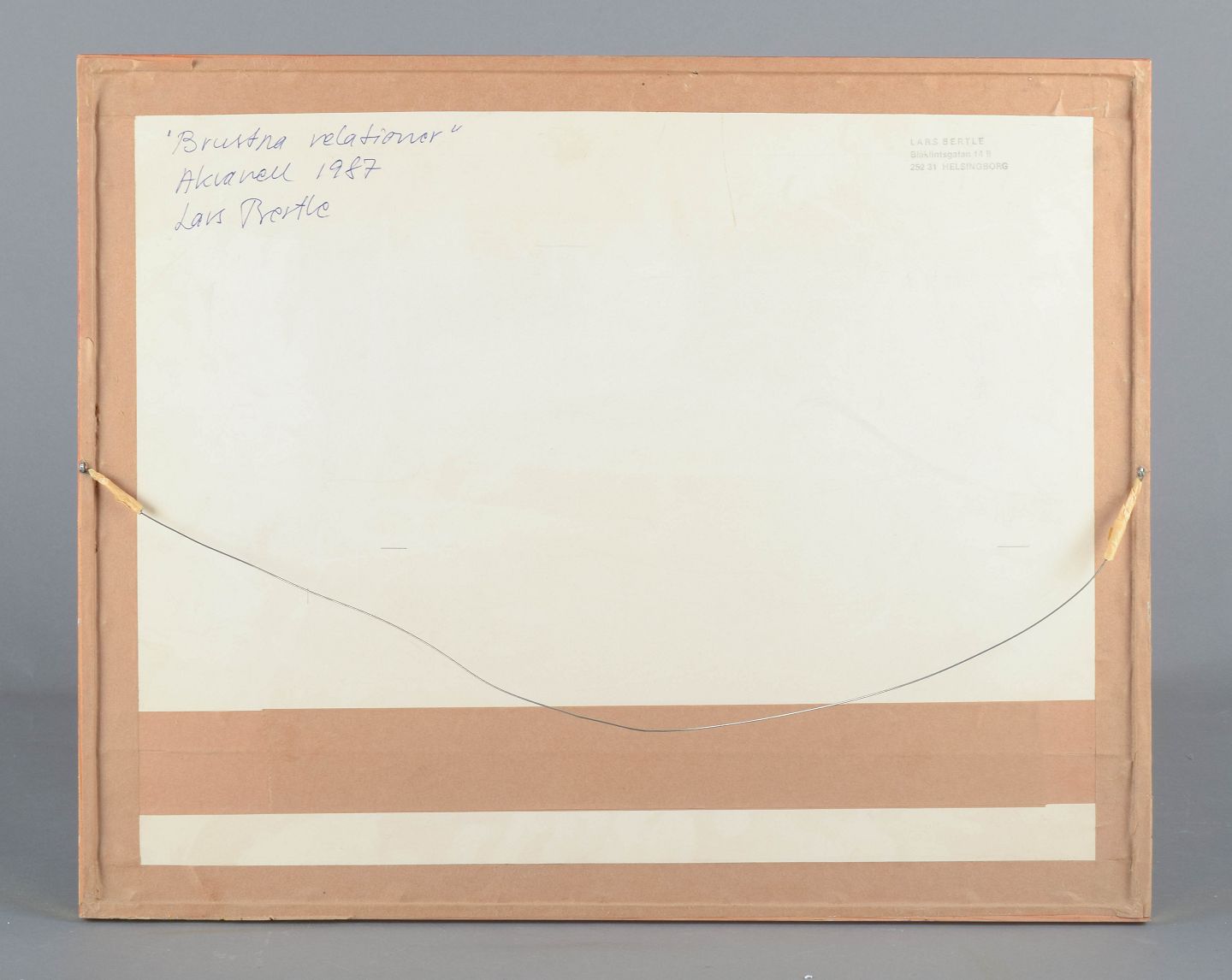 En ekspressiv akvarel af Lars Bertle, hvor intense røde og dybe violette toner danner en følelsesladet abstraktion. Titlen Brustna relationer understøtter værkets dramatiske og poetiske udtryk.