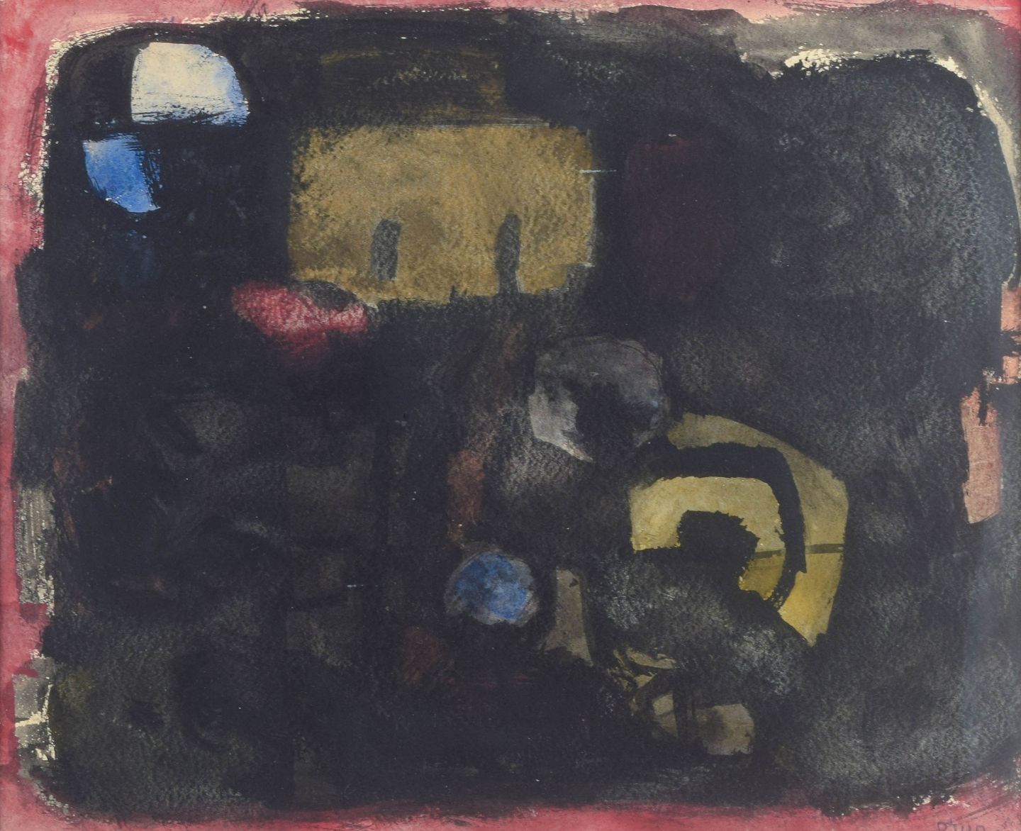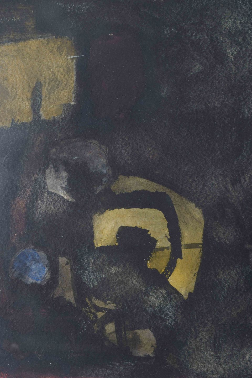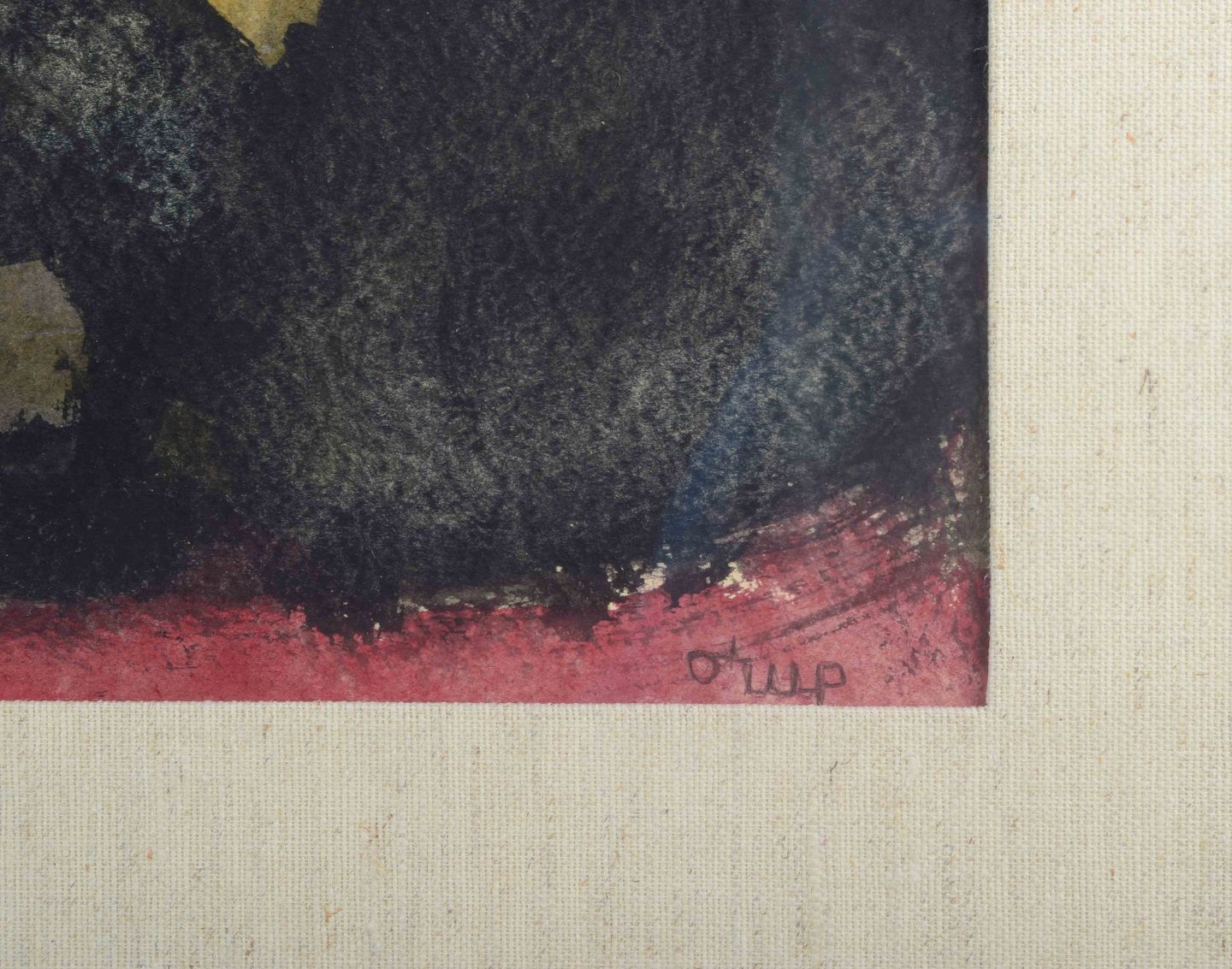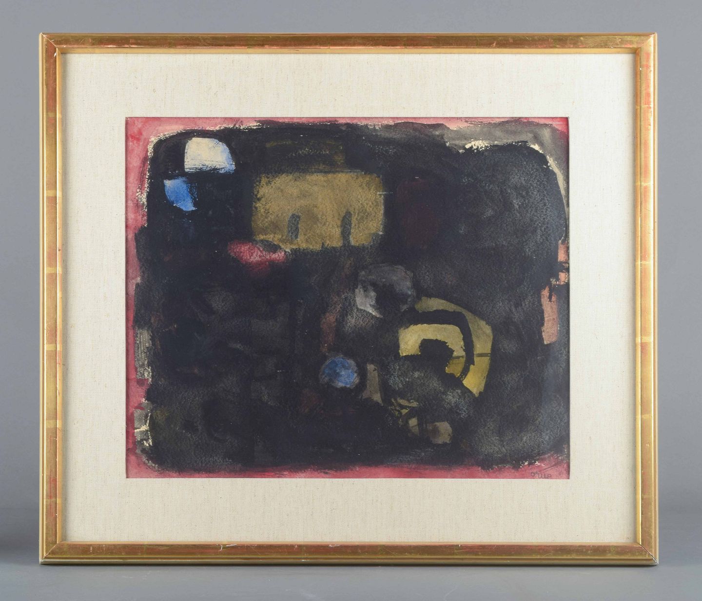 Akvarel på papir. Abstrakt komposition i mørke nuancer med indslag af blå, gul og rød. Signeret nederst til højre Orup. Indrammet i gylden træramme.
