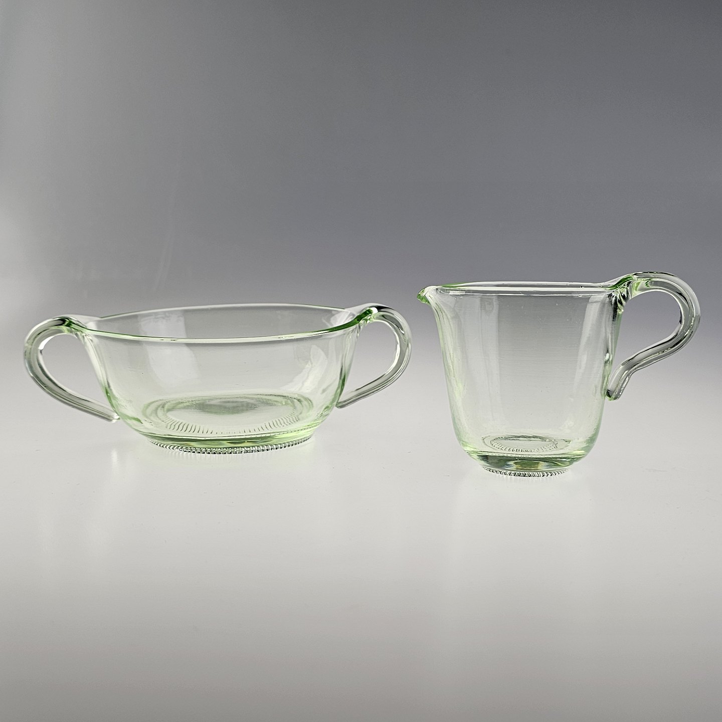 Skål med ører og flødekande af uranglasKanden har en lille luftboble i glasset