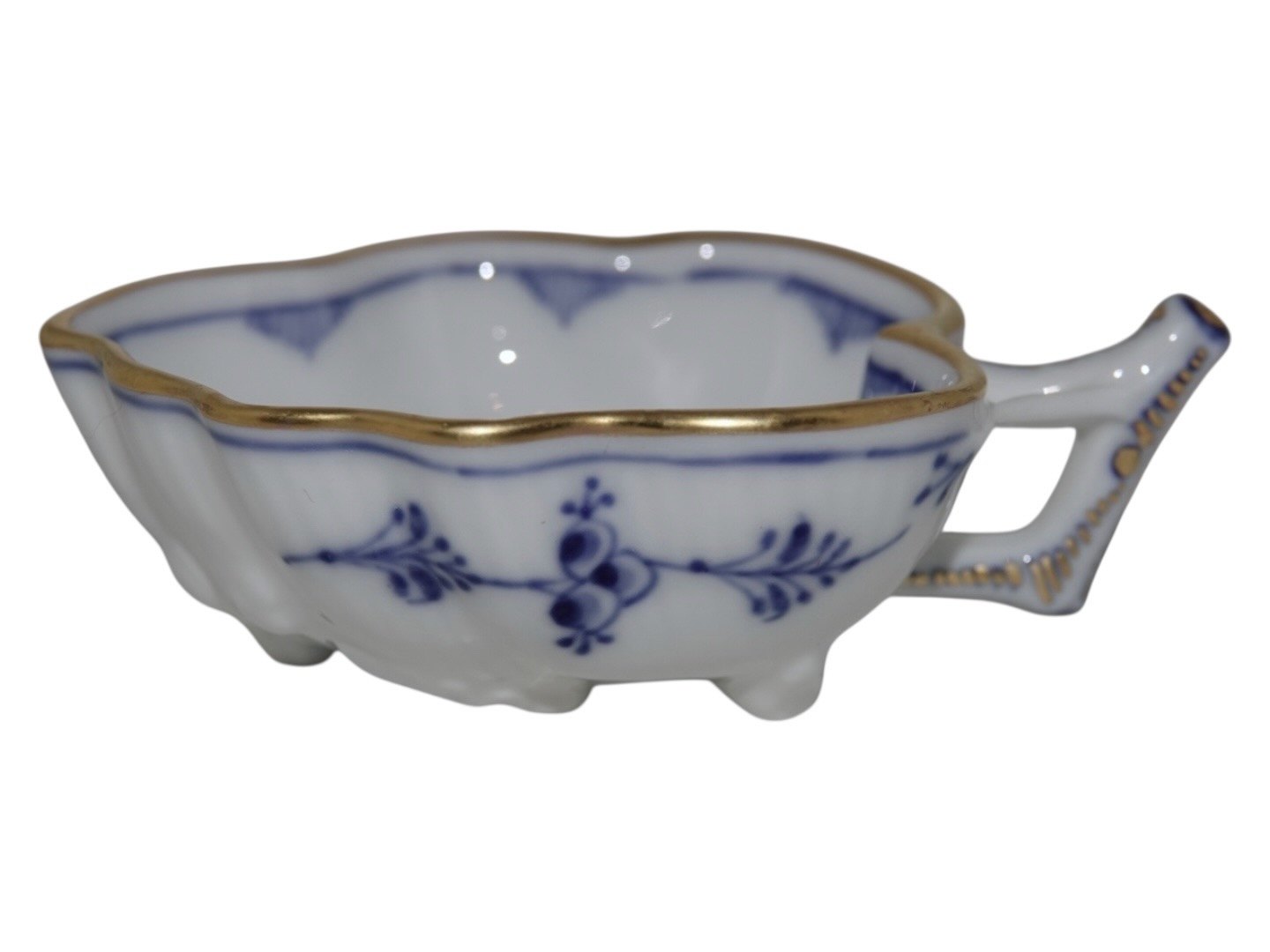 Royal Copenhagen Musselmalet Riflet med guldkant, sjælden lille skål med hank.Stemplerne viser, at denne er produceret mellem 1898 og 1923.