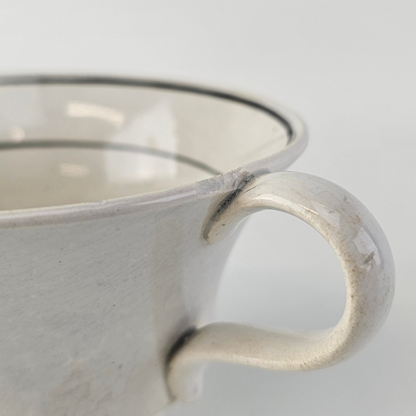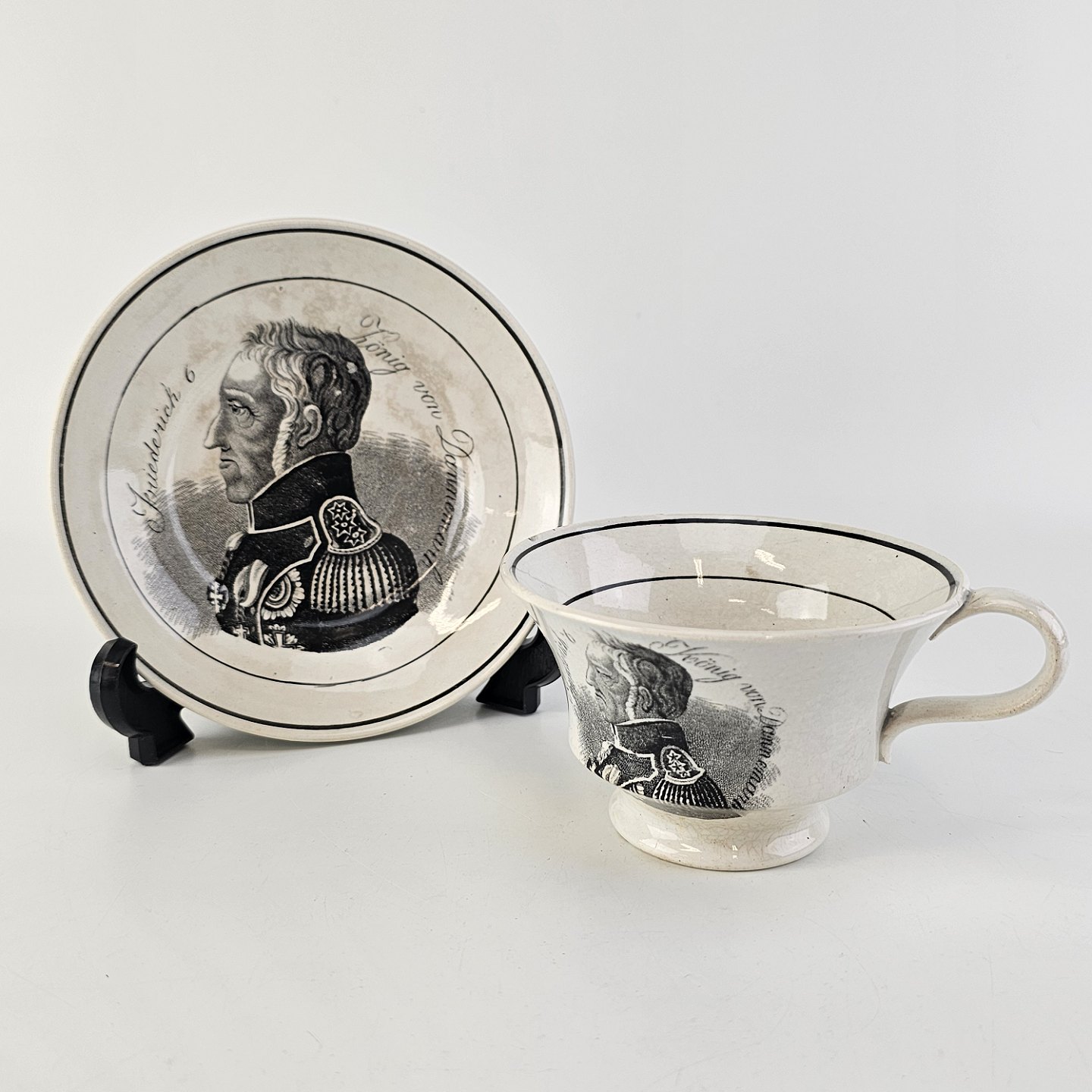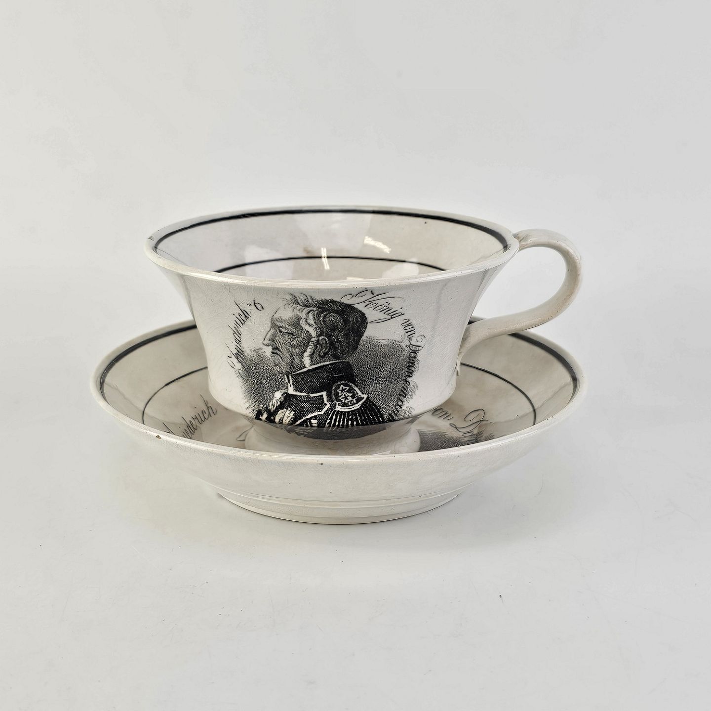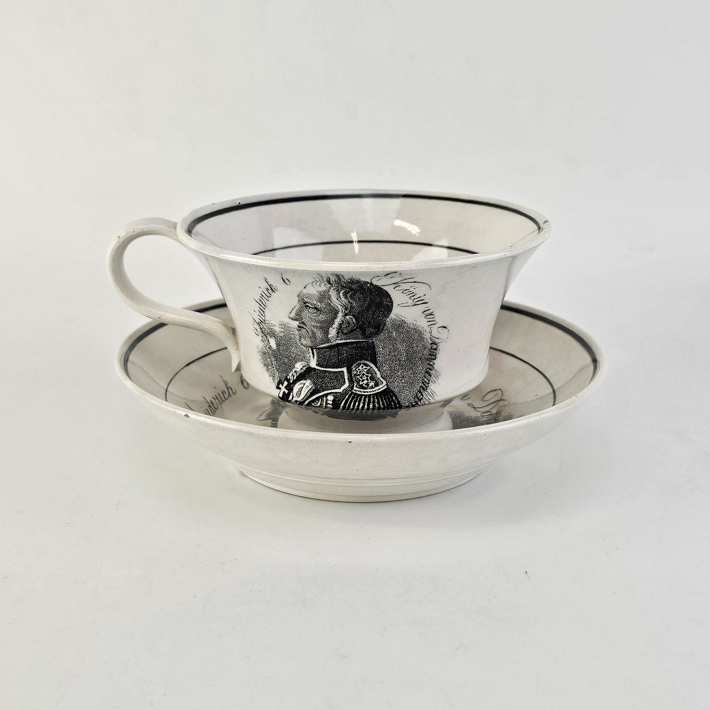 Kop og underkop af fajance med motiv af kong Frederik d. 6. af Danmark og tysk tekst. Formentlig tysk produceret til danske marked før der var en produktion i DanmarkStemplet BF4 under bunden