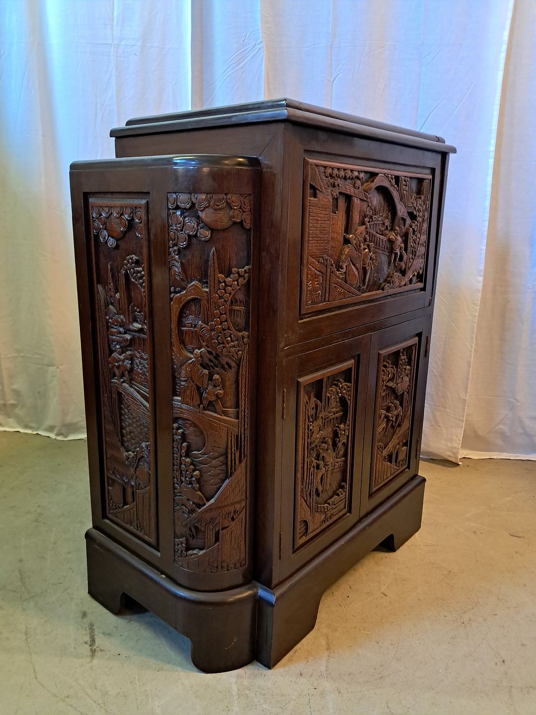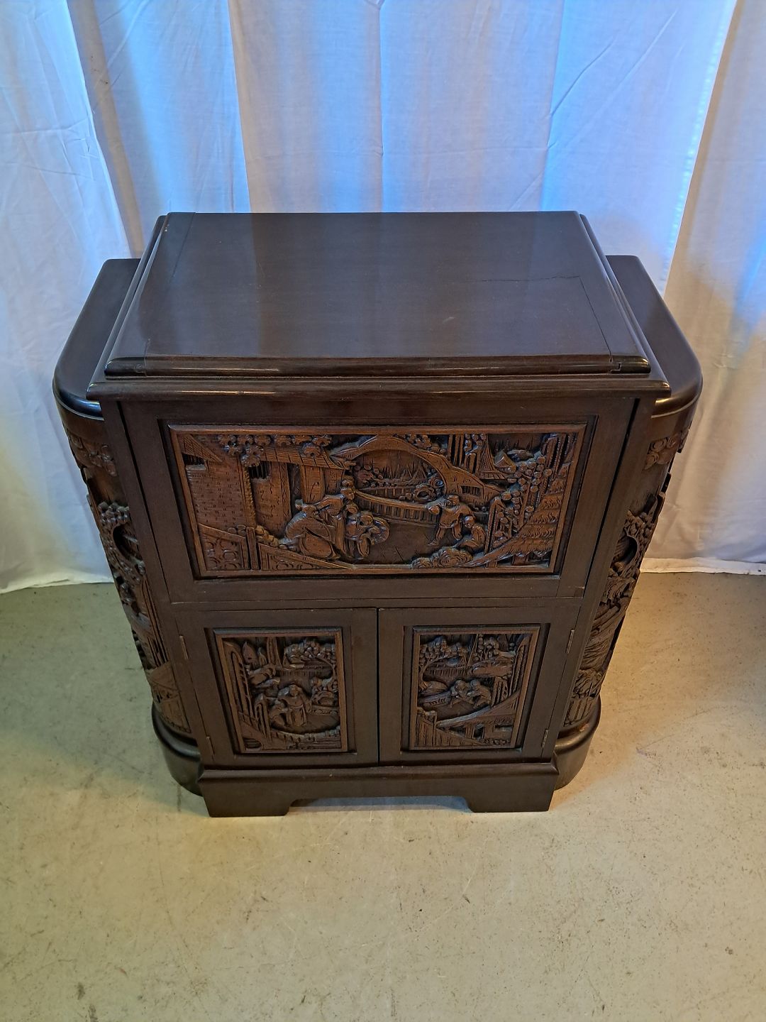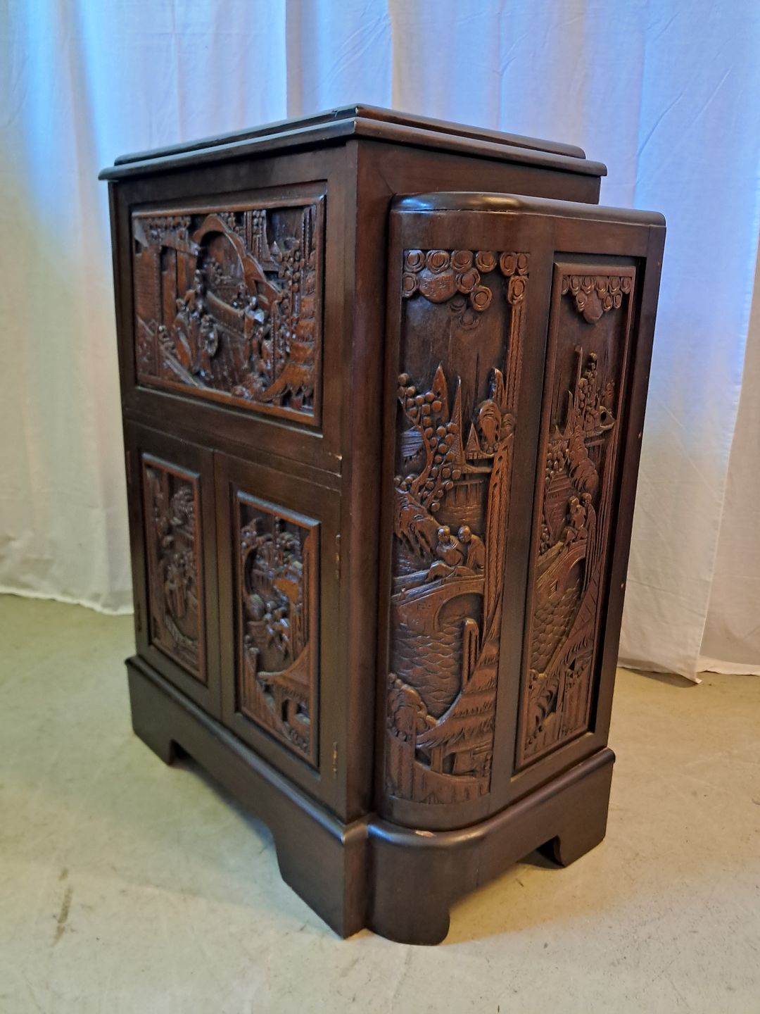 Asiatisk barskab i massivt træ, fra 1980erne.Det har brugsspor.