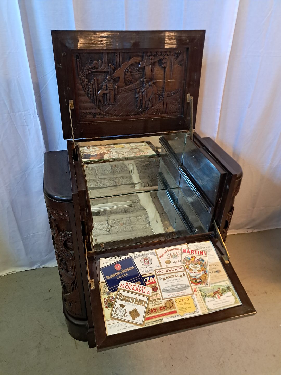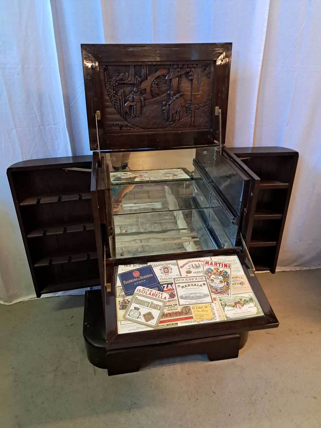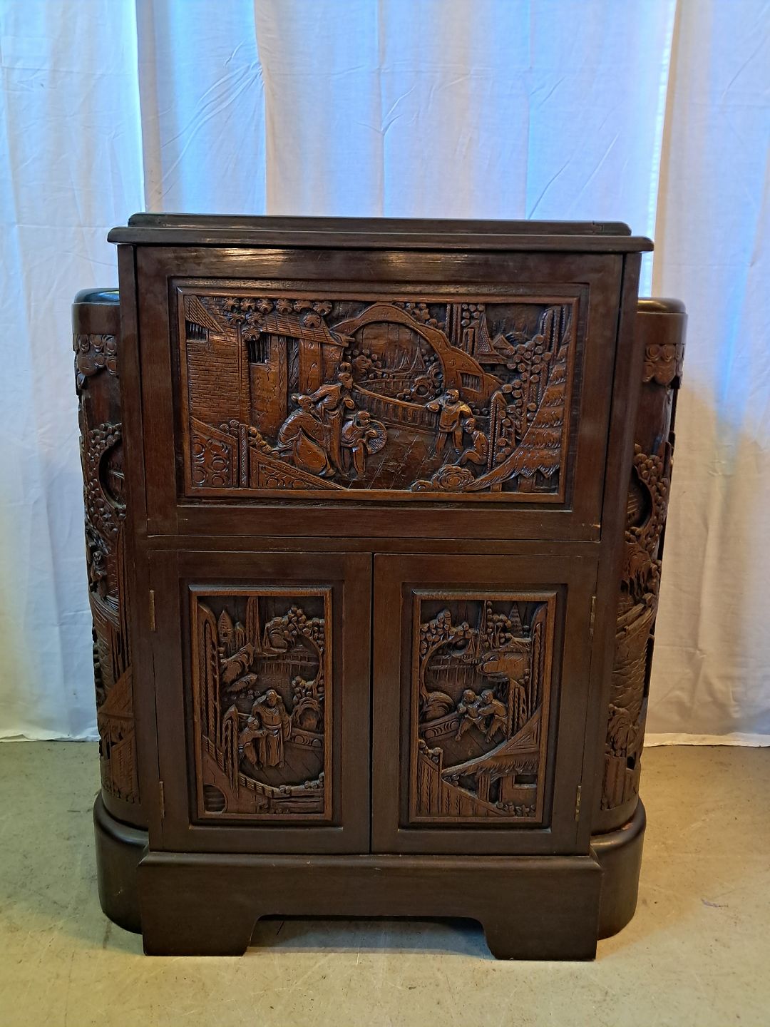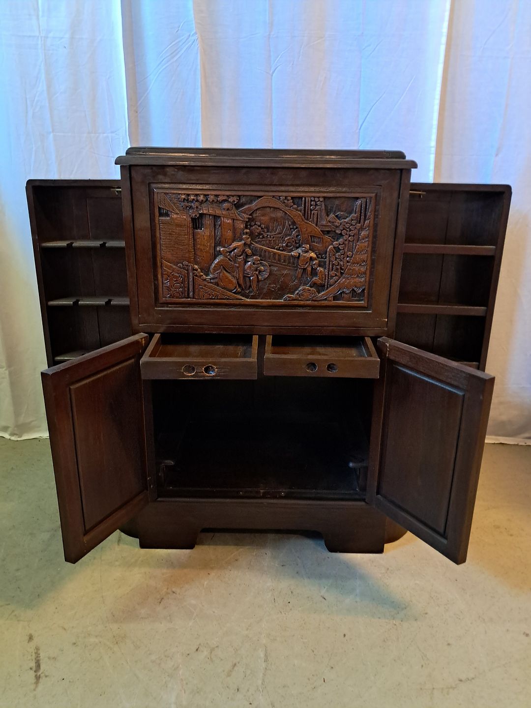 Asiatisk barskab i massivt træ, fra 1980erne.Det har brugsspor.