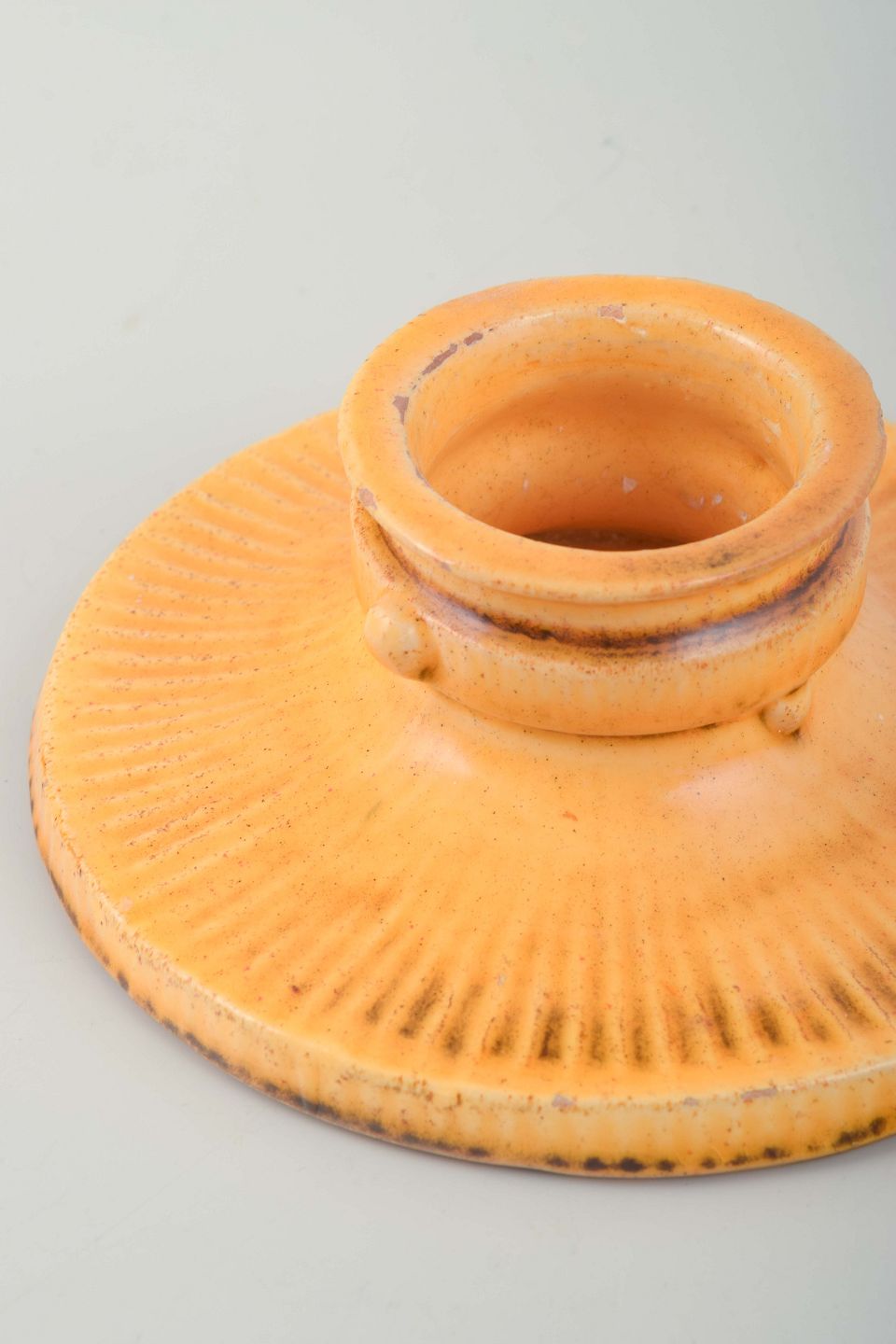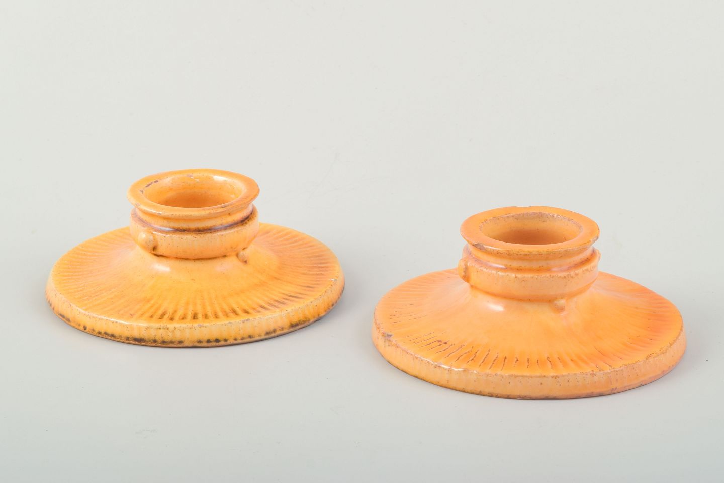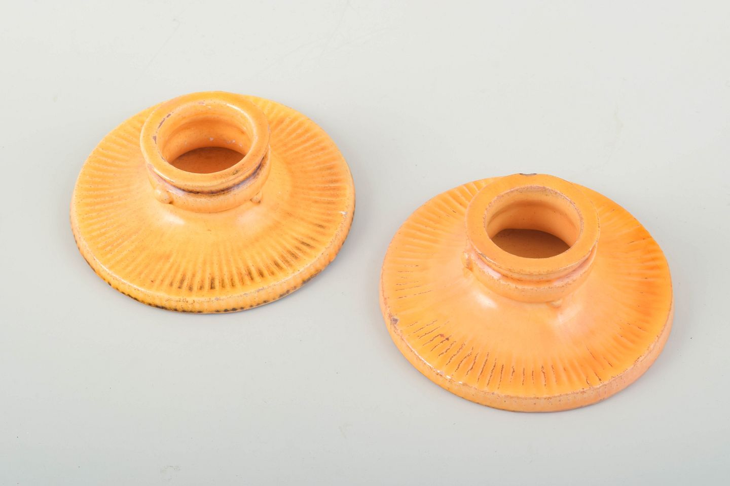 Par lysestager, Svend Hammershøi, Kähler, Danmark, ca. 1930’erne.To lave, runde lysestager i keramik med bred fod og lav lyseholder. Glasur i stærk orange uran-glasur med fint indridset dekor, der danner et solstråleagtigt mønster. Begge stager signeret under bunden med HAK (Herman A. Kähler)
