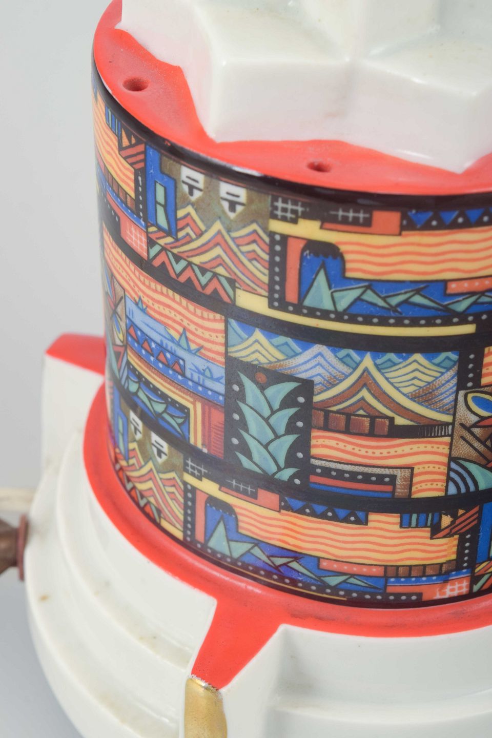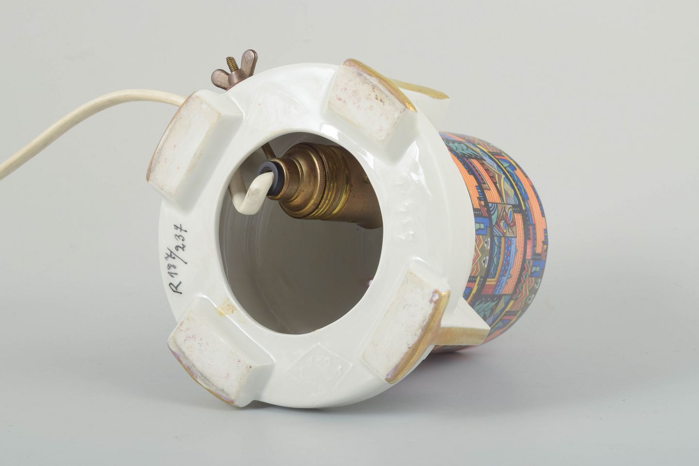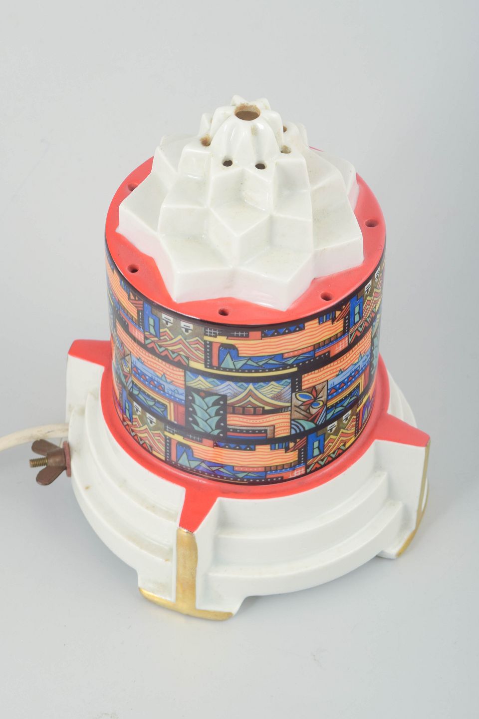 Duftlampe, Tyskland, ca. 1930’erne.Art Deco duftlampe i porcelæn med geometrisk form. Dekoreret med farverigt, arkitektur- og landskabsinspireret mønster i stærke nuancer af orange, blå, rød og sort. Basen med hvid glasur og detaljer i forgyldning. Elektrisk fatning under bunden.