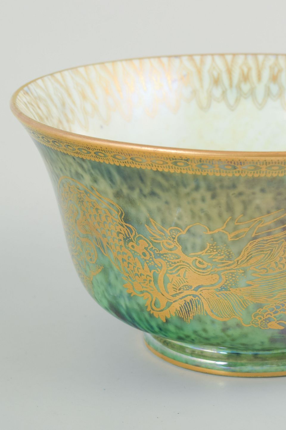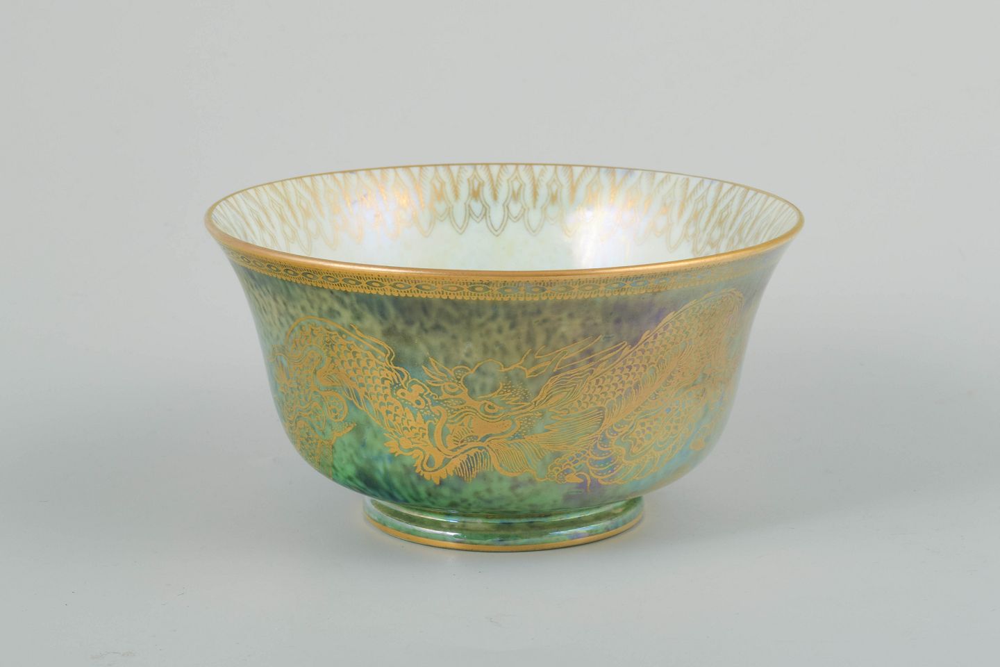 Daisy Makeig-Jones for Wedgwood, England.Skål i ”Lustre Ware” med grøn glasur, dekoreret med guldbemalet dragemotiv på ydersiden og fabeldyr i bunden. Indersiden med perlemorsskær og dekorativ bort langs kanten.