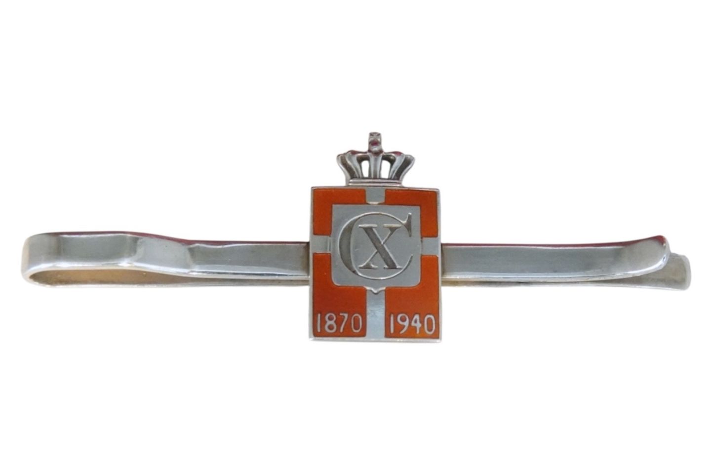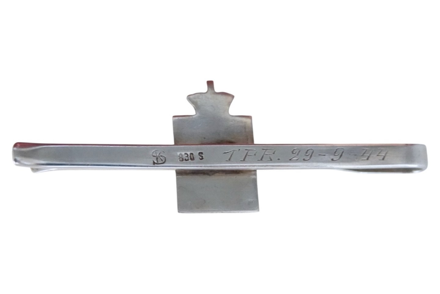 Kongemærke slipsenål i sølv - den er efterlavet med eftermonteret slipsenål. På bagsiden er der inskription: "1. PR (præmie) 29-9-44).Længde 7,3 cm.