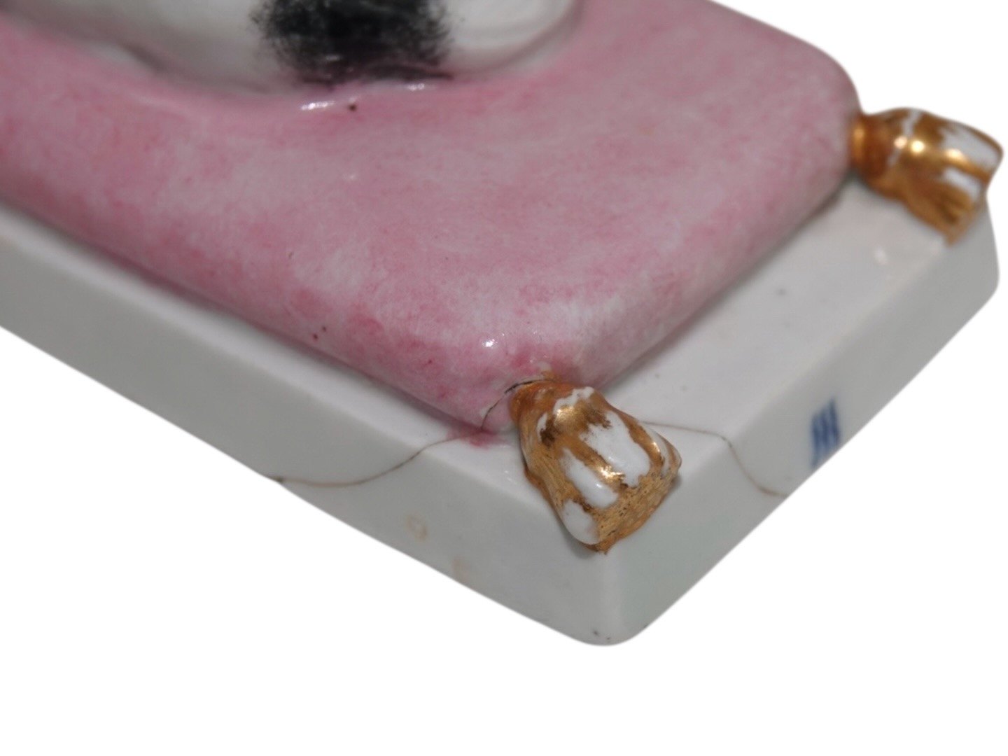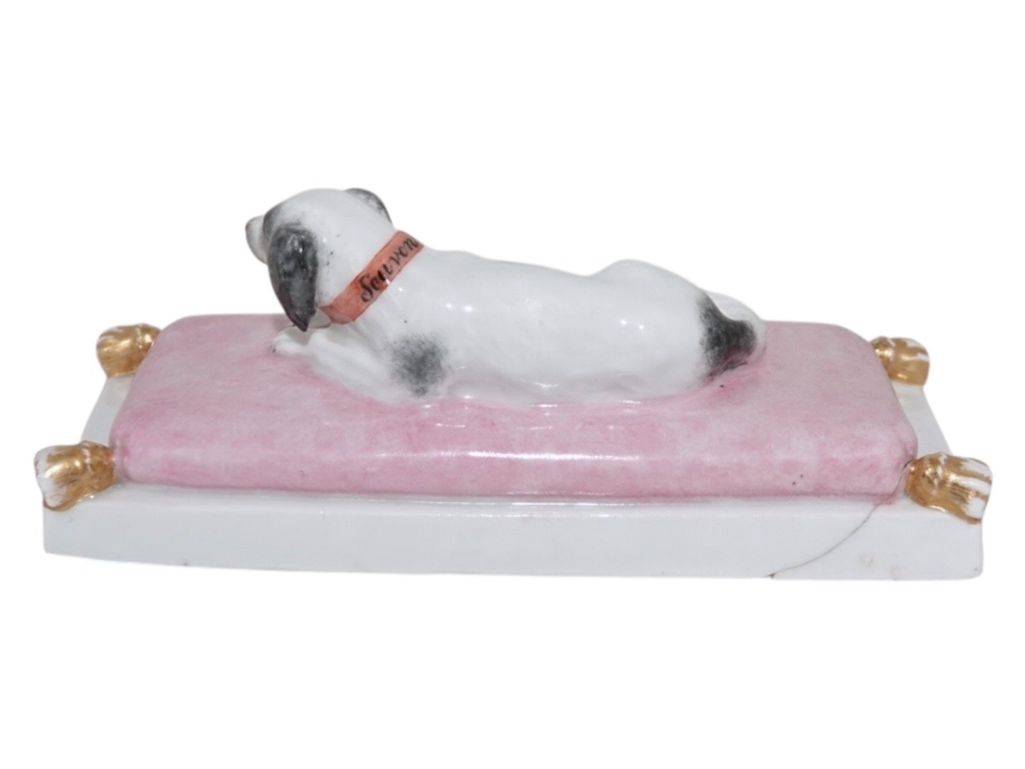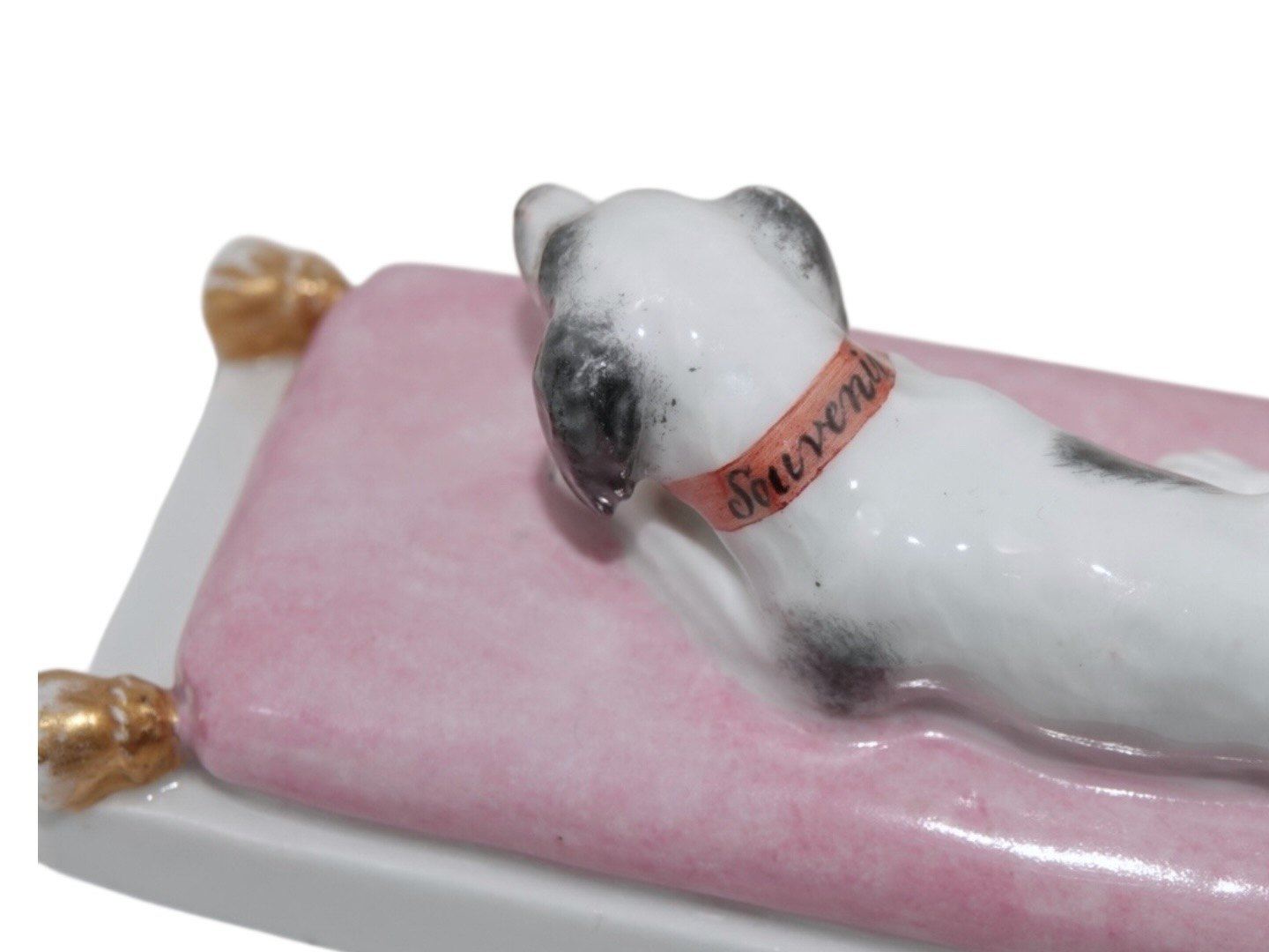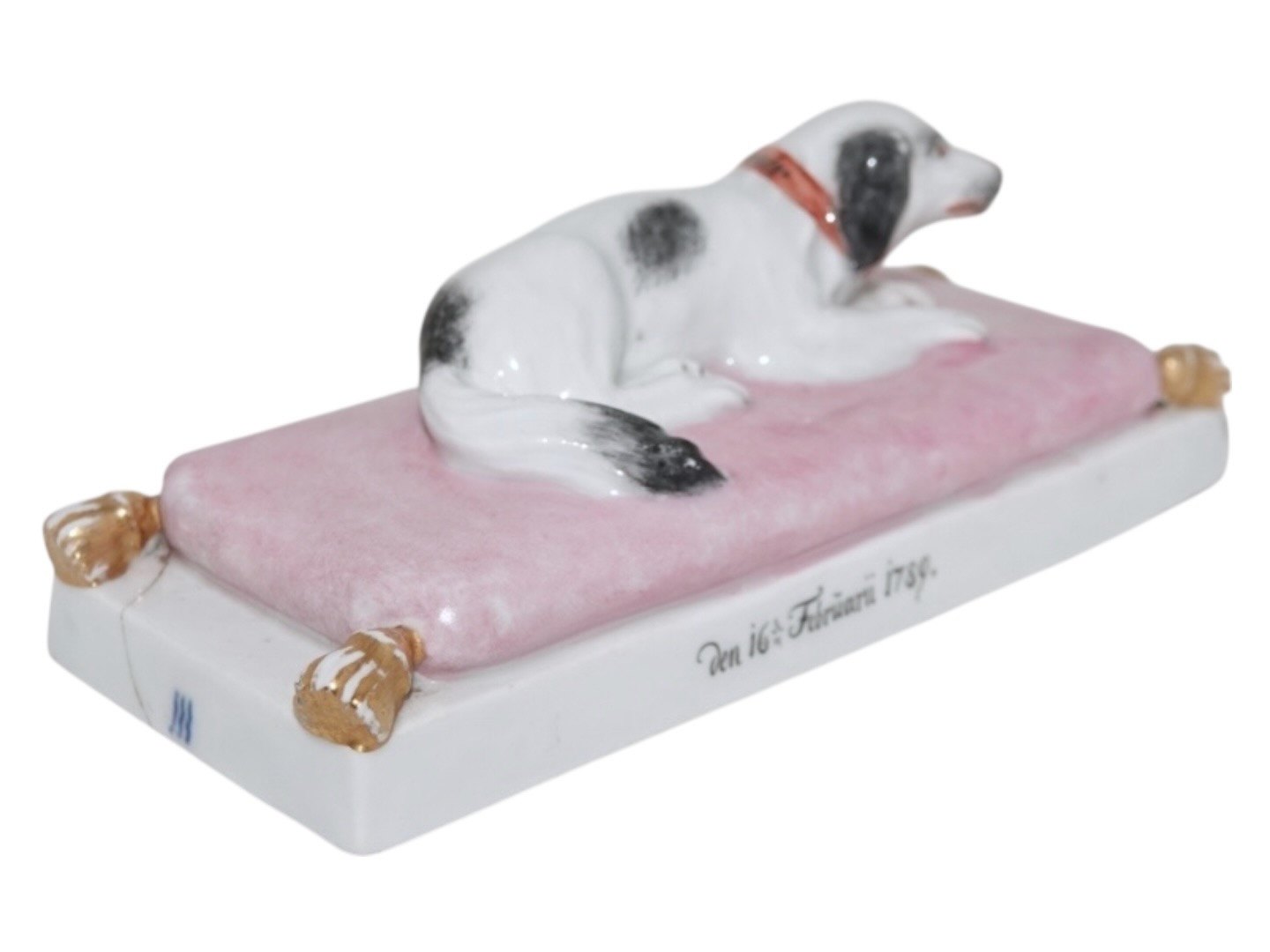 Royal Copenhagen porcelæn, brevpresse med hund liggede på en lyserød pude og med teksten "Den 16. Februarii 1789". På hundens halsbånd står der "Souvenir".Et af de første stykker porcelæn fra Royal Copenhagen.