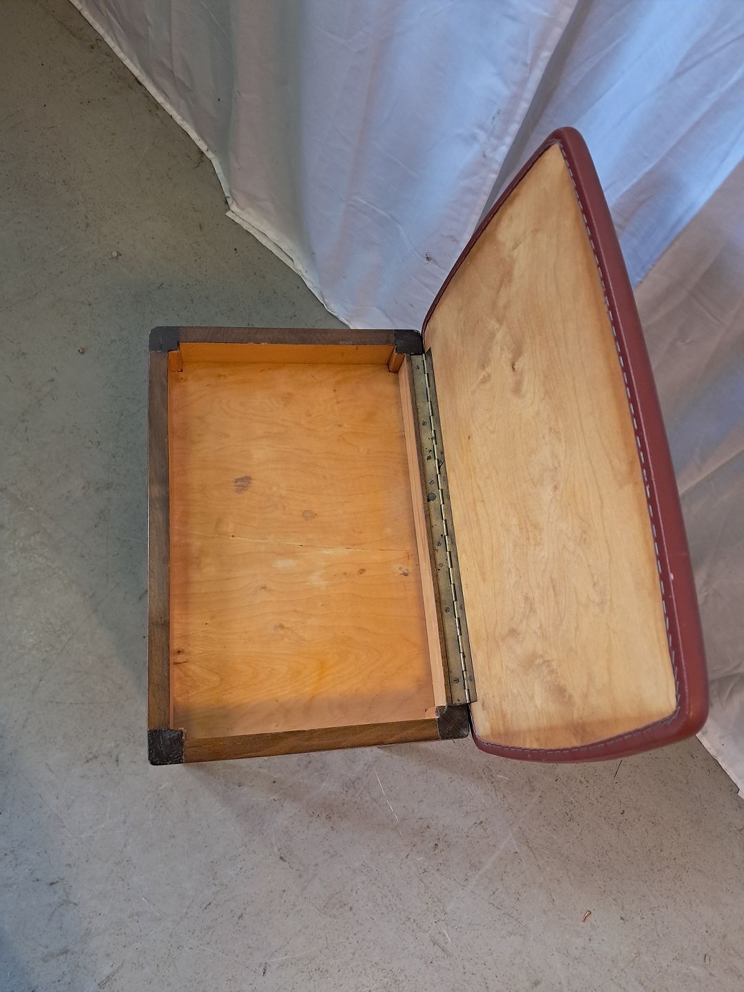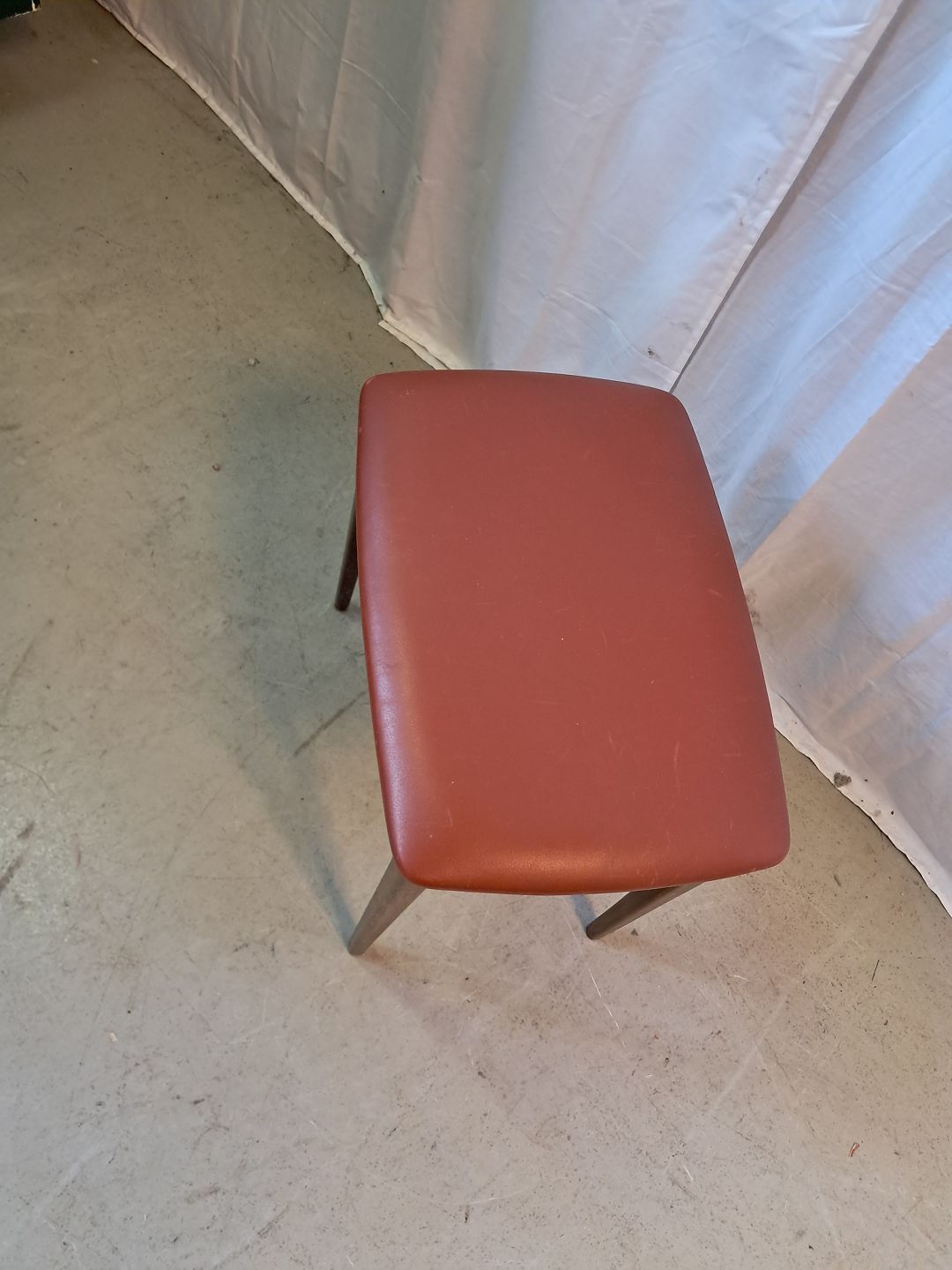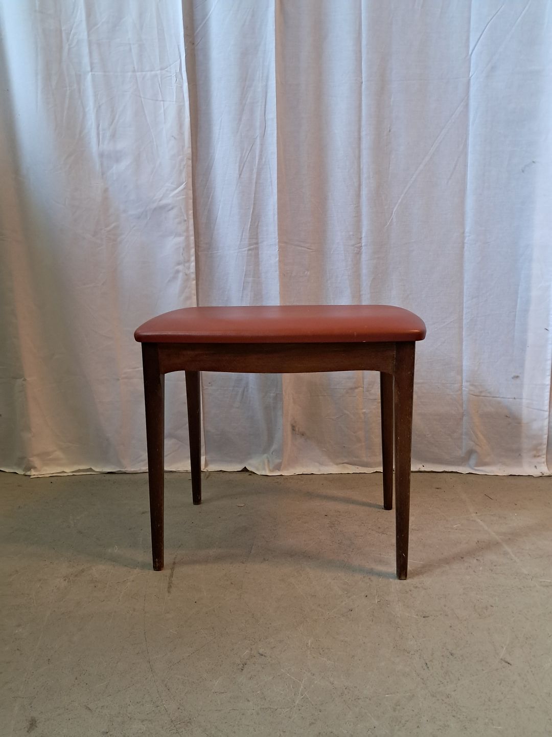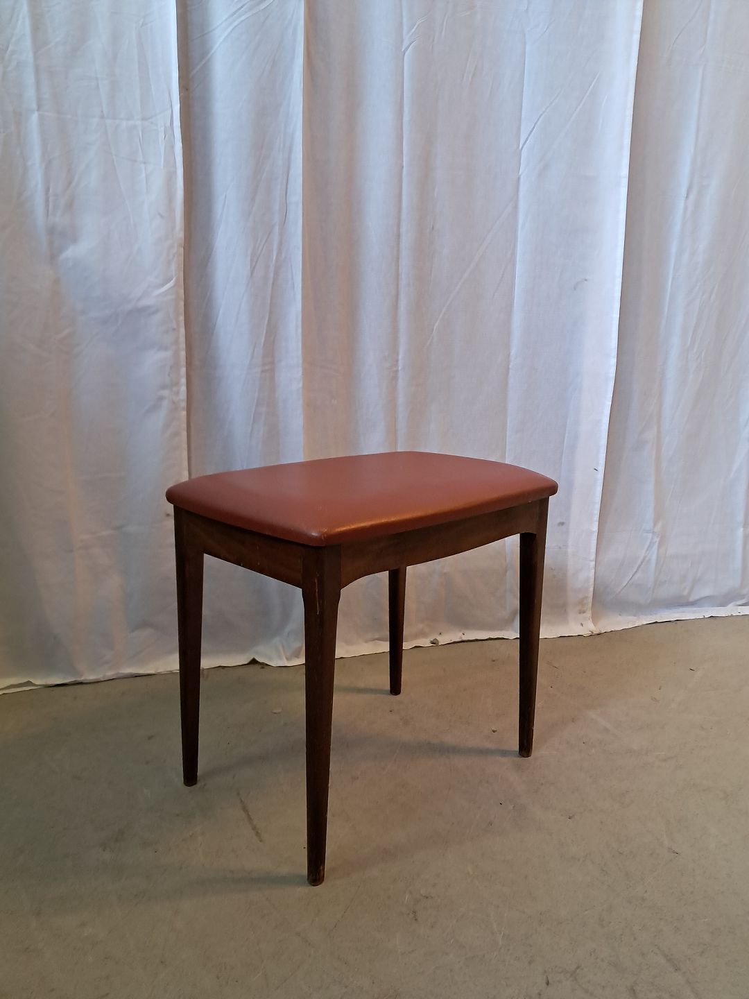 Skammel i bøgetræ med læderbetræk, fra 1960erne.Den har brugsspor.