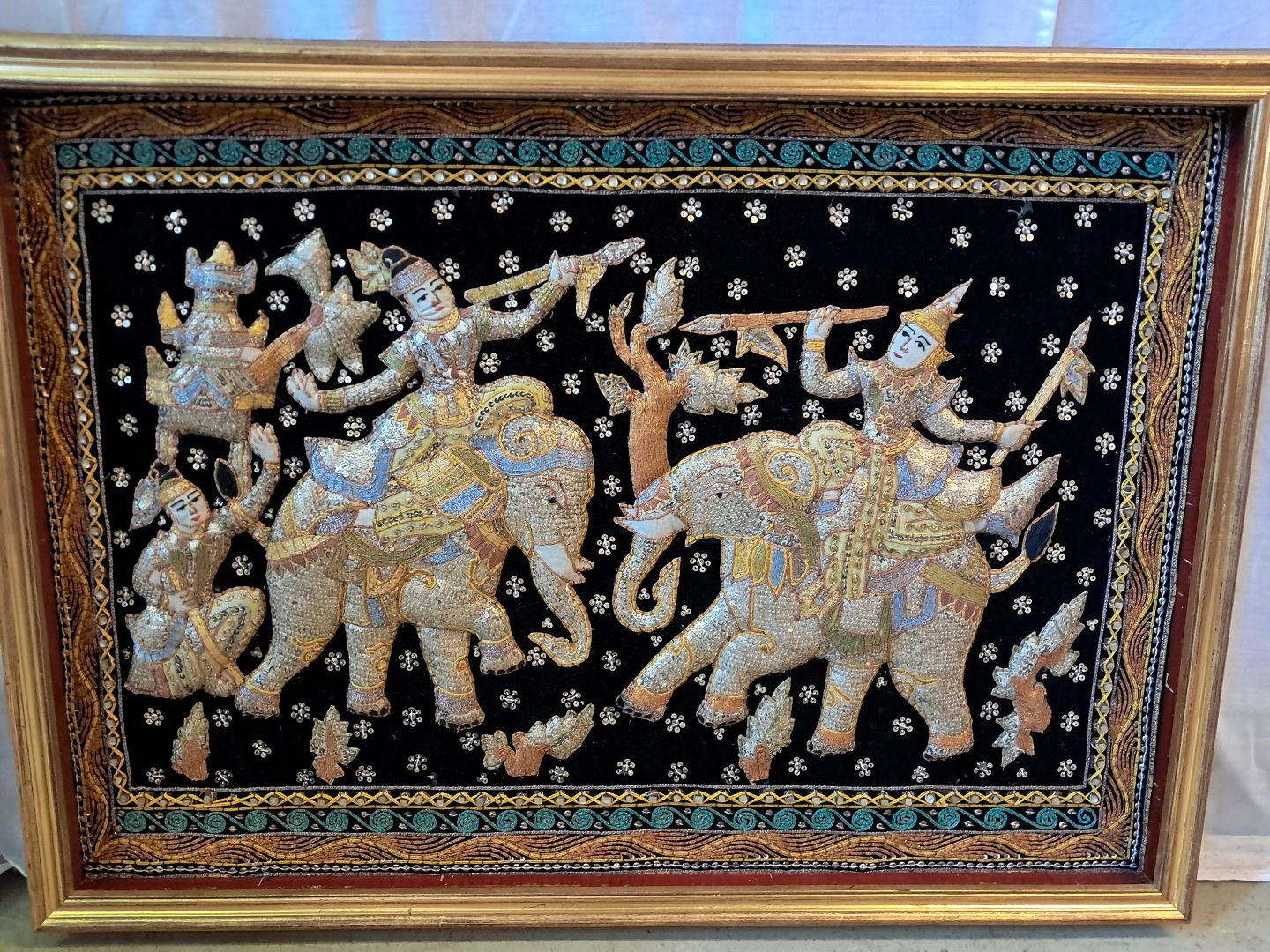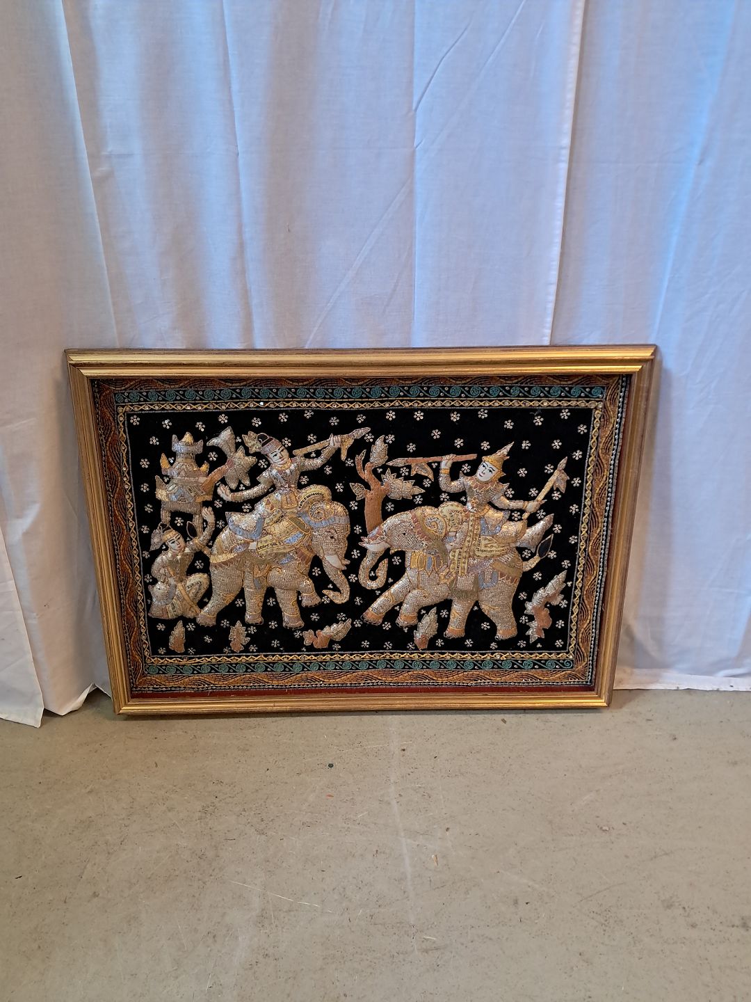 Indisk stof billede i guldmalet ramme, fra 1990erne.Det har brugsspor.
