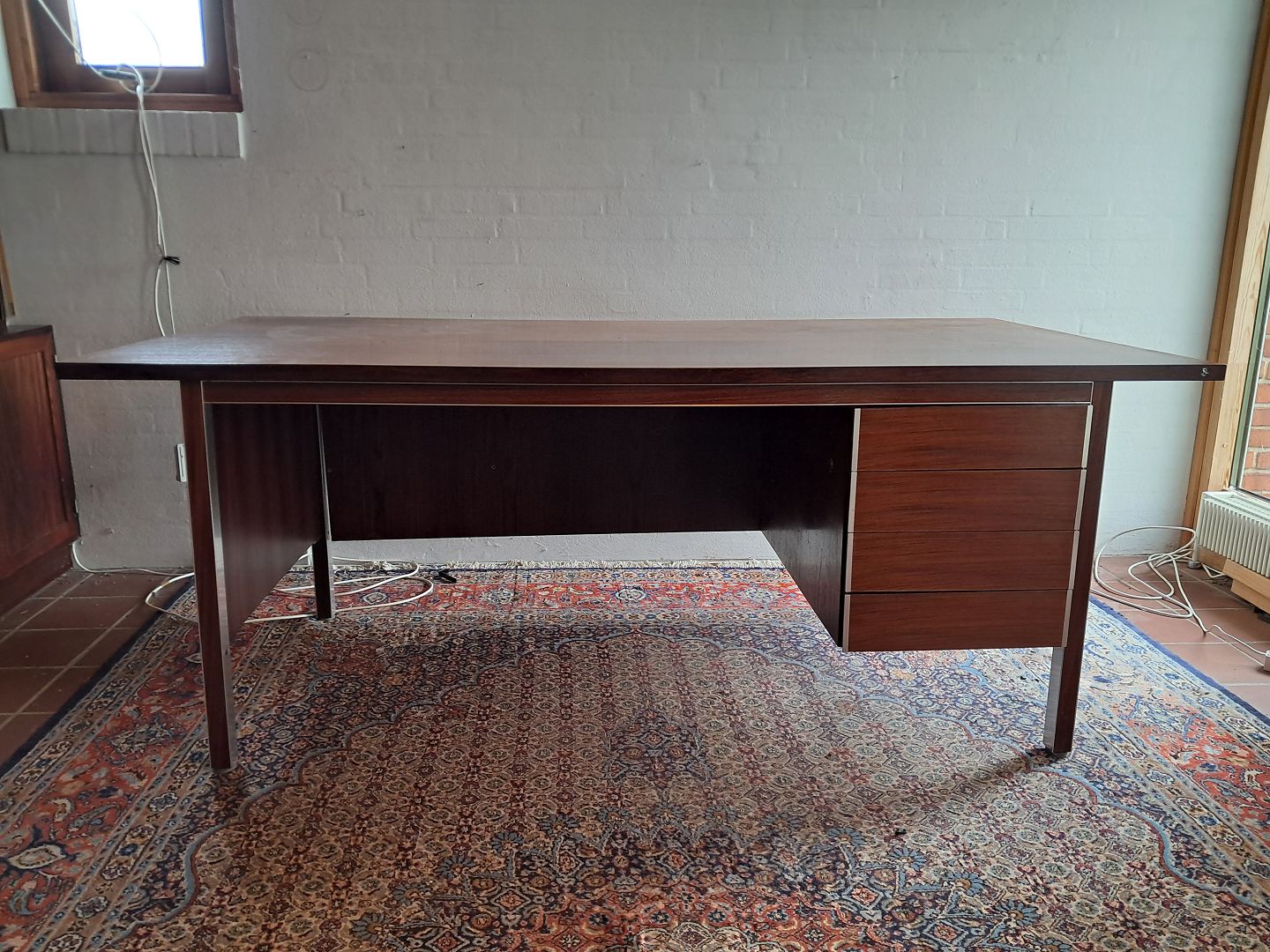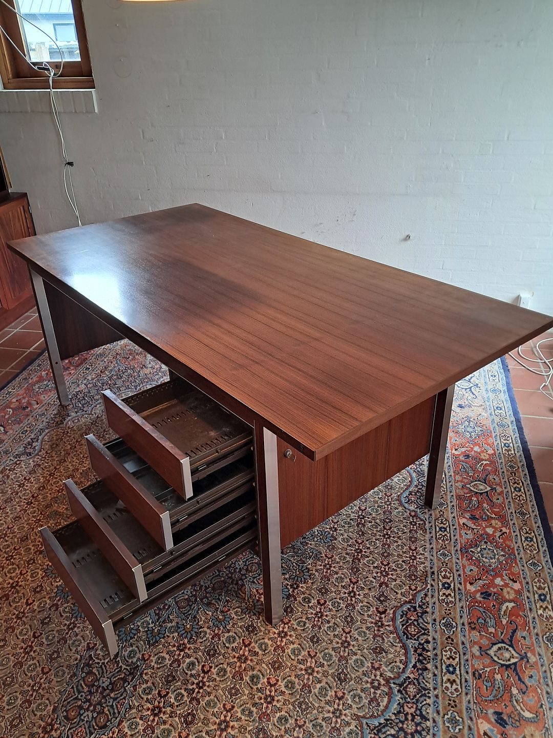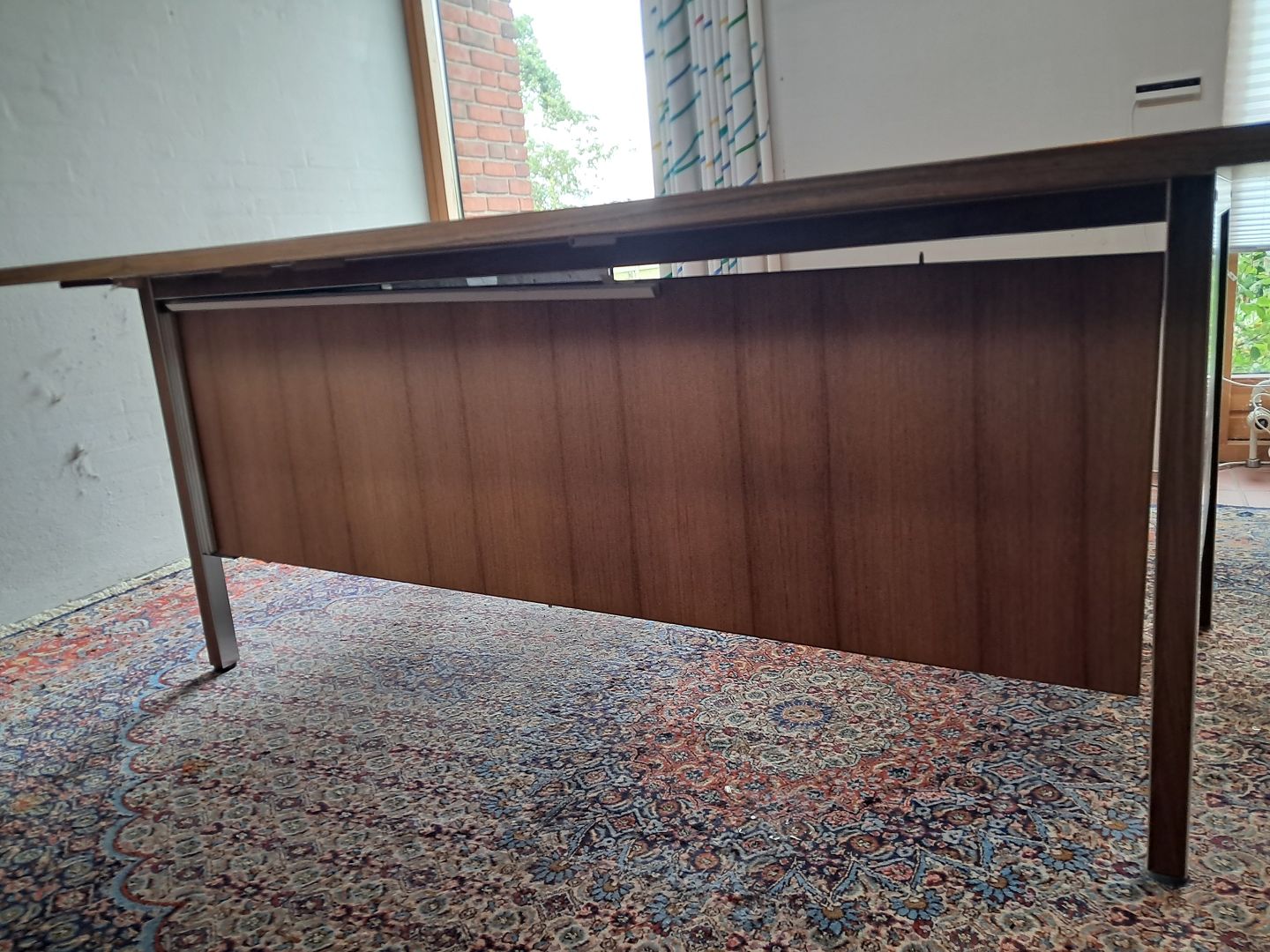 Skrivebord i fineret palisander og aluminium, fra 1970erne.Det har brugsspor og mangler en skue på bagstykket.(se foto)