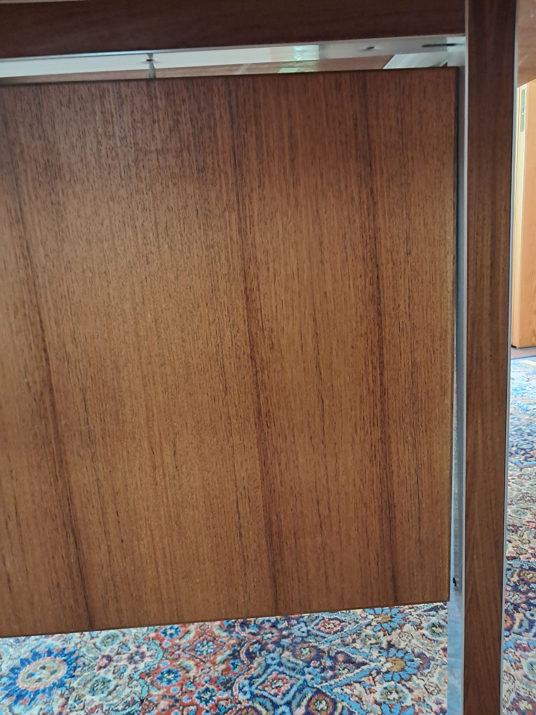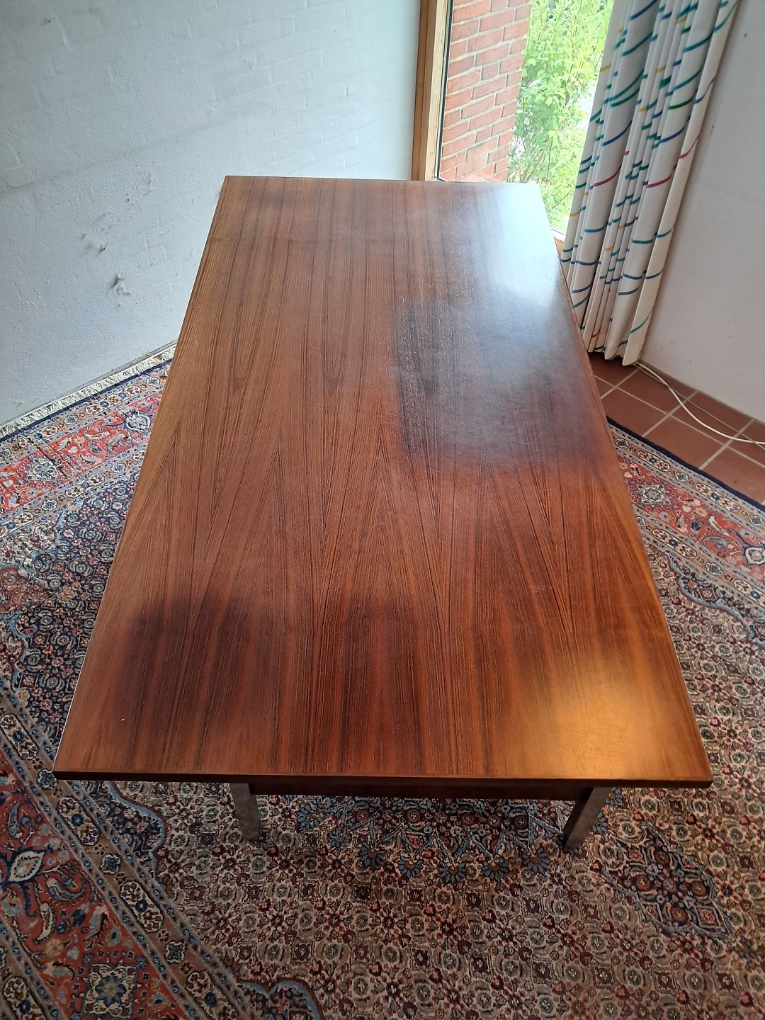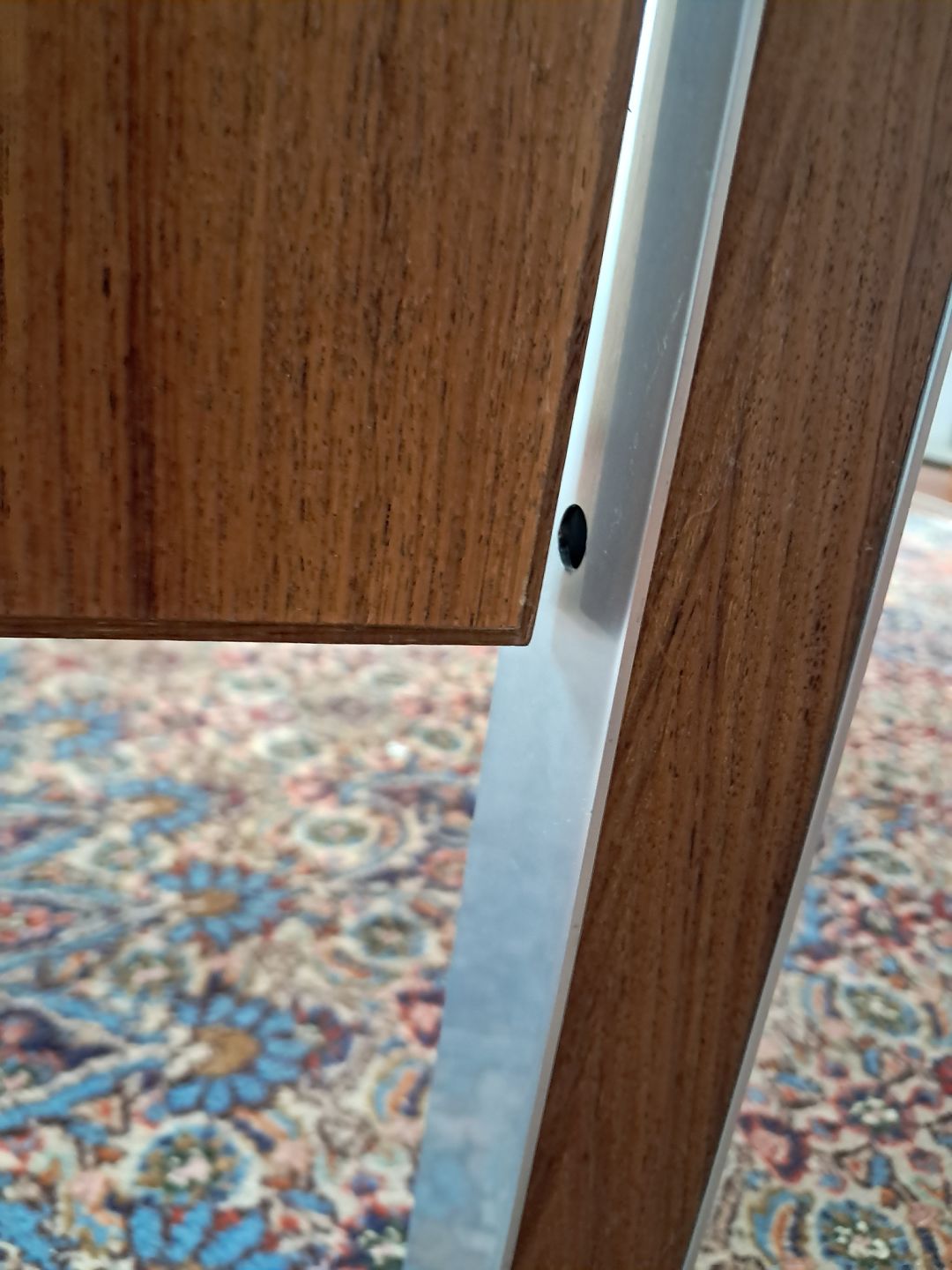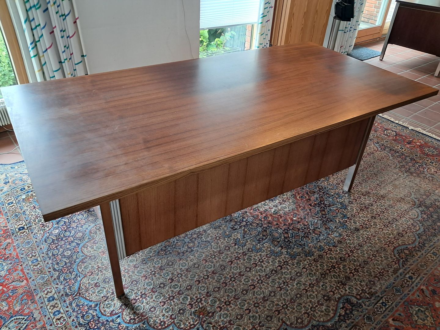 Skrivebord i fineret palisander og aluminium, fra 1970erne.Det har brugsspor og mangler en skue på bagstykket.(se foto)