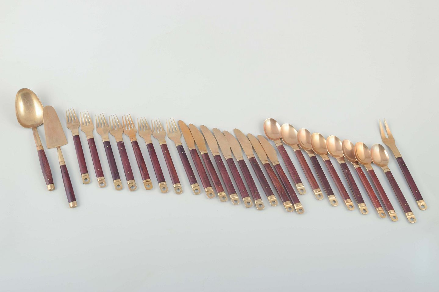 Bestående af 8 knive (L. 20,5 cm.), 8 gafler (L. 19 cm.), 8 spiseskeer (L. 19 cm.), samt serveringsdele.