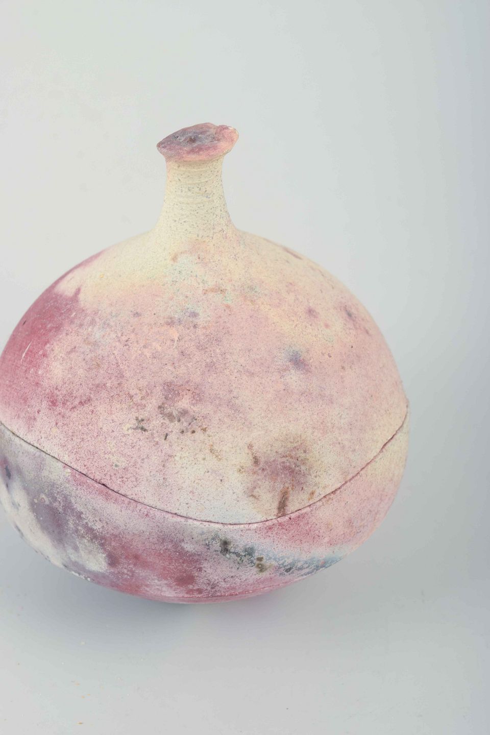 Organisk formet lågkrukke i drejet stentøj med rå overflade og flerfarvet glasur i rosa, hvide og sorte toner.