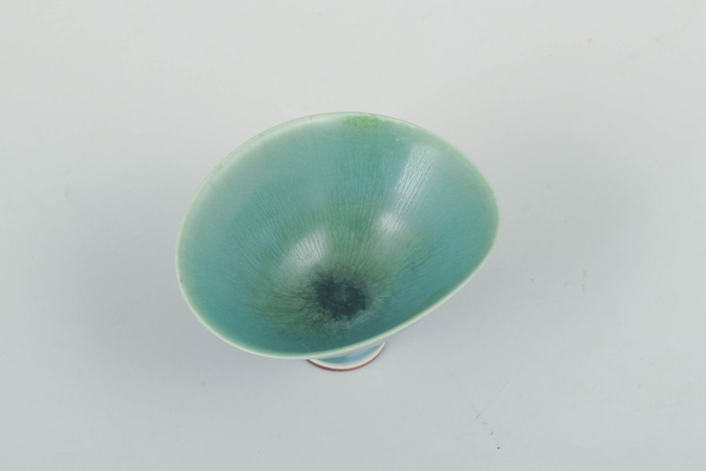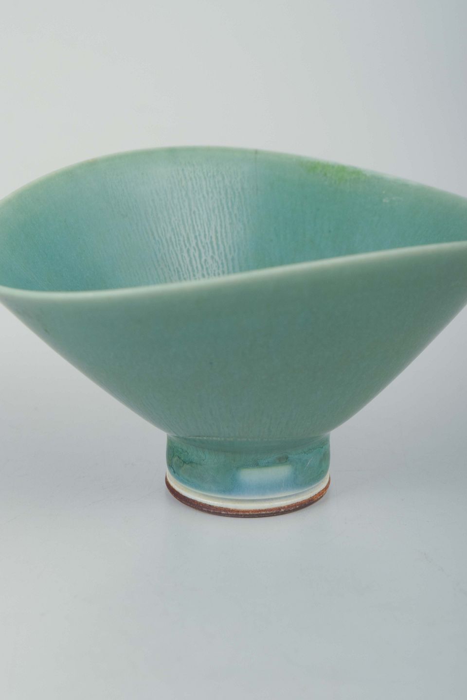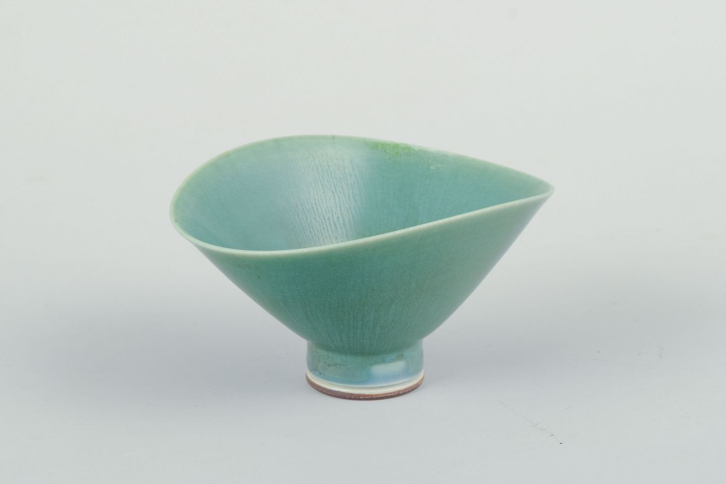 Berndt Friberg for Gustavsberg. Lille skål. Sverige, midt 1900-tallet.Drejet skål i stentøj med asymmetrisk form og grønlig/turkis glasur med fine nuanceringer. Indridset signatur Friberg, Gustavsberg.