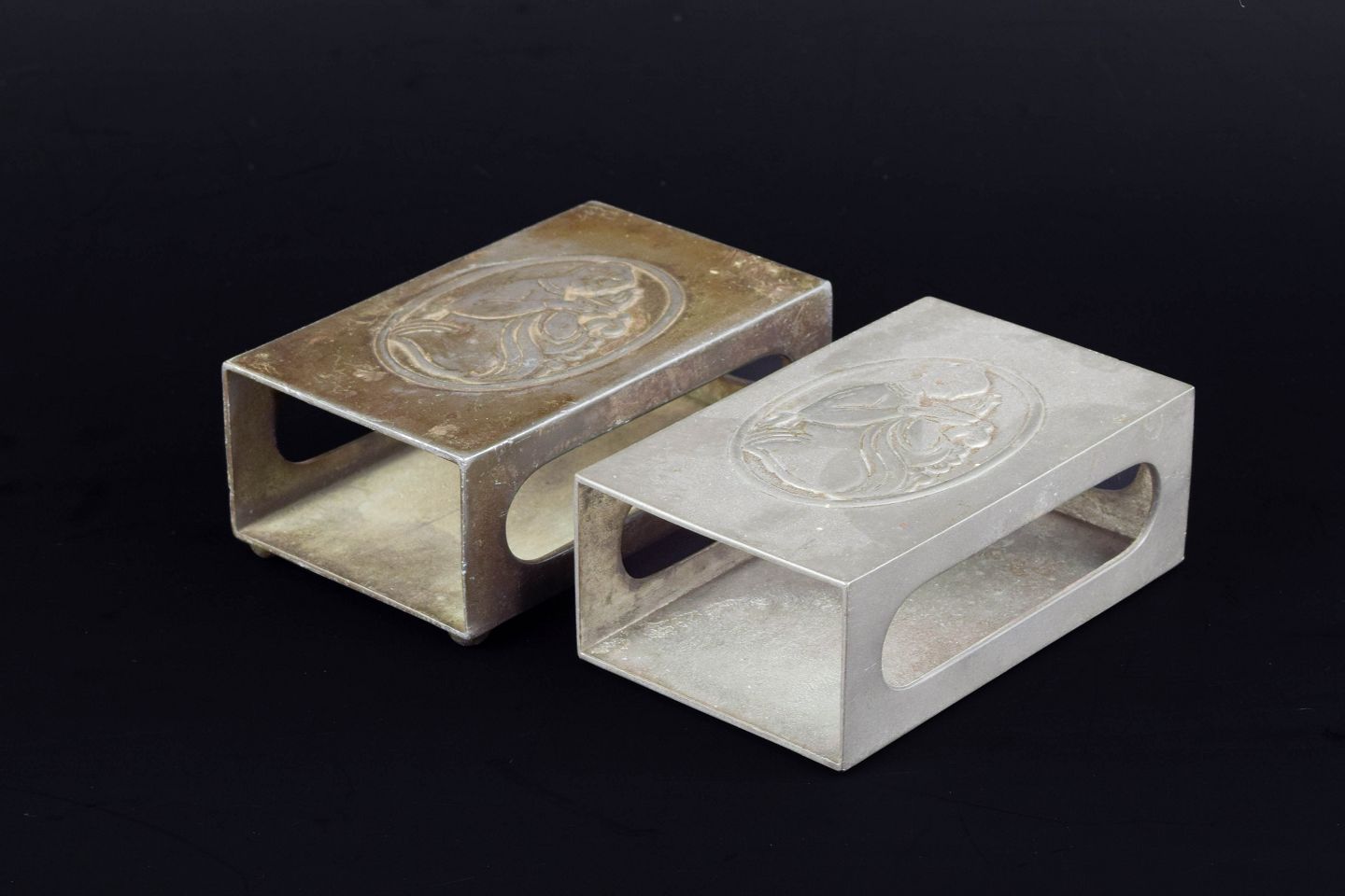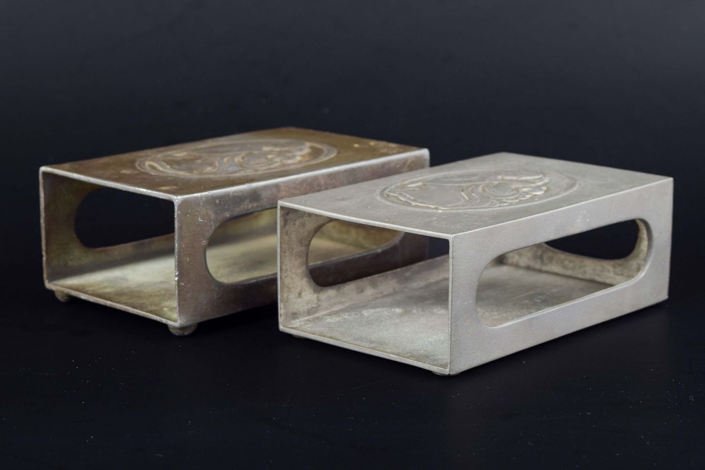Just Andersen. To tændstikæskeholdere i tin, model 260 og 78. Danmark, ca. 1930.Mål: H. 3,5 cm. L. 10 cm. D. 6 cm.
