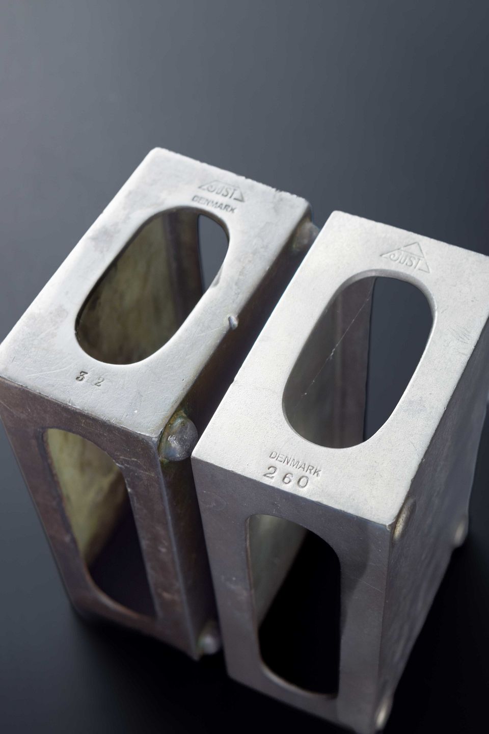 Støbt tin, rektangulær form med åbne sider og ovalt relief med kvindefigur på oversiden. Begge mærket JUST i trekant, Denmark samt modelnumrene 260 og 78.