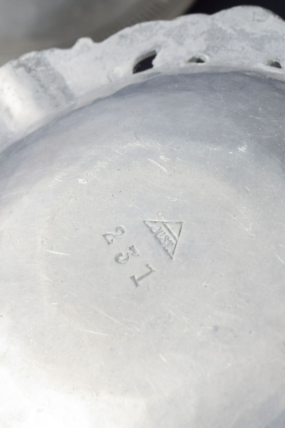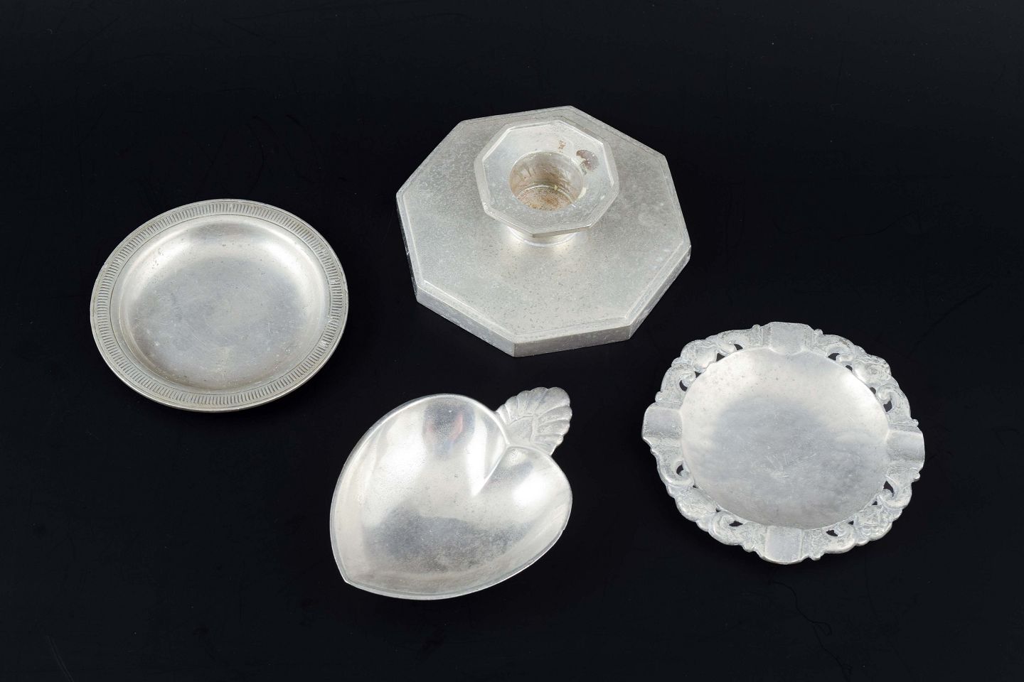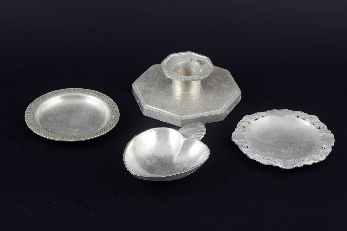 Just Andersen, Denmark.Samling af tre små skåle og en lysestage i tin, herunder en hjerteformet skål, en ottekantet lysestage samt en rund skål med gennembrudt kant. Én mærket med trekantet stempel "JUST" og modelnummer 231.