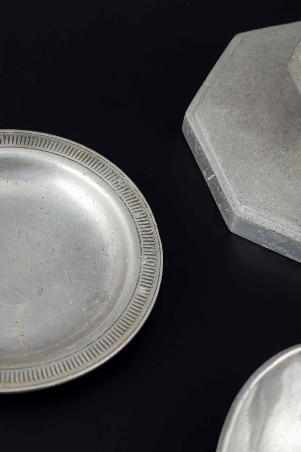 Just Andersen, Denmark.Samling af tre små skåle og en lysestage i tin.