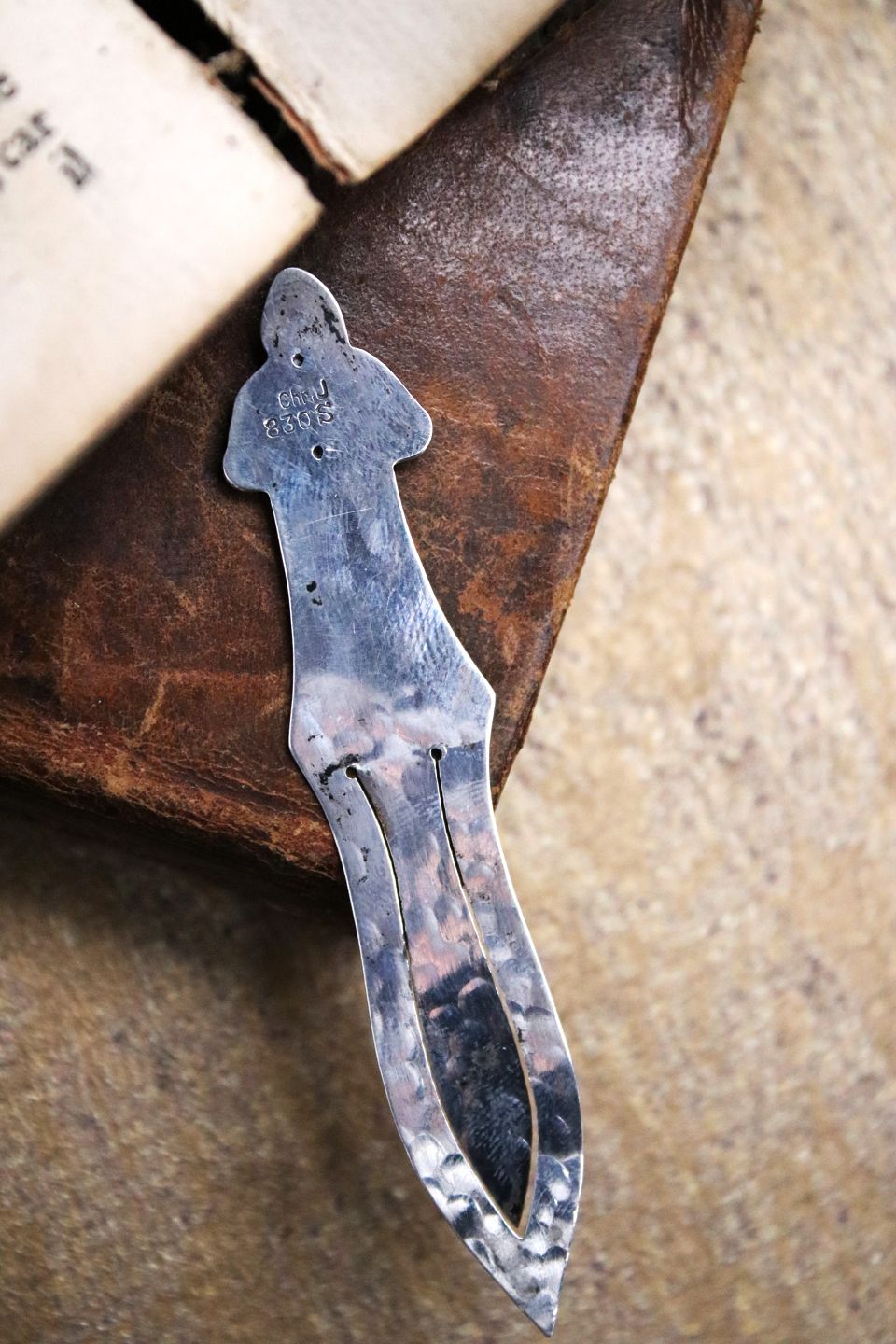 Gammelt bogmærke i sølv (stemplet Chr. J. 830S)Længde 8,7cm. med motiv af sømand der spiller harmonika.