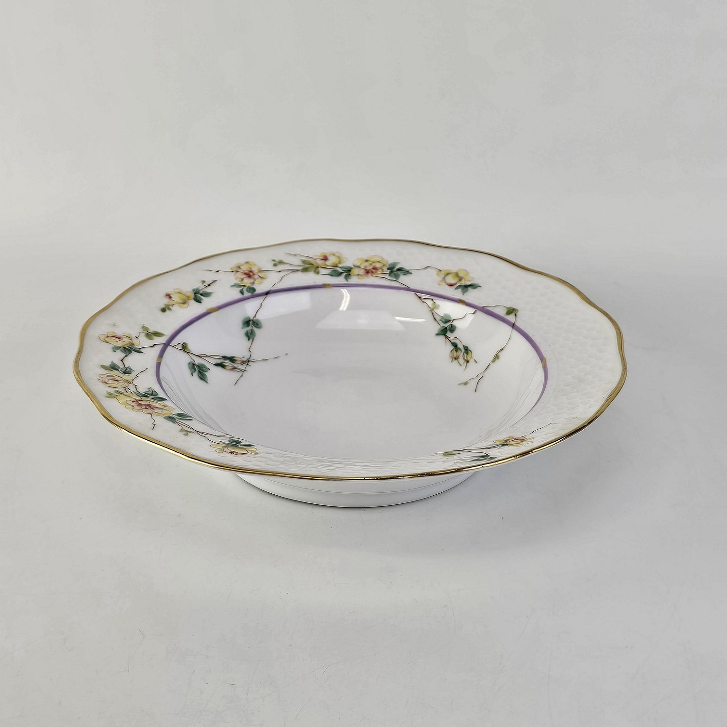 Service i hvidt porcelæn med hamret kantmønster dekoreret med gule blomsterranker og lyslilla streg. Stellet er med guldkant og det er mærket med bølger anvendt frem til 1890.