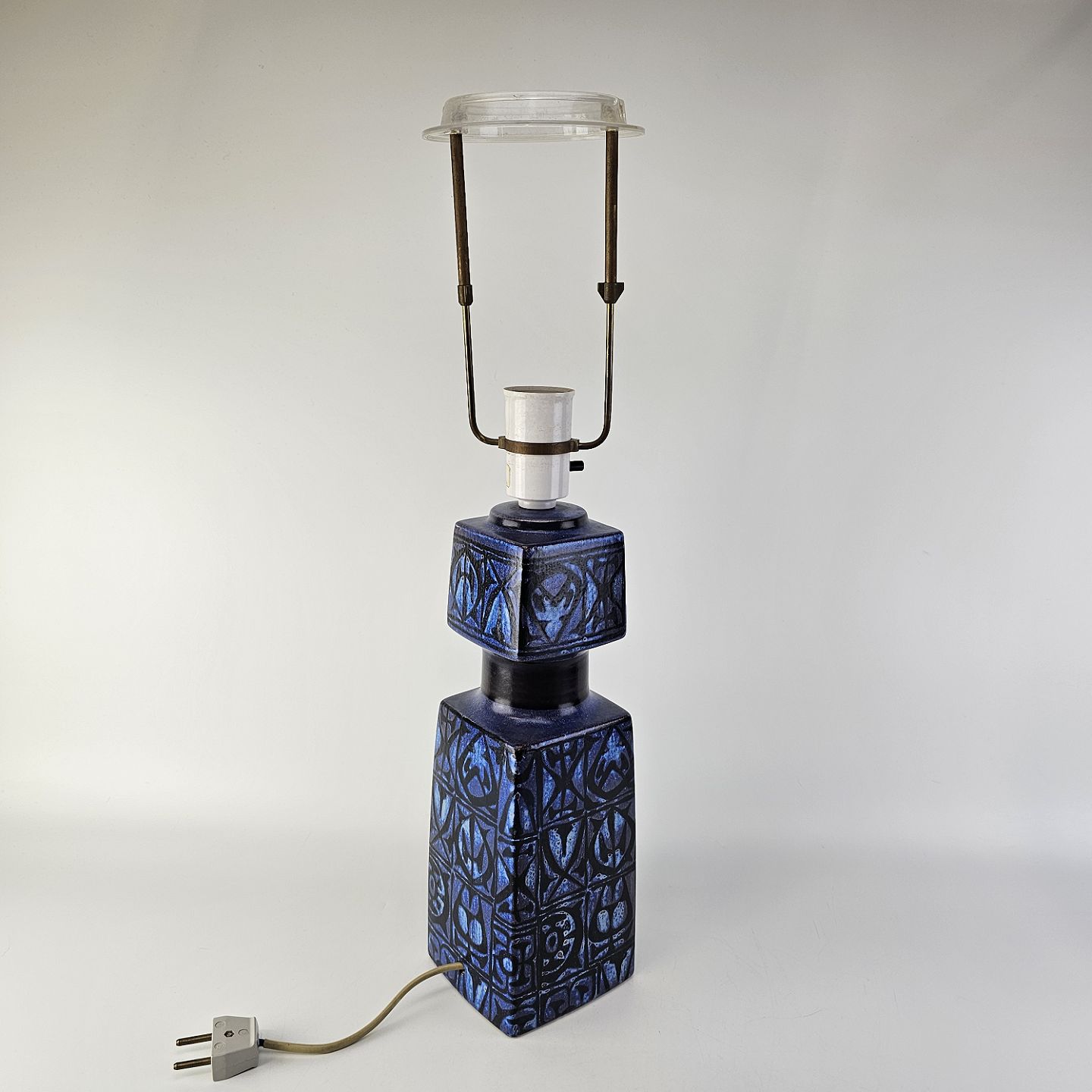 Bordlampe i fajance med abstrakt mønster af firkanter i blå nuancerNr. E 7192