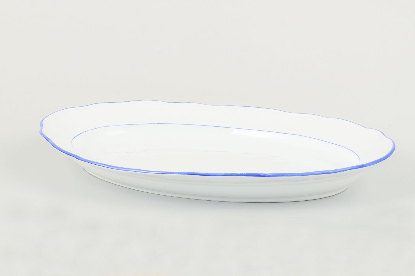 Serveringsfad i hvidglaseret porcelæn med bølget kant og blå staffering.