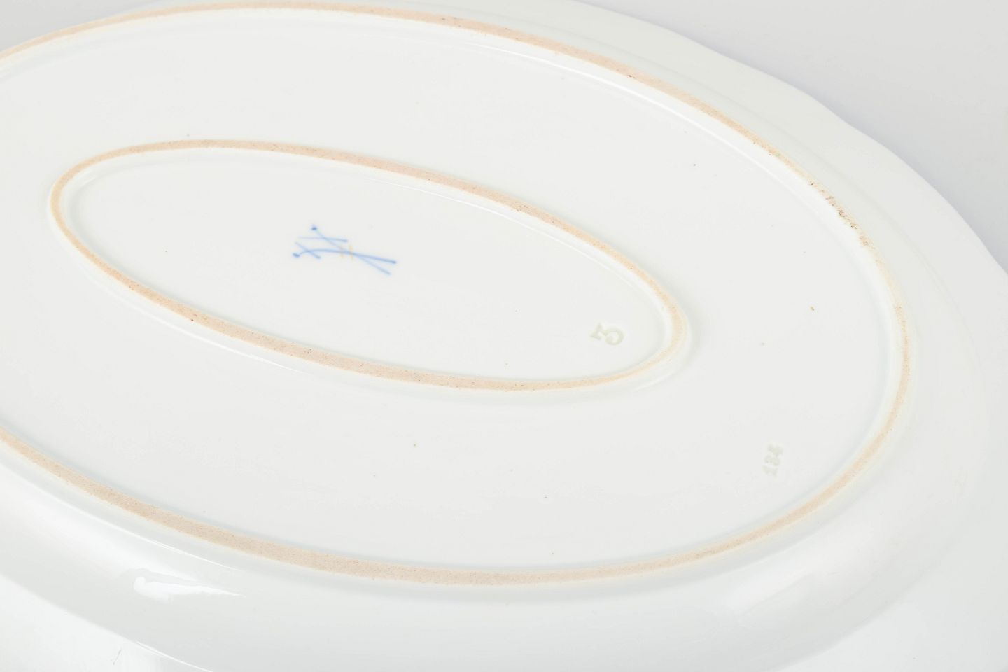 Et klassisk serveringsfad fra Meissen, kendetegnet ved den enkle hvide glasur med blå staffering. Den bølgede form giver et elegant udtryk, der er karakteristisk for Meissens porcelænsproduktion i mellemkrigstiden.