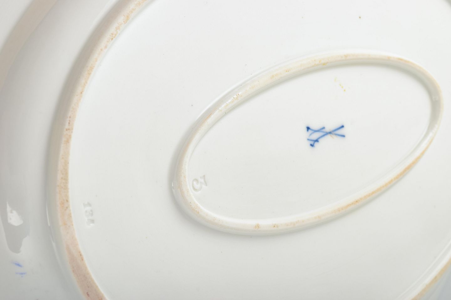 Et klassisk serveringsfad fra Meissen, kendetegnet ved den enkle hvide glasur med blå staffering. Den bølgede form giver et elegant udtryk, der er karakteristisk for Meissens porcelænsproduktion i mellemkrigstiden.