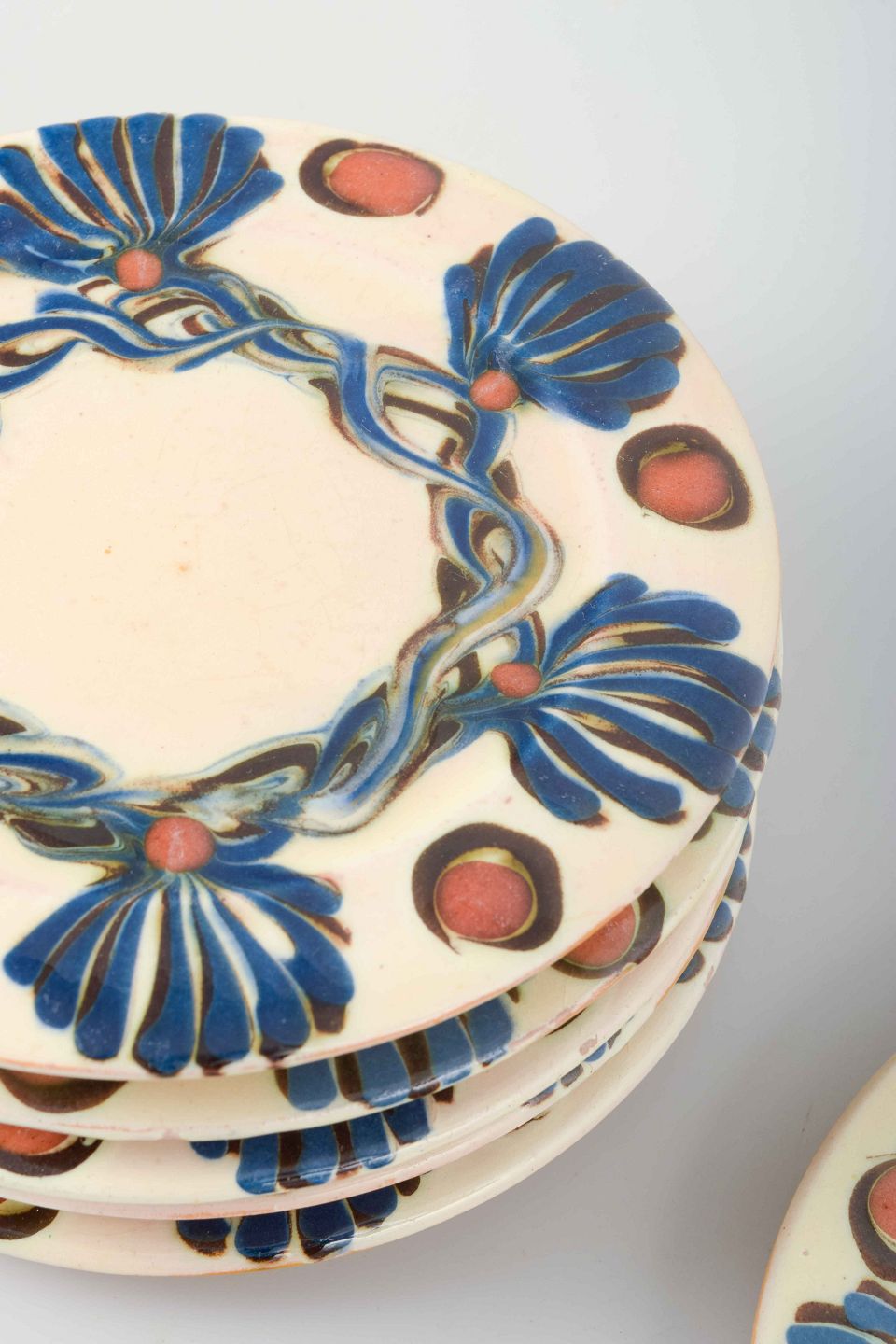 Et dekorativt sæt på seks tallerkner fra Kählers berømte Marguerite-stel, hvor traditionelle former og farver forenes i et udtryk, der kombinerer brugskunst med dekorativ folkekunst.