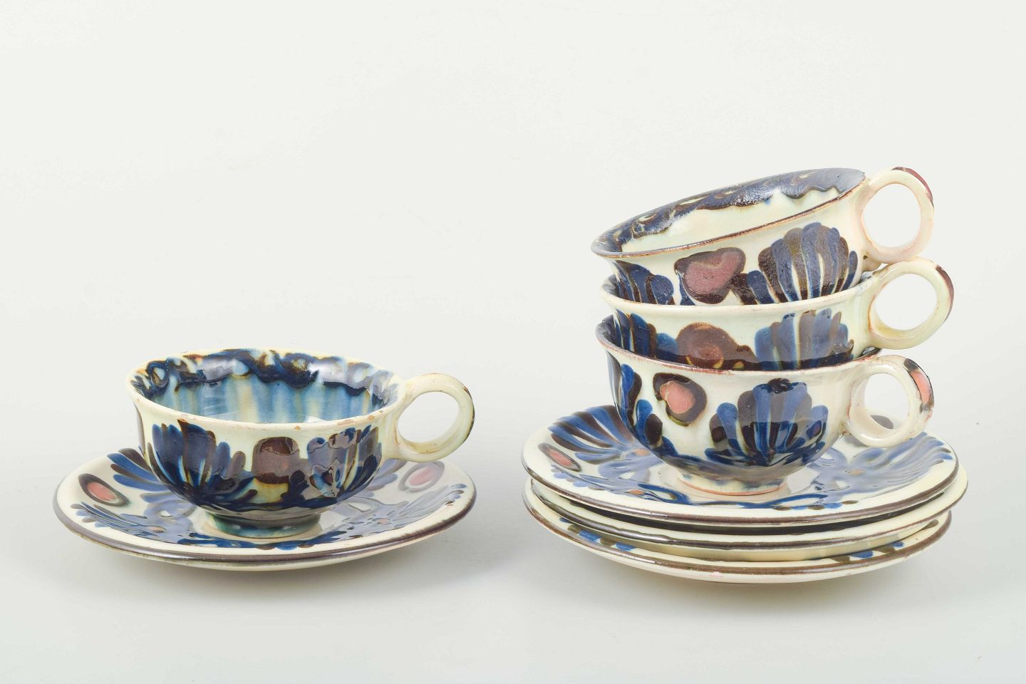 Kähler, DanmarkFire tekopper med tilhørende underkopper i Marguerite-stellet, glaseret keramik hånddekoreret med polykrome bladranker og hjerteformede motiver i grøn, brun og rød glasur på lys bund.
