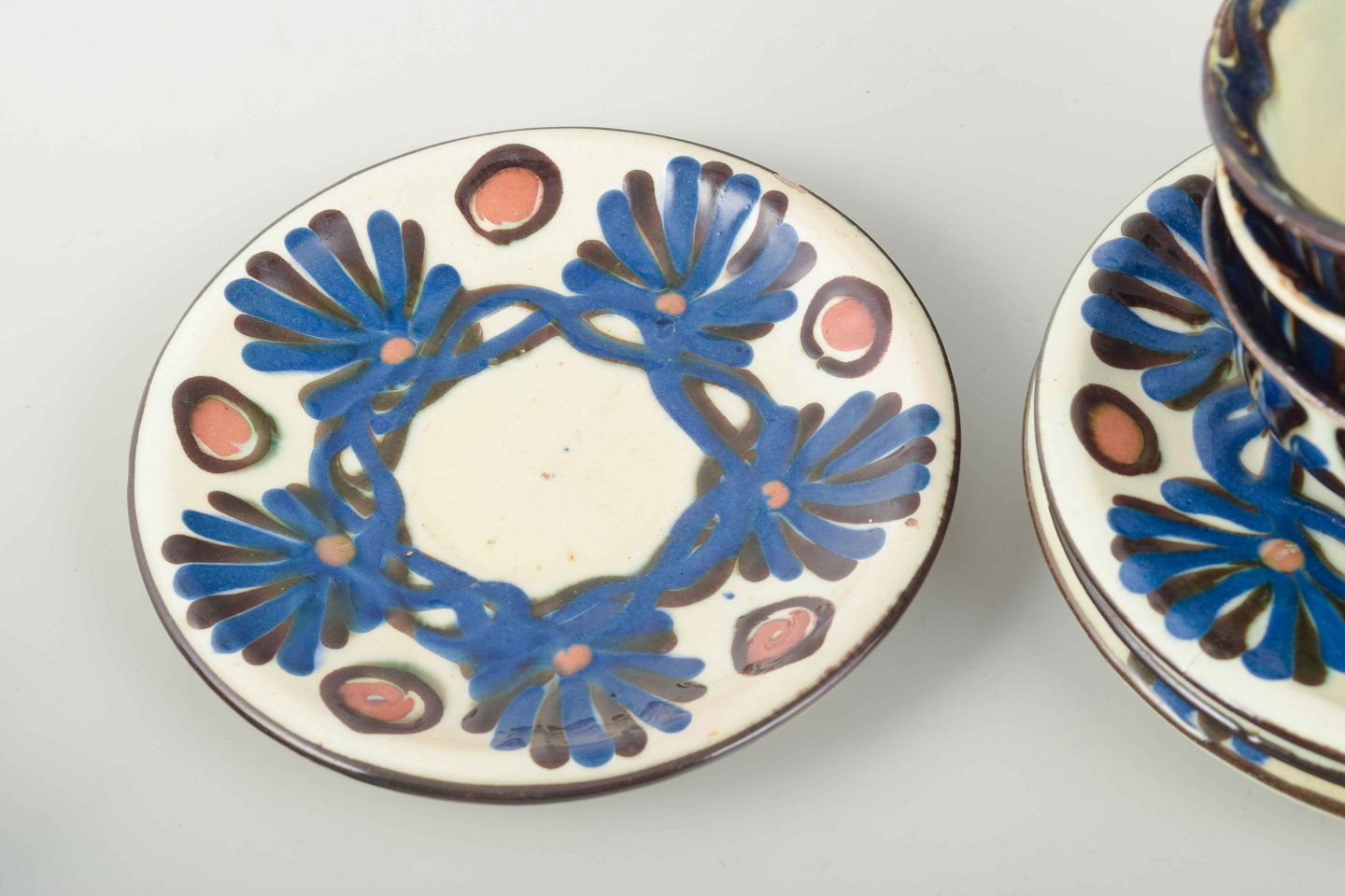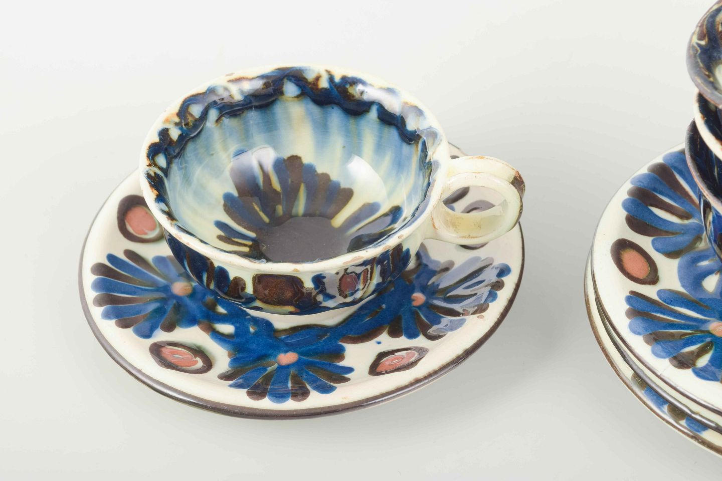 Et dekorativt sæt på fire tekopper med underkopper fra Kählers berømte Marguerite-stel, hvor traditionelle former og farver forenes i et udtryk, der kombinerer brugskunst med dekorativ folkekunst.