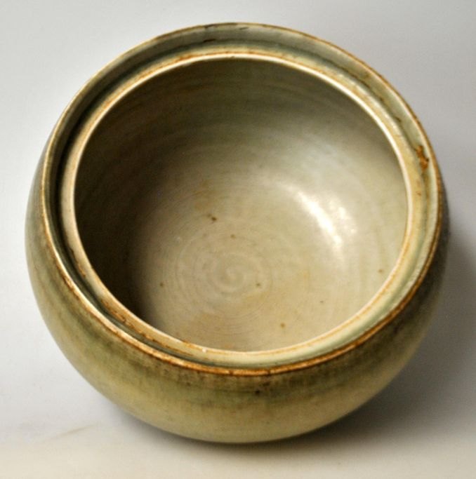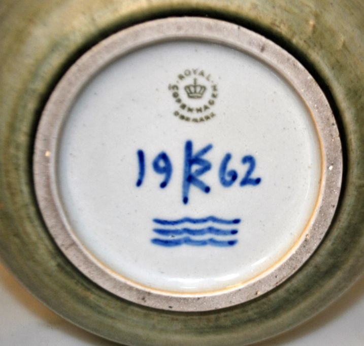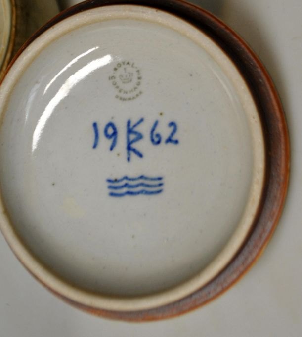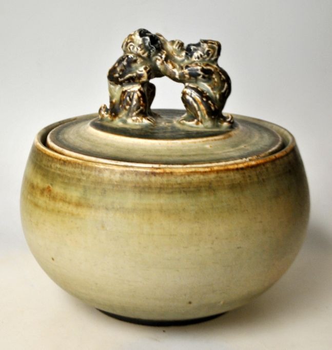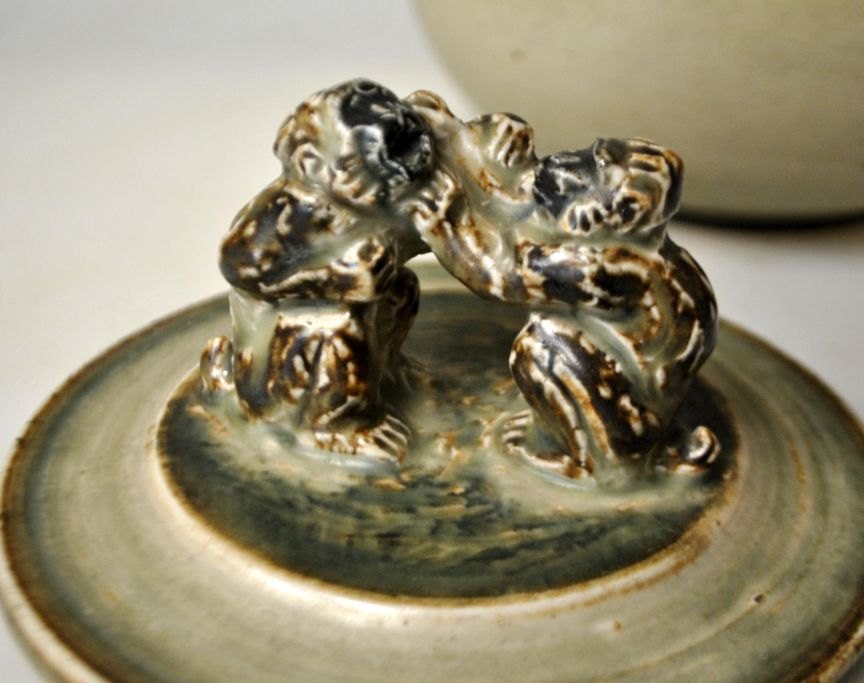Kyhn, Knud (1880 - 1969) Dänemark: Einzigartiger Deckel schale. Die Königliche Porzellanmanufaktur. 1962.Schichtgefäß aus Steingut mit gesungener Glasur. Auf dem Deckel zwei Affen. Gestempelt: Monogramm 1962. 1. Sortierung. H.: 16 cm. Durchmesser: 17 cm