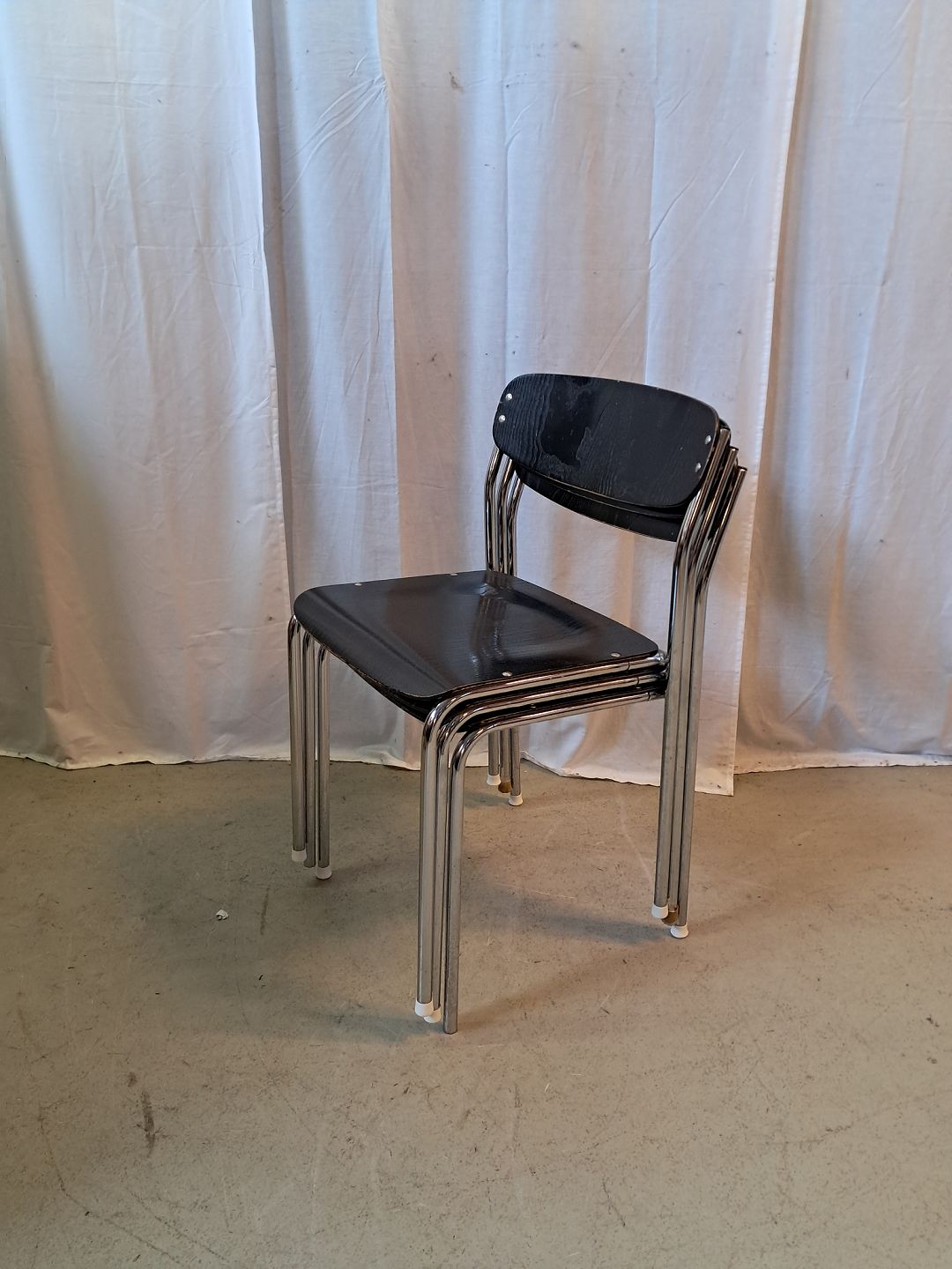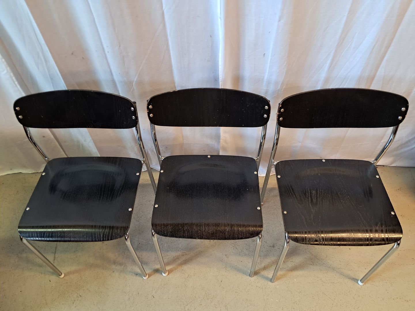 3 Stole i metal og malet træ, fra 1980erne.De har brugsspor og den ene mangler en nitte.