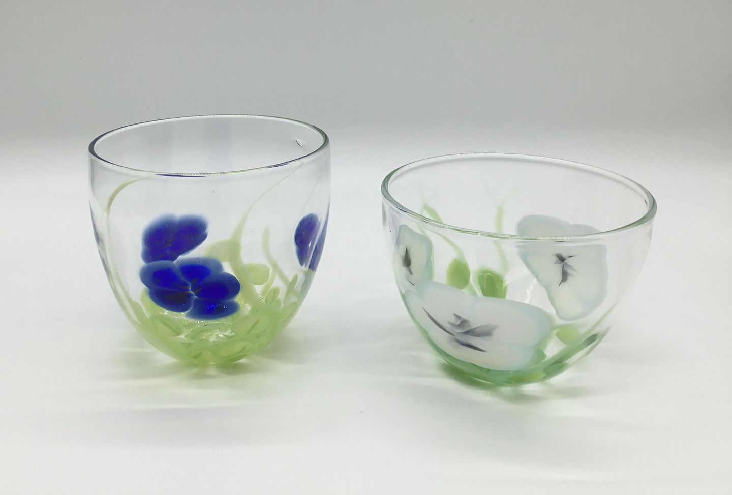 Glasskål med blå stedmoder signeret H 12,5 cm D 13 cm kr. 2600