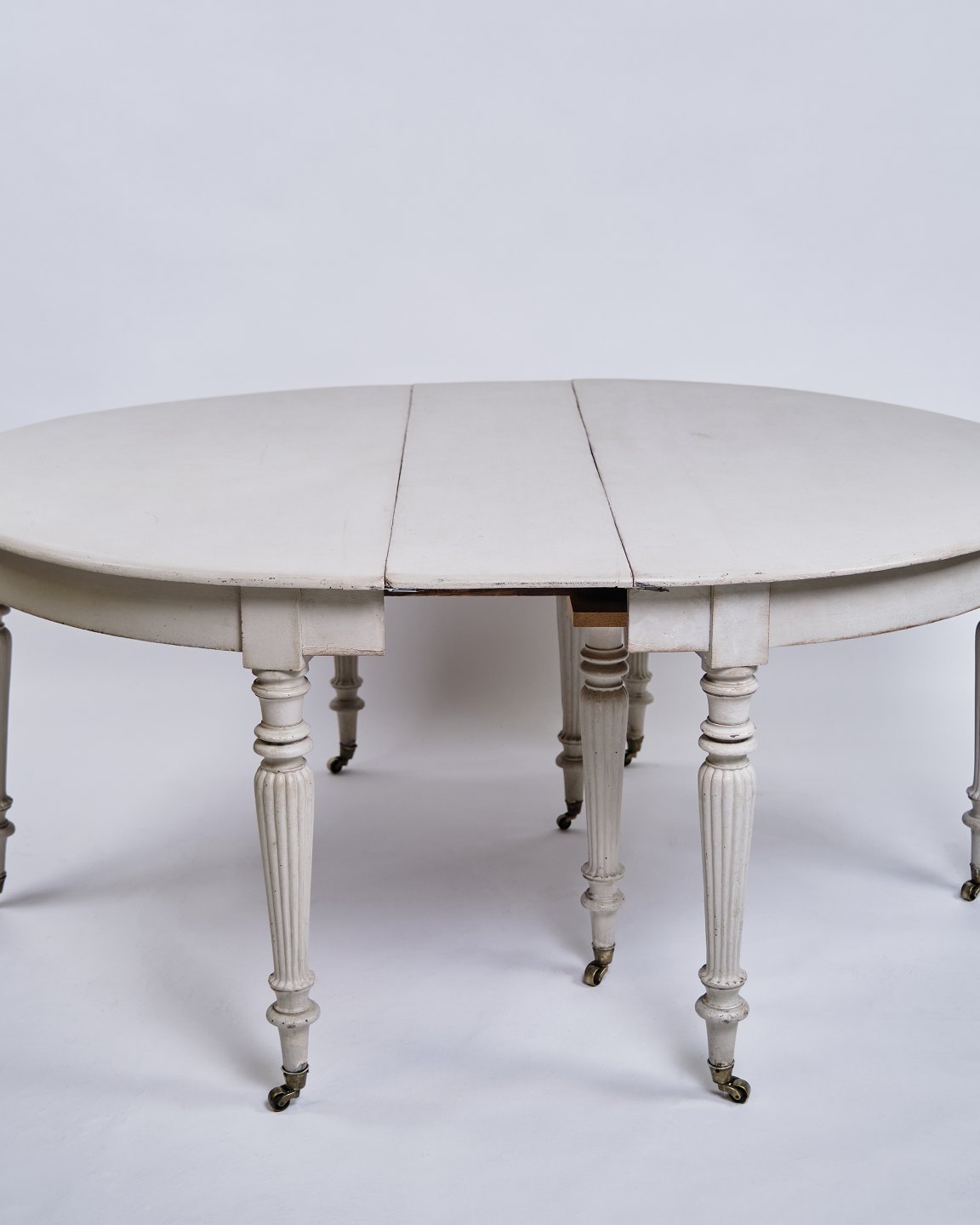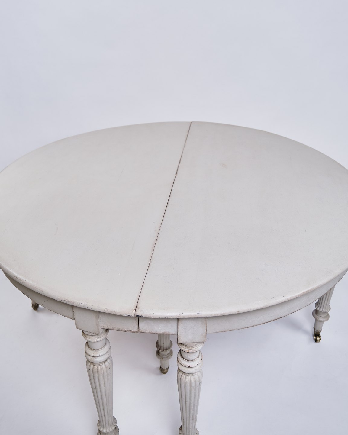 Gustaviansk rundt spisebord/månebord fra 1780’erne. Gråmalet med messinghjul. Med 1 plade á 30 cm og 4 á 60 cm.— Oprindelse: Europa (formodet Danmark)