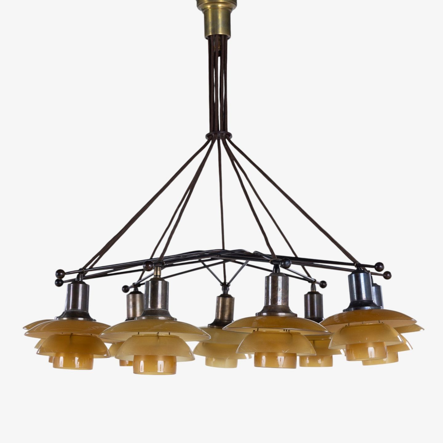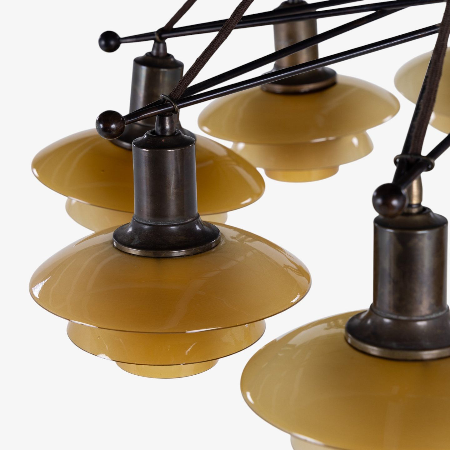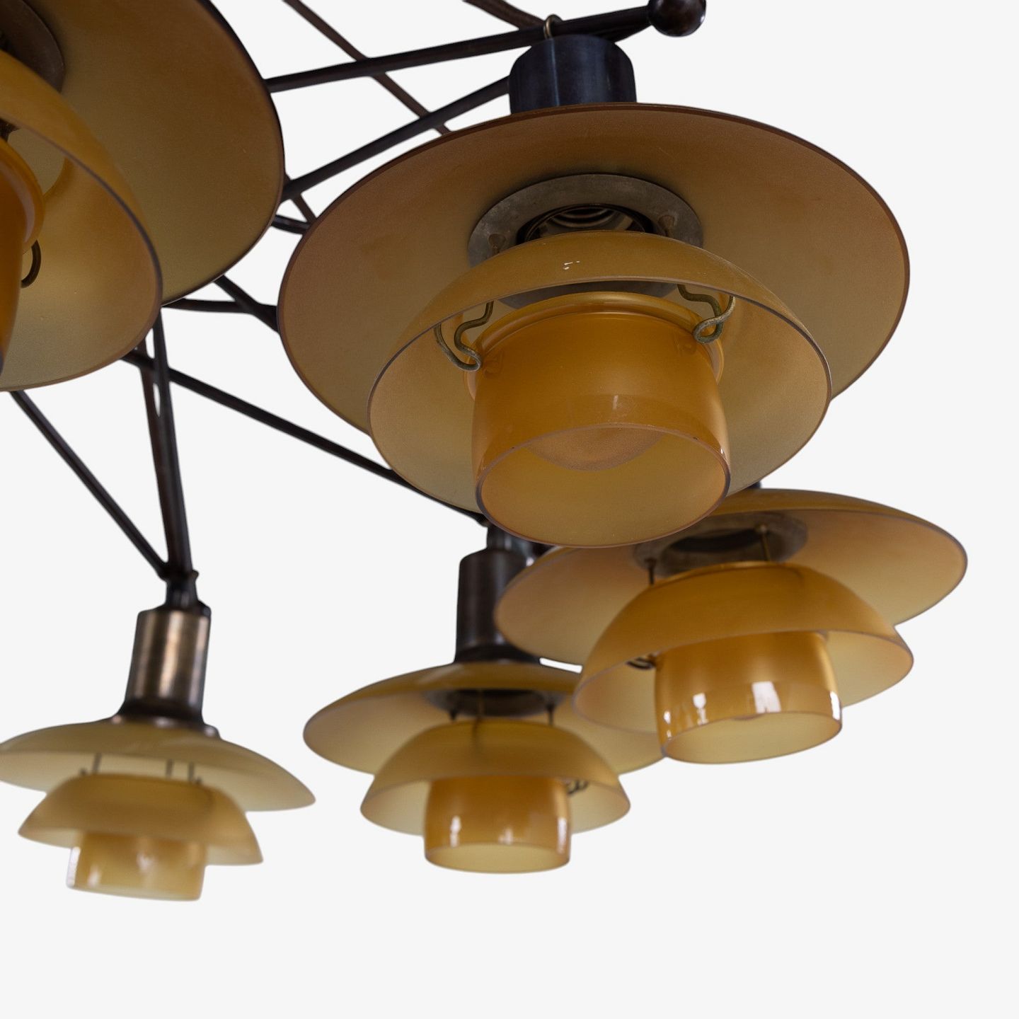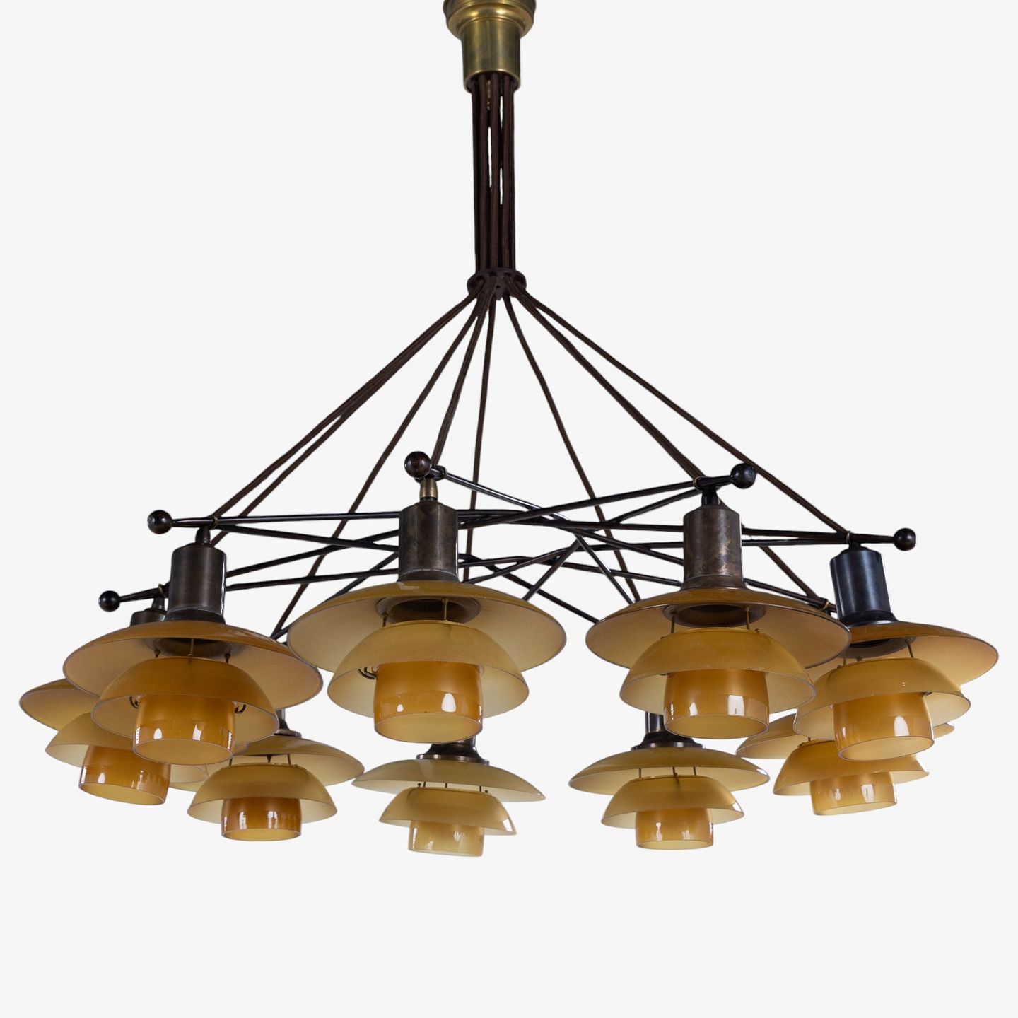 Poul Henningsen / Louis Poulsen.PH 2/2 - Sjælden 'Stjernekrone' i bruneret messing med skærme i ravfarvet glas. Stemplet 'Patented'.