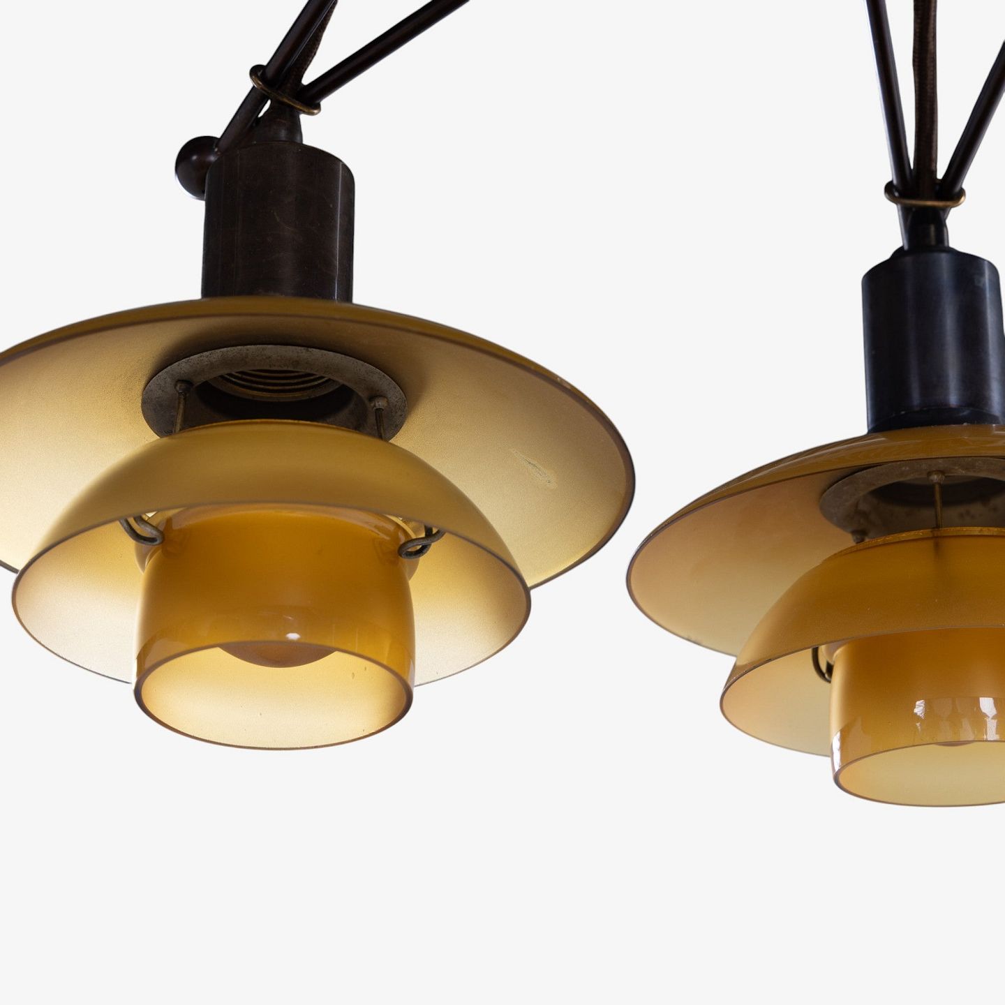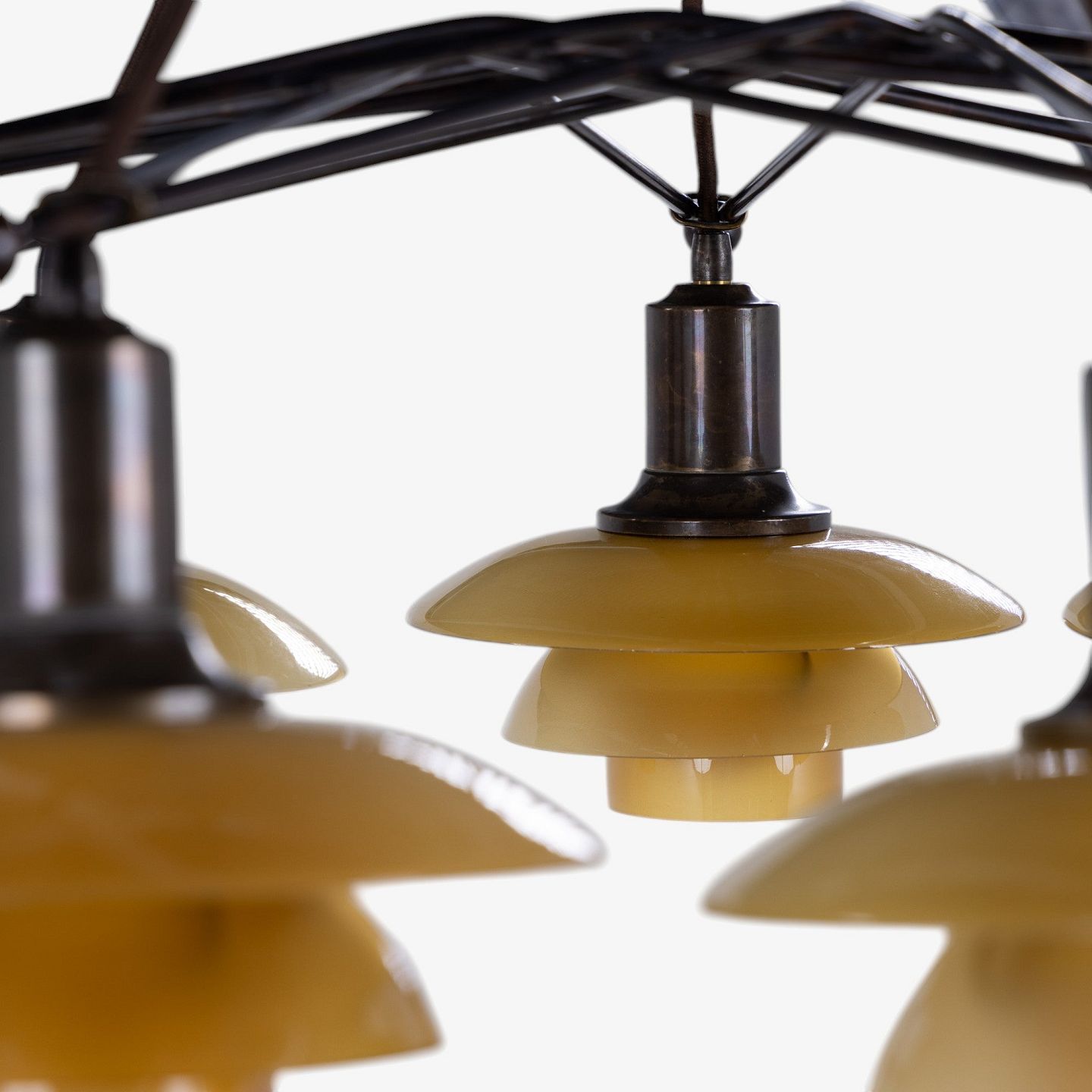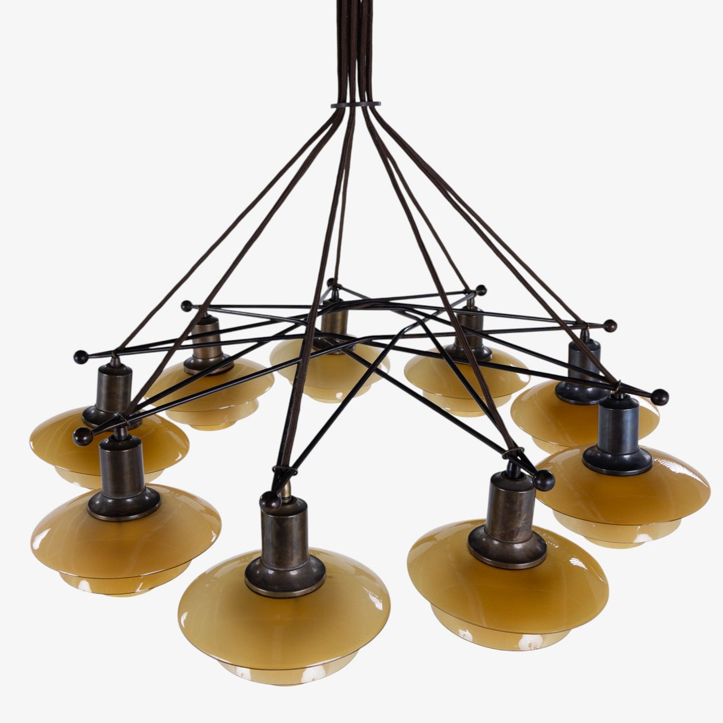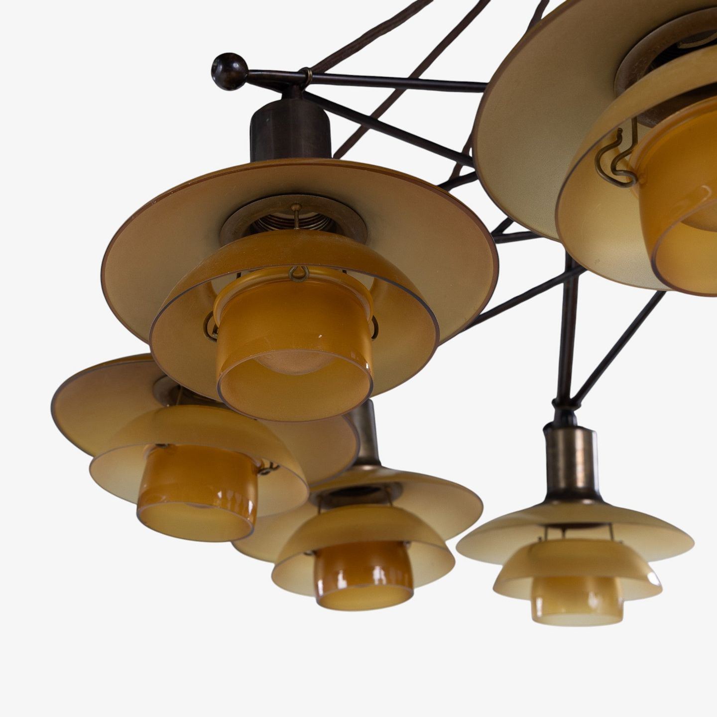 Poul Henningsen / Louis Poulsen.PH 2/2 - Sjælden 'Stjernekrone' i bruneret messing med skærme i ravfarvet glas. Stemplet 'Patented'.