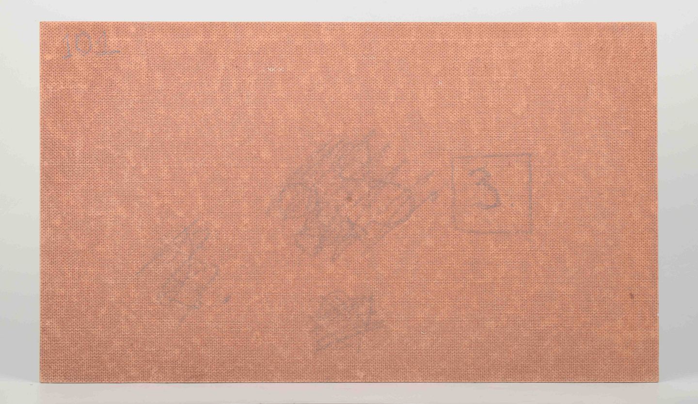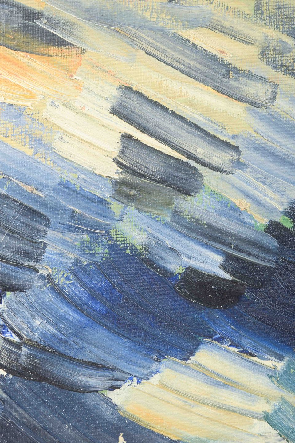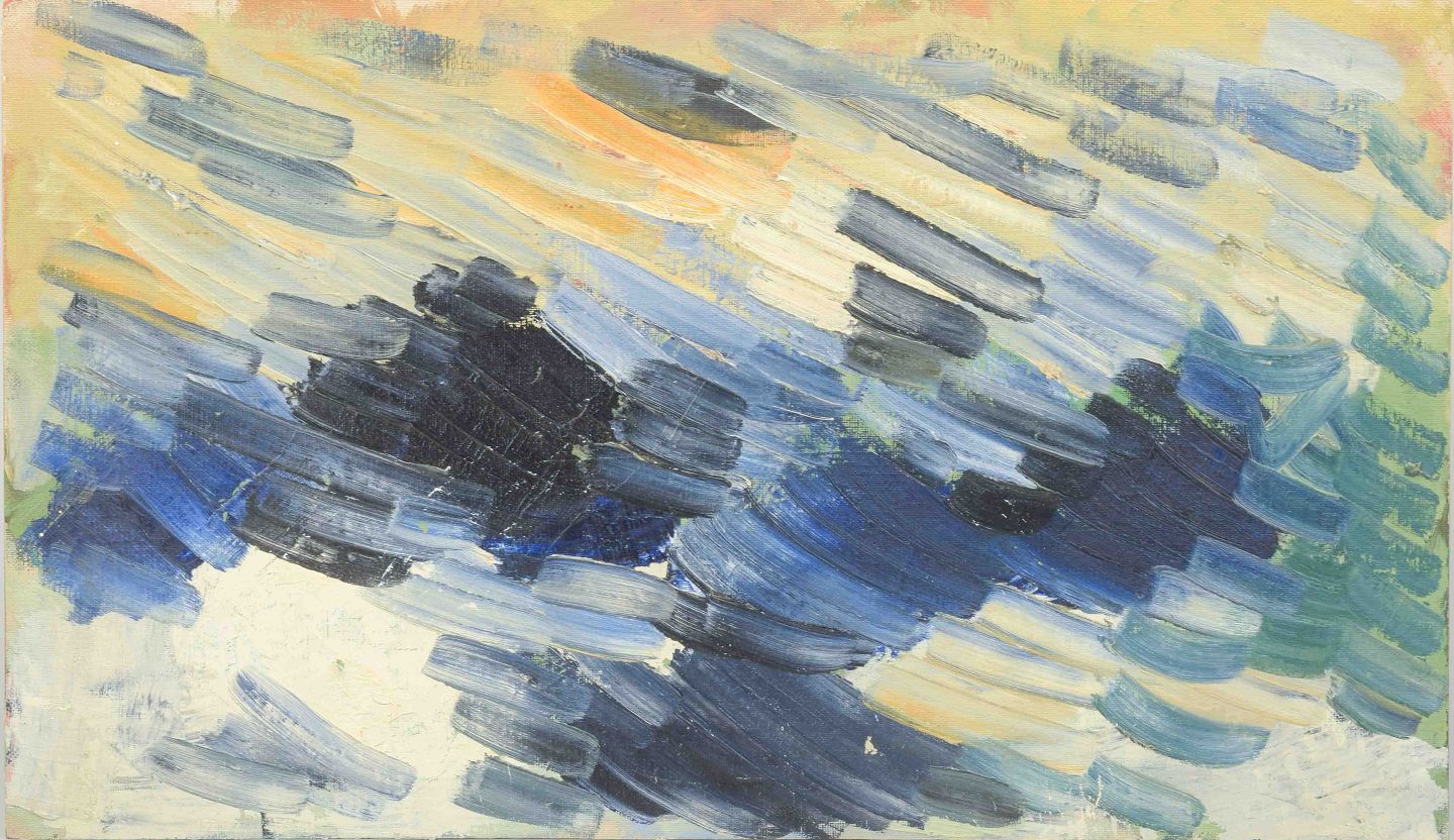 Et ekspressivt værk udført i brede, dynamiske penselstrøg i blå, sorte og lyse nuancer, der skaber en levende komposition med associationer til vand, himmel og bevægelse.