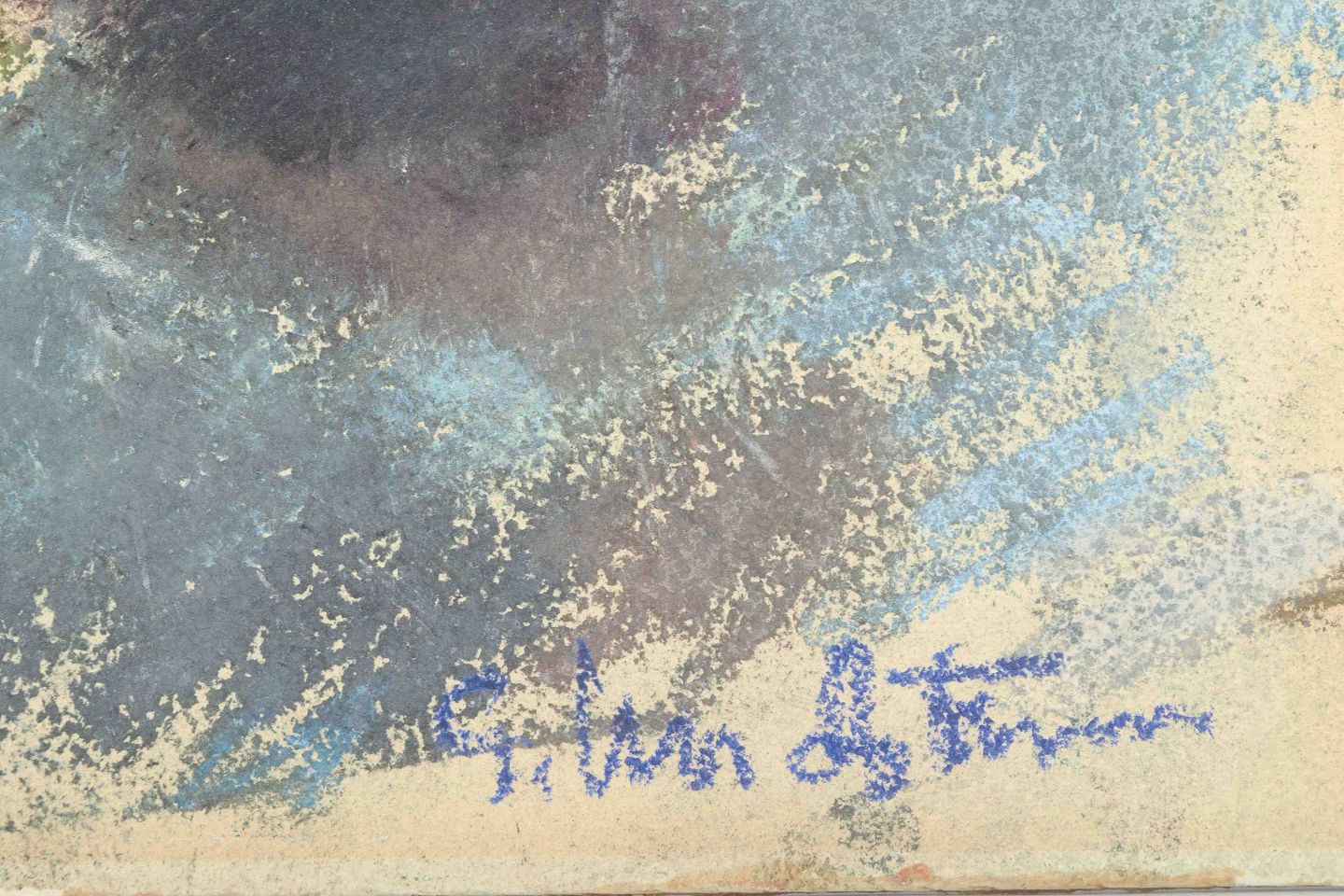 Et stemningsfuldt interiørmotiv udført i kridt/pastel, med dæmpede farvetoner og ekspressivt formsprog.
