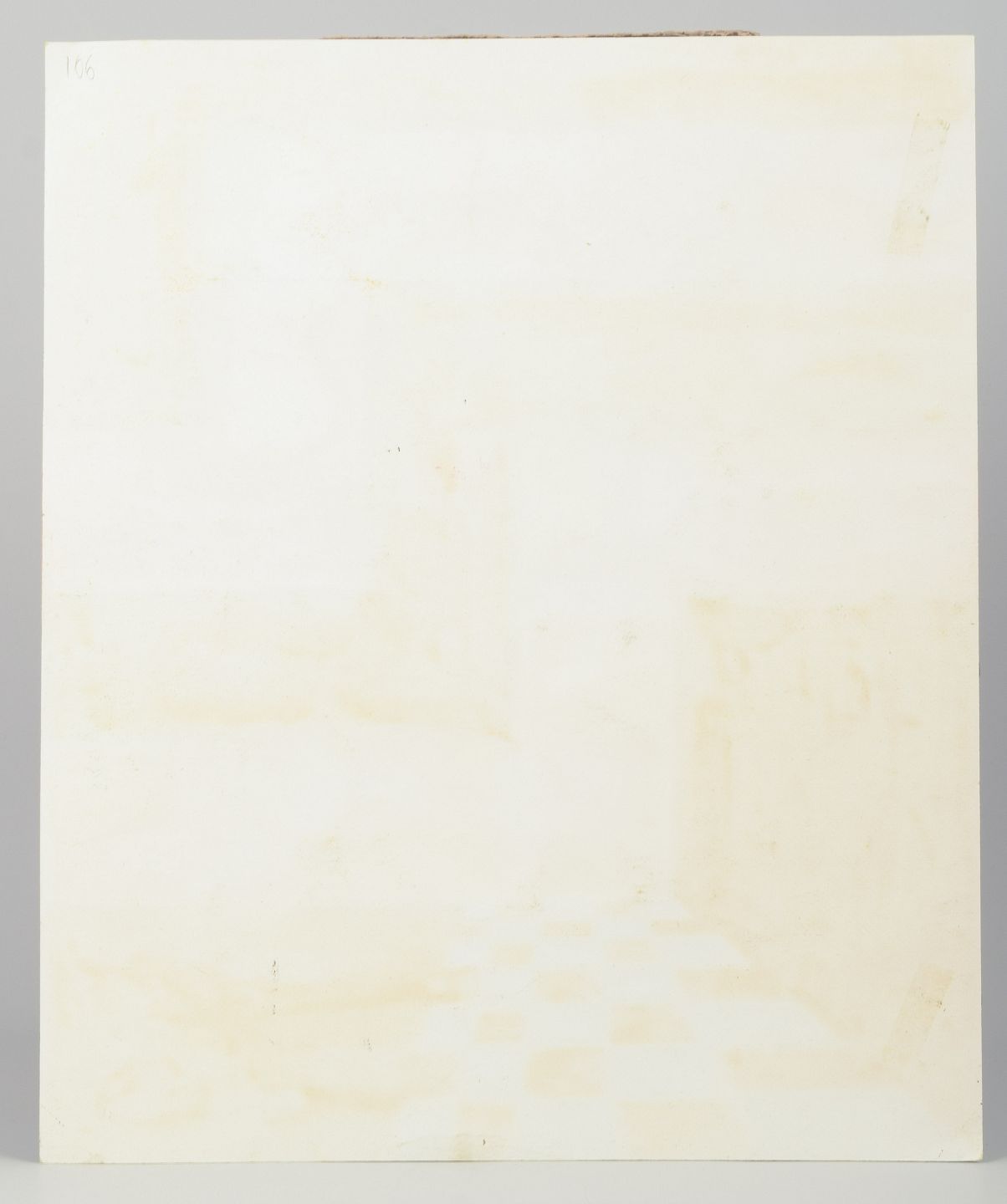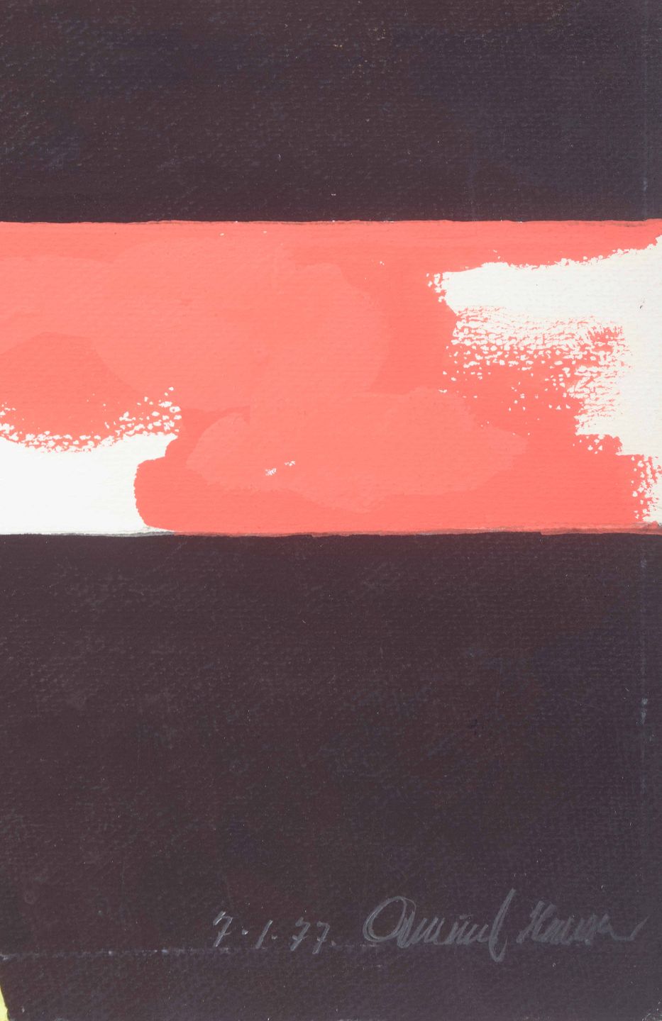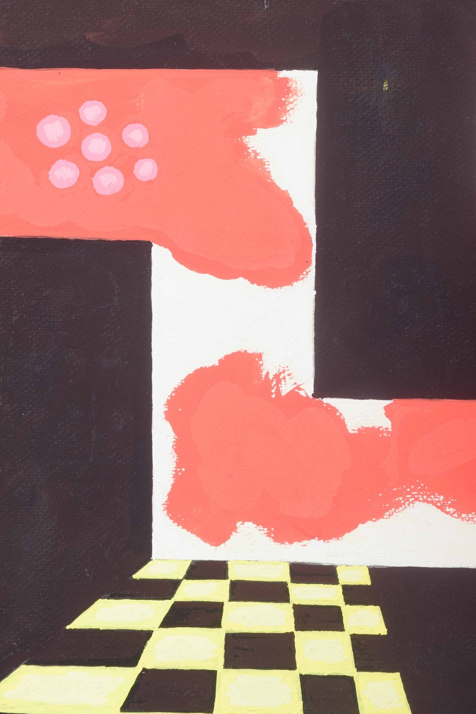 En geometrisk-abstrakt gouache af Osmund Hansen, hvor sort og rød danner kontrast til de gule skaktern i forgrunden. Værket er signeret og dateret 1977.