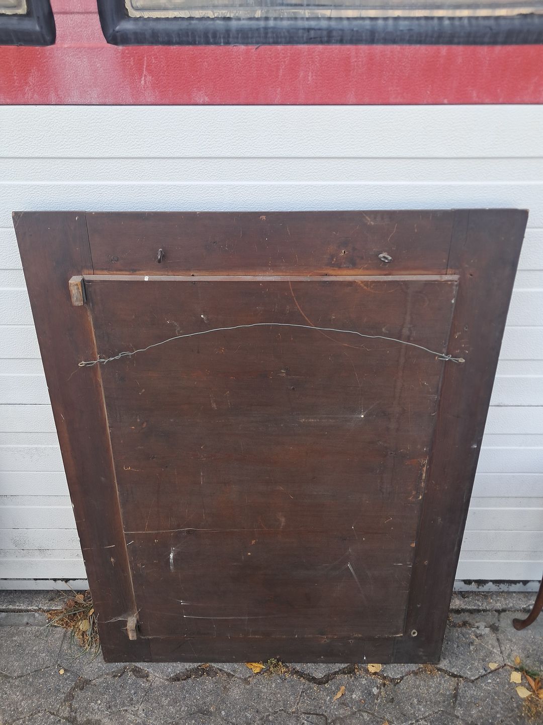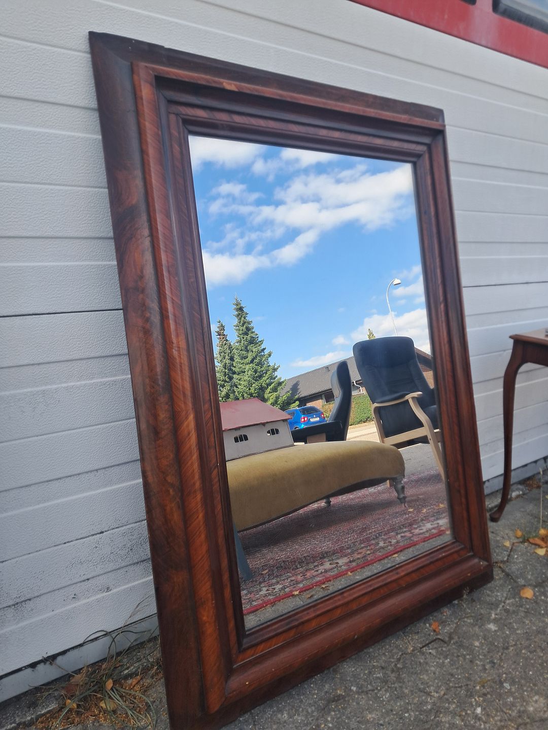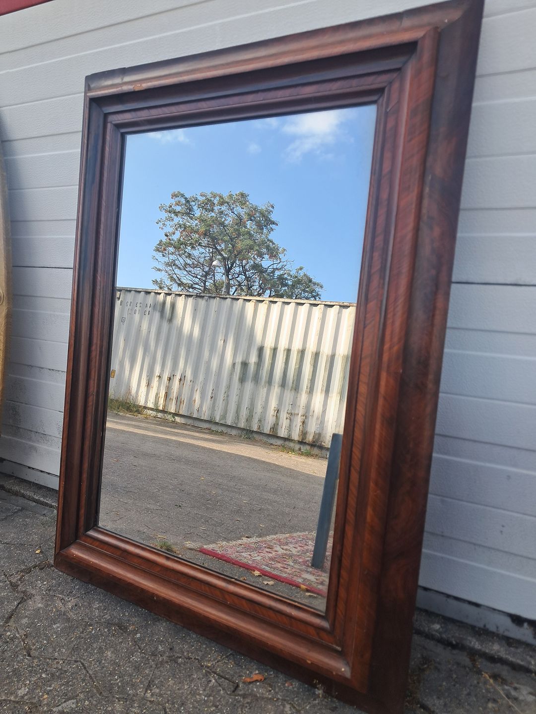 Spejl i fineret mahogni, fra 1900erne.Det har brugsspor.
